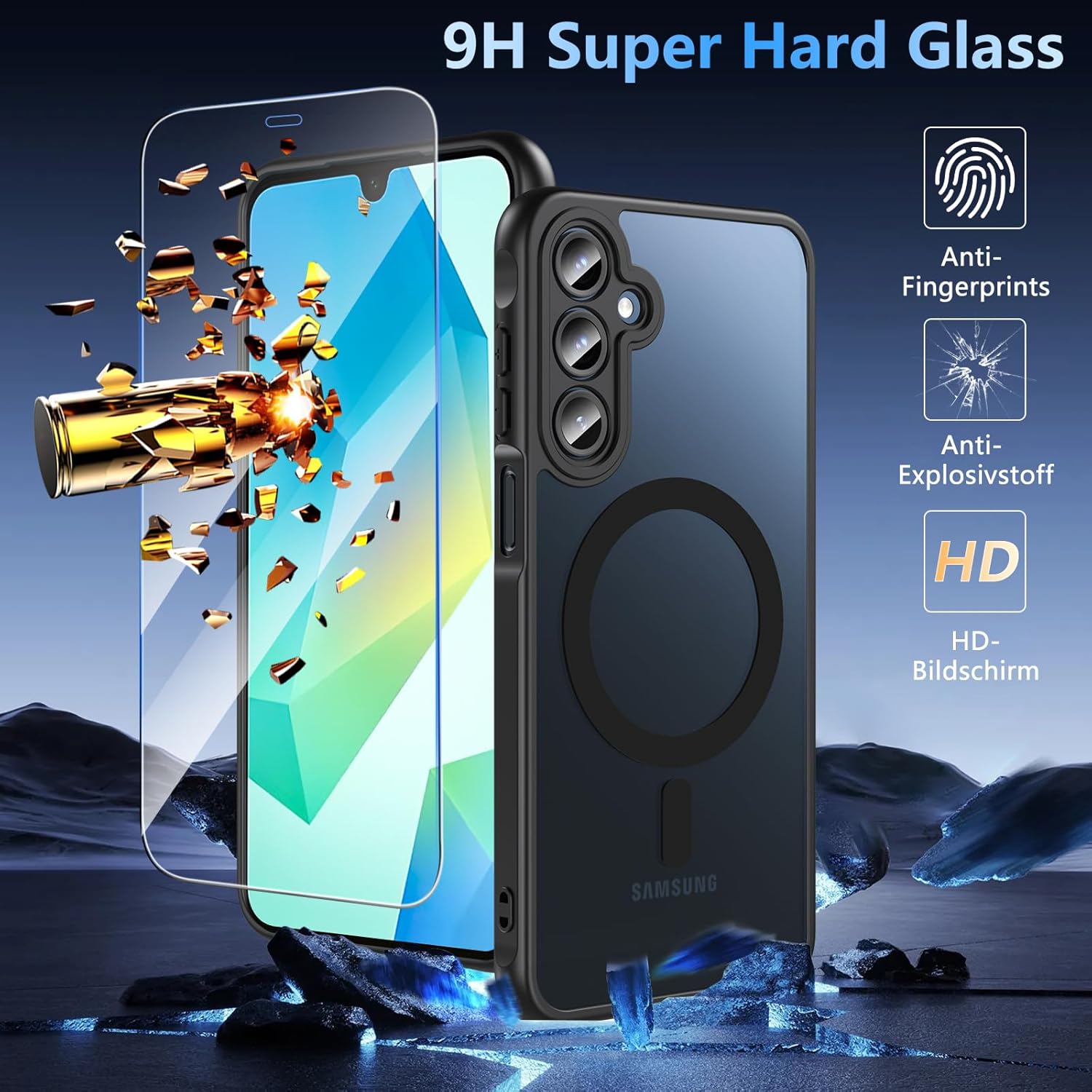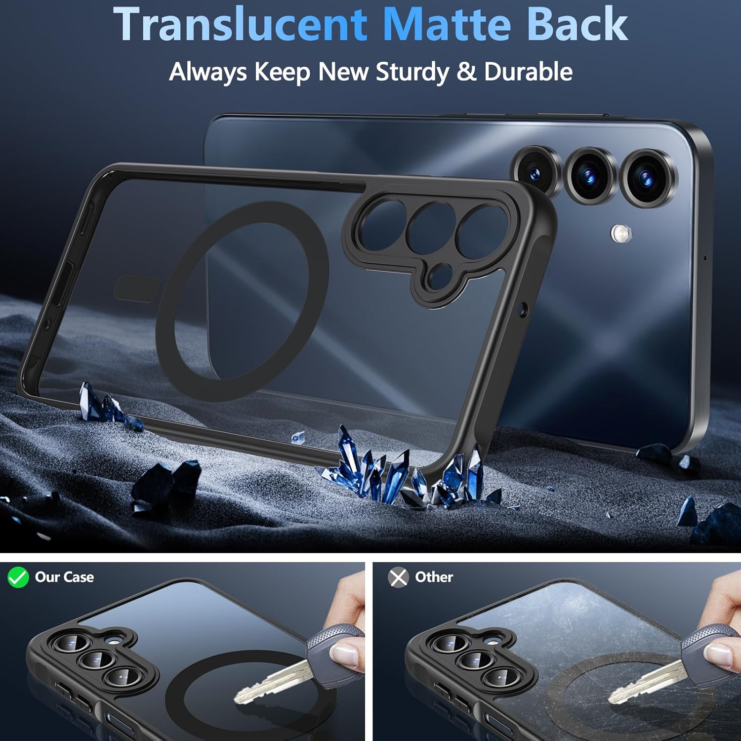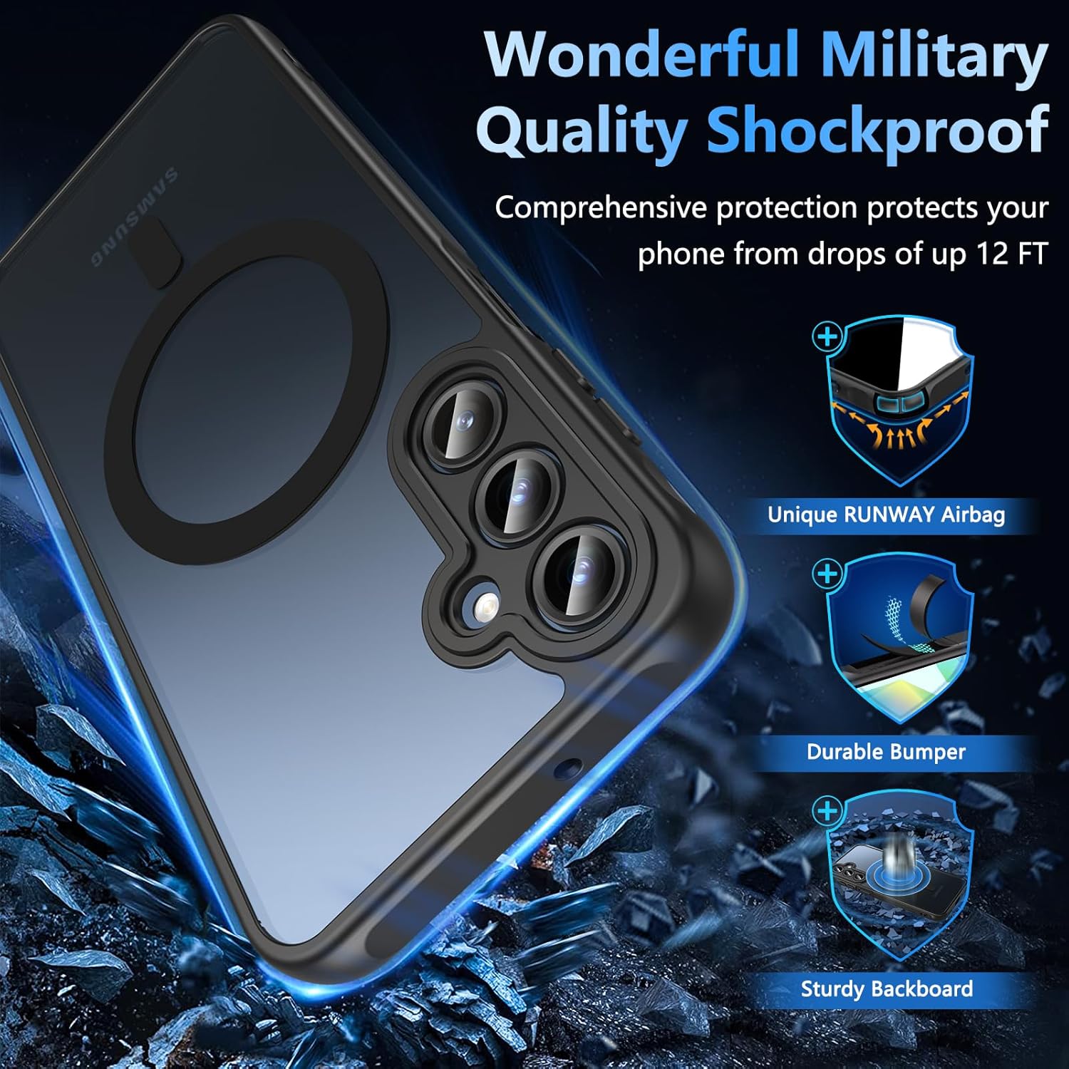 • Защита от военен клас: магнитен калъф за мобилен телефон Galaxy S25, полупрозрачната задна плоча е сертифицирана за тест за падане, има 4 вградени въздушни възглавници в ъглите за абсорбиране на удари, може да предпази вашия телефон Samsung Galaxy S25 от случайни падания, удари и драскотини.