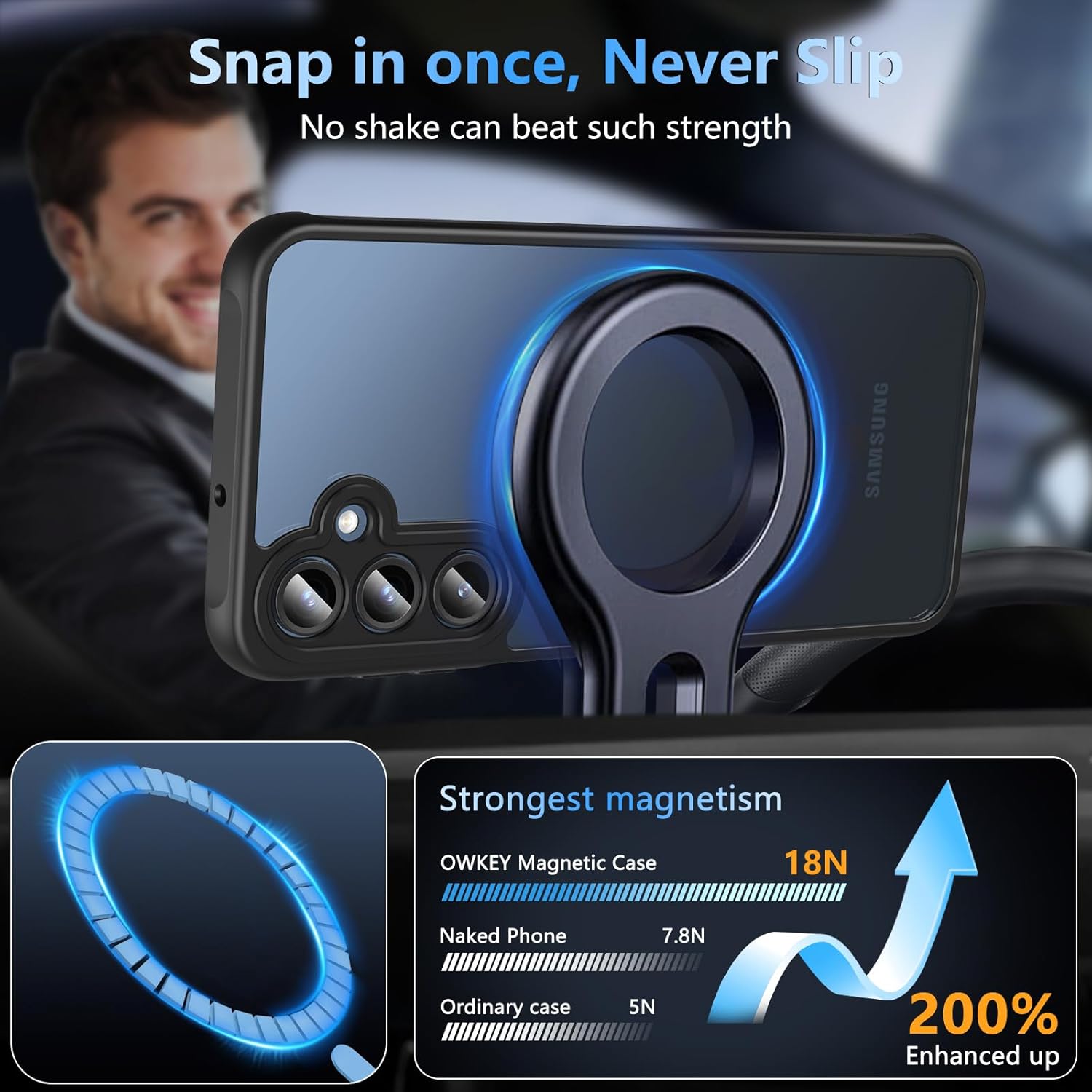 • [Супер магнитно привличане]: Този магнитен калъф за Samsung S25 5G подсилва магнитната връзка и осигурява автоматично подравняване с вграден магнитен пръстен N55. Калъфът се прикрепя добре към магнитни аксесоари като портфейли, стойки за кола и зарядни устройства.