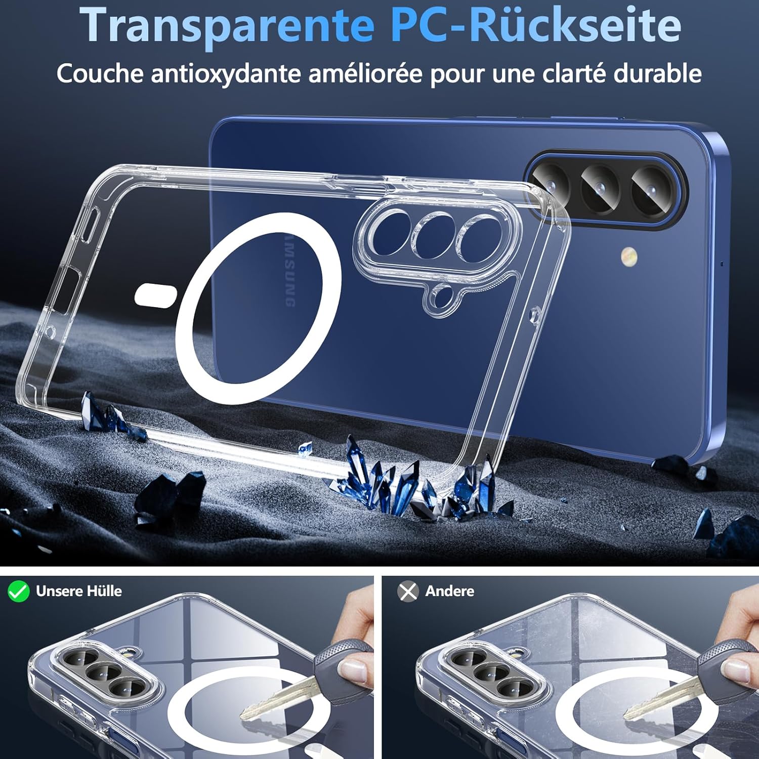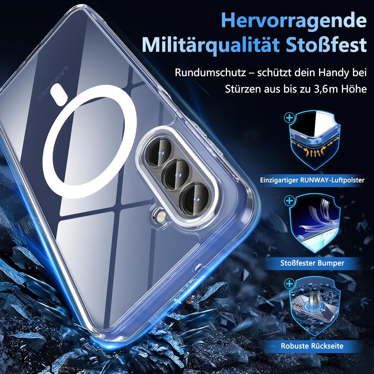 • Защита от военен клас: магнитен калъф за мобилен телефон Galaxy S25, полупрозрачната задна плоча е сертифицирана за тест за падане, има 4 вградени въздушни възглавници в ъглите за абсорбиране на удари, може да предпази вашия телефон Samsung Galaxy S25 от случайни падания, удари и драскотини.