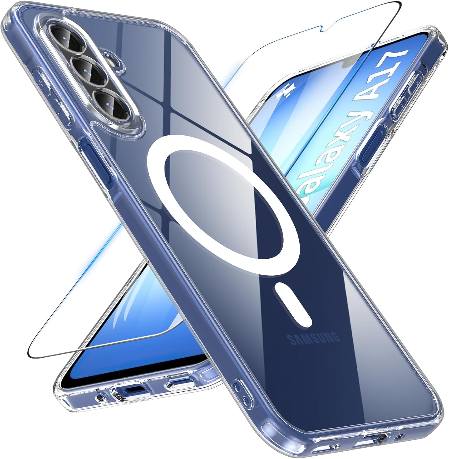 OWKEY калъф за Samsung Galaxy A17 5G, магнитен калъф за мобилен телефон за MagSafe със защитно стъкло, тънък военен защитен калъф за Samsung Galaxy A17 (прозрачен)