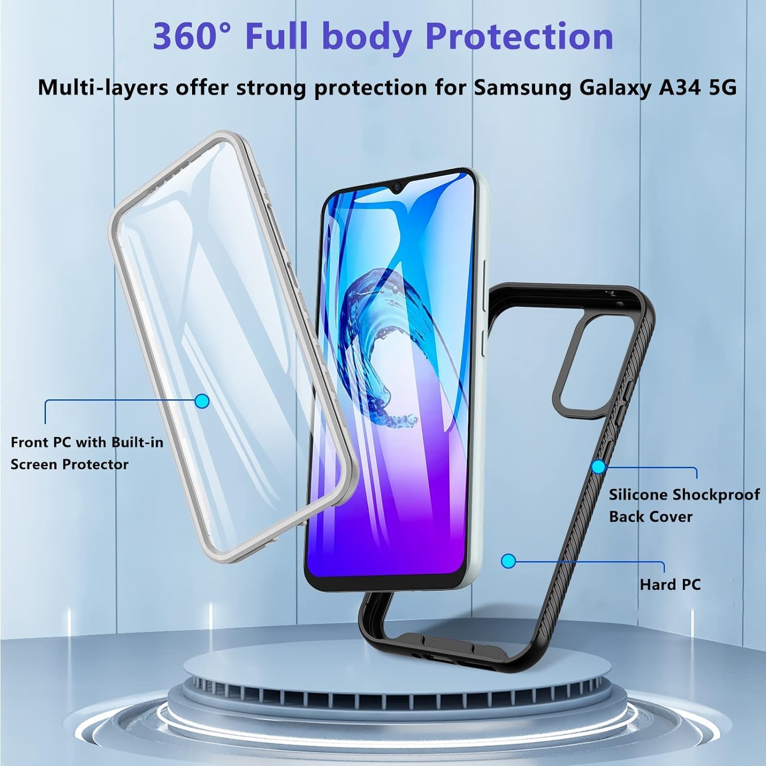 OWKEY калъф за Samsung Galaxy A34, удароустойчив силиконов калъф за мобилен телефон Samsung A34 5G, 360° всестранна защита, защитен калъф с вграден протектор за екрана, предпазващ калъф за Samsung Galaxy A34