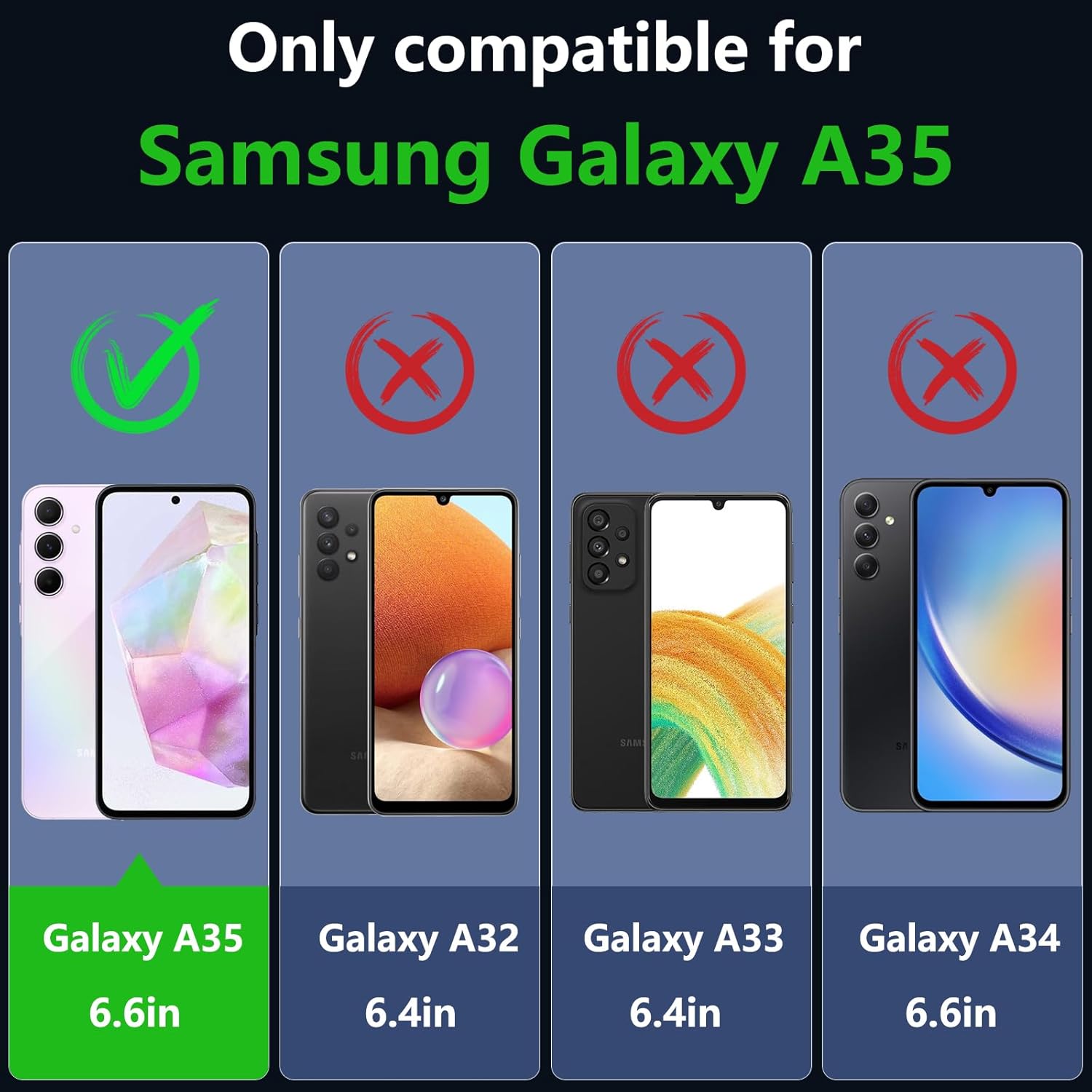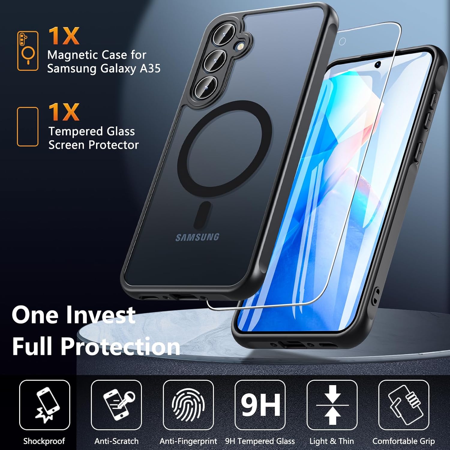 OWKEY калъф за Samsung Galaxy A35 5G, магнитен калъф за мобилен телефон Samsung A35 със защитно стъкло, тънък защитен калъф с военен дизайн за Samsung Galaxy A35 (черен)