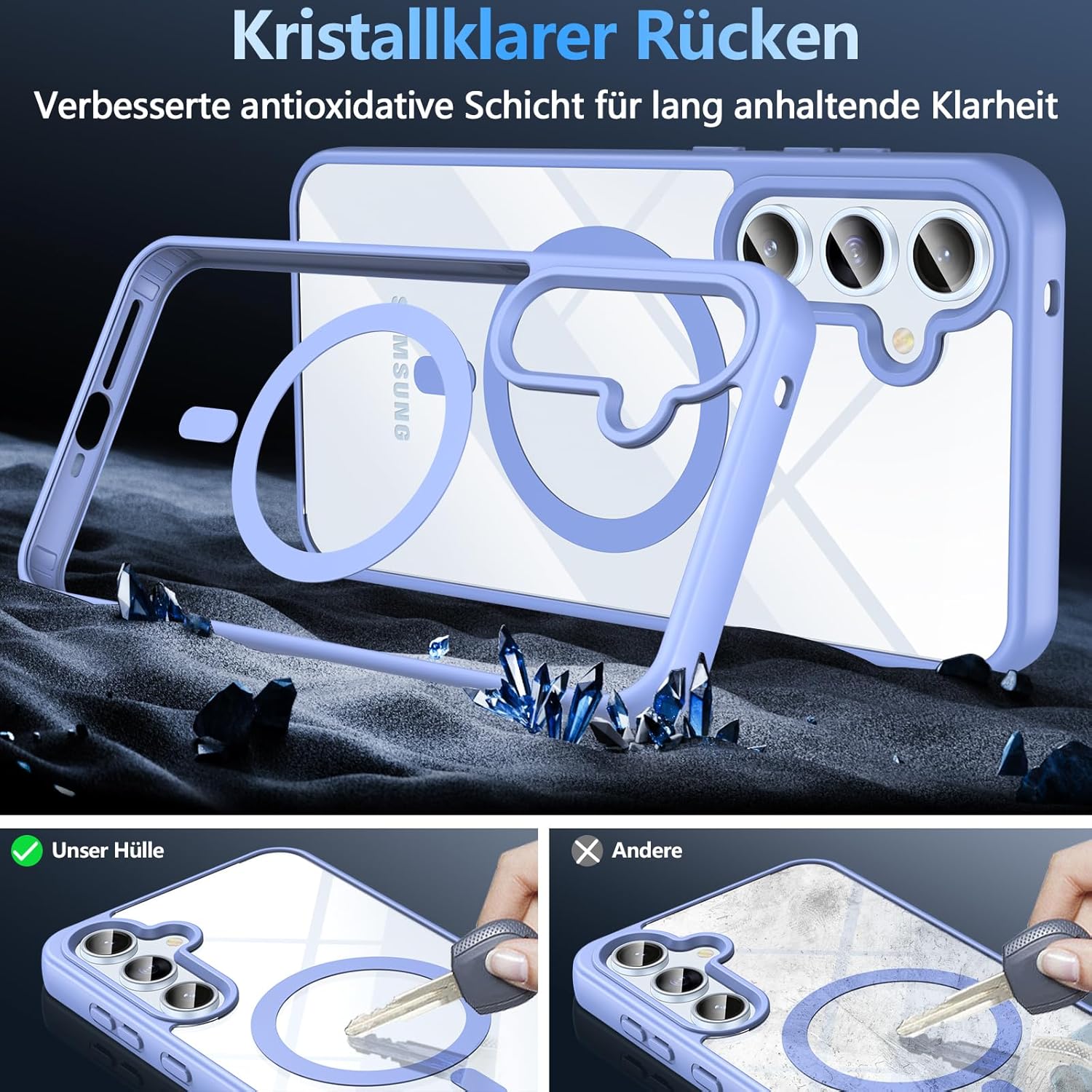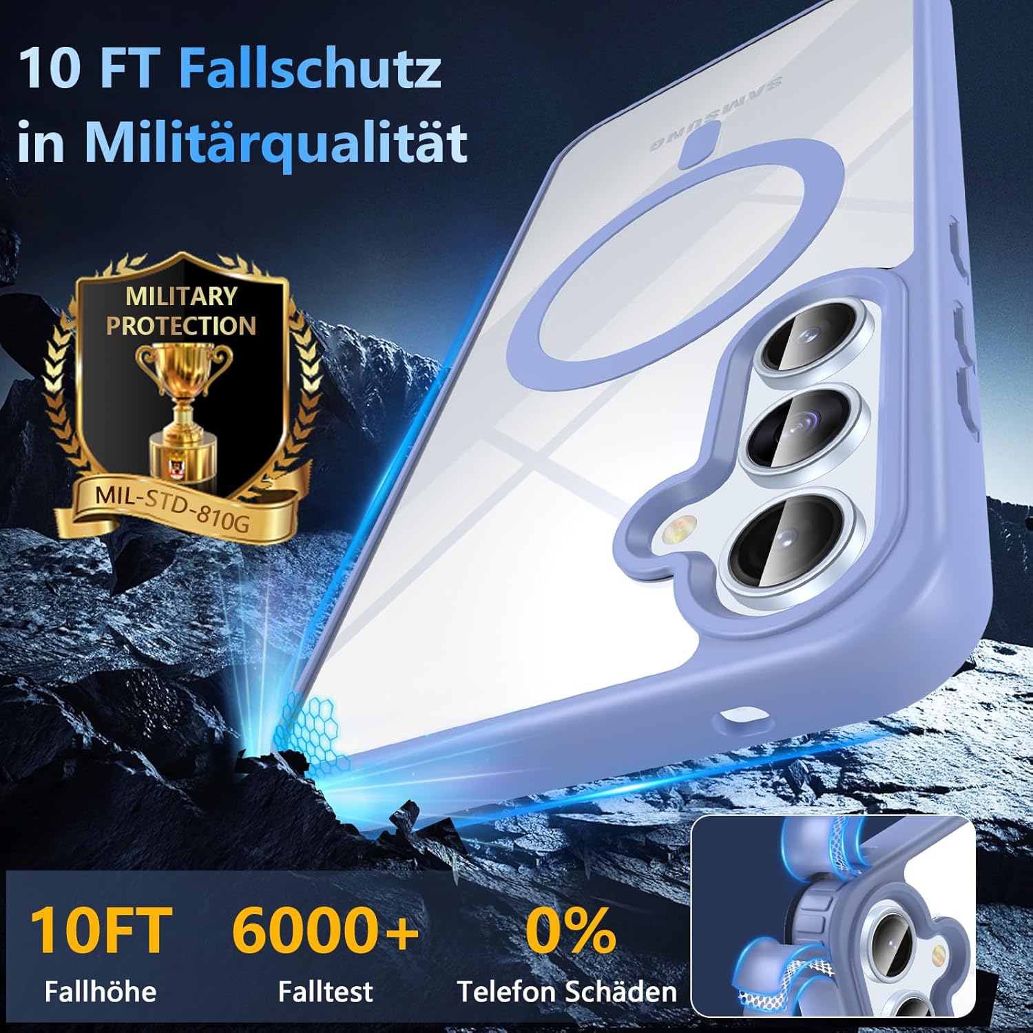 • Защита от военен клас: магнитен калъф за мобилен телефон Galaxy S25, полупрозрачната задна плоча е сертифицирана за тест за падане, има 4 вградени въздушни възглавници в ъглите за абсорбиране на удари, може да предпази вашия телефон Samsung Galaxy S25 от случайни падания, удари и драскотини.