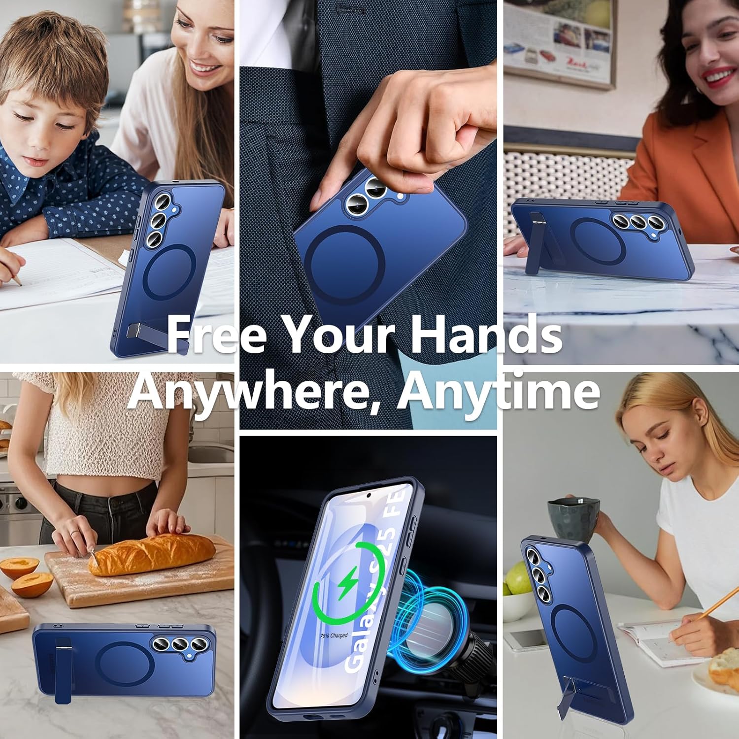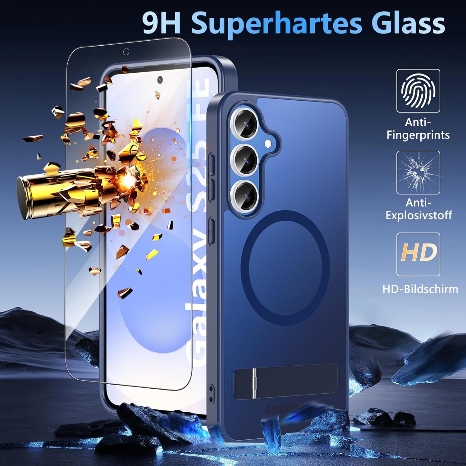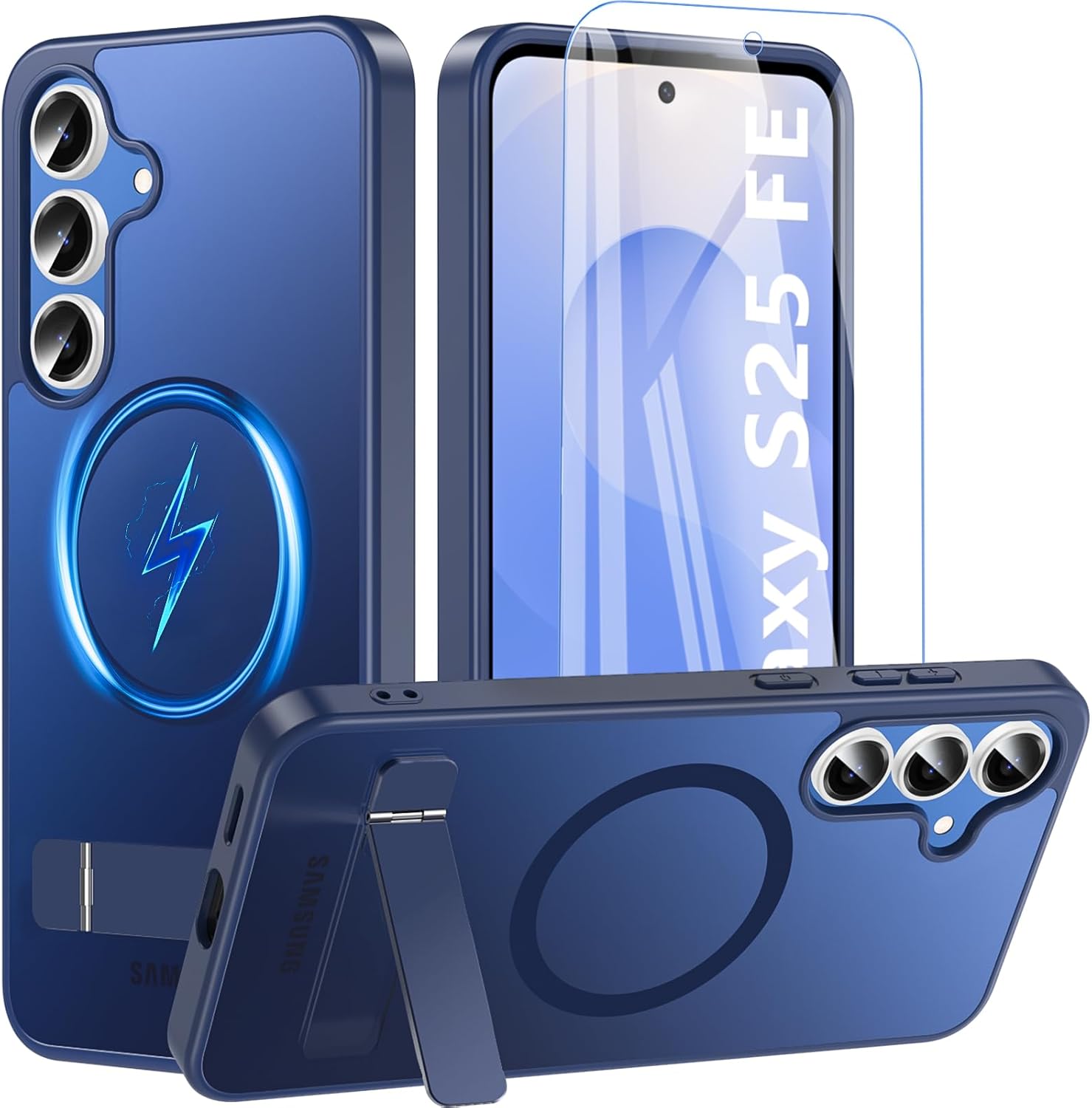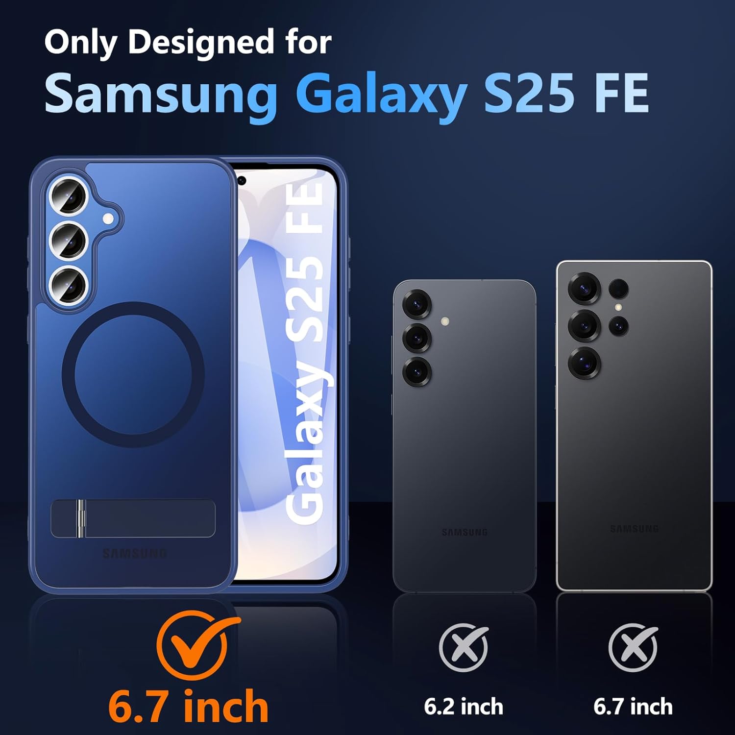 OWKEY Калъф за Samsung Galaxy S25 FE със стойка, съвместим с MagSafe, магнитен калъф за мобилен телефон за Samsung S25 FE със закалено стъкло, военно качество, удароустойчив прозрачен матов