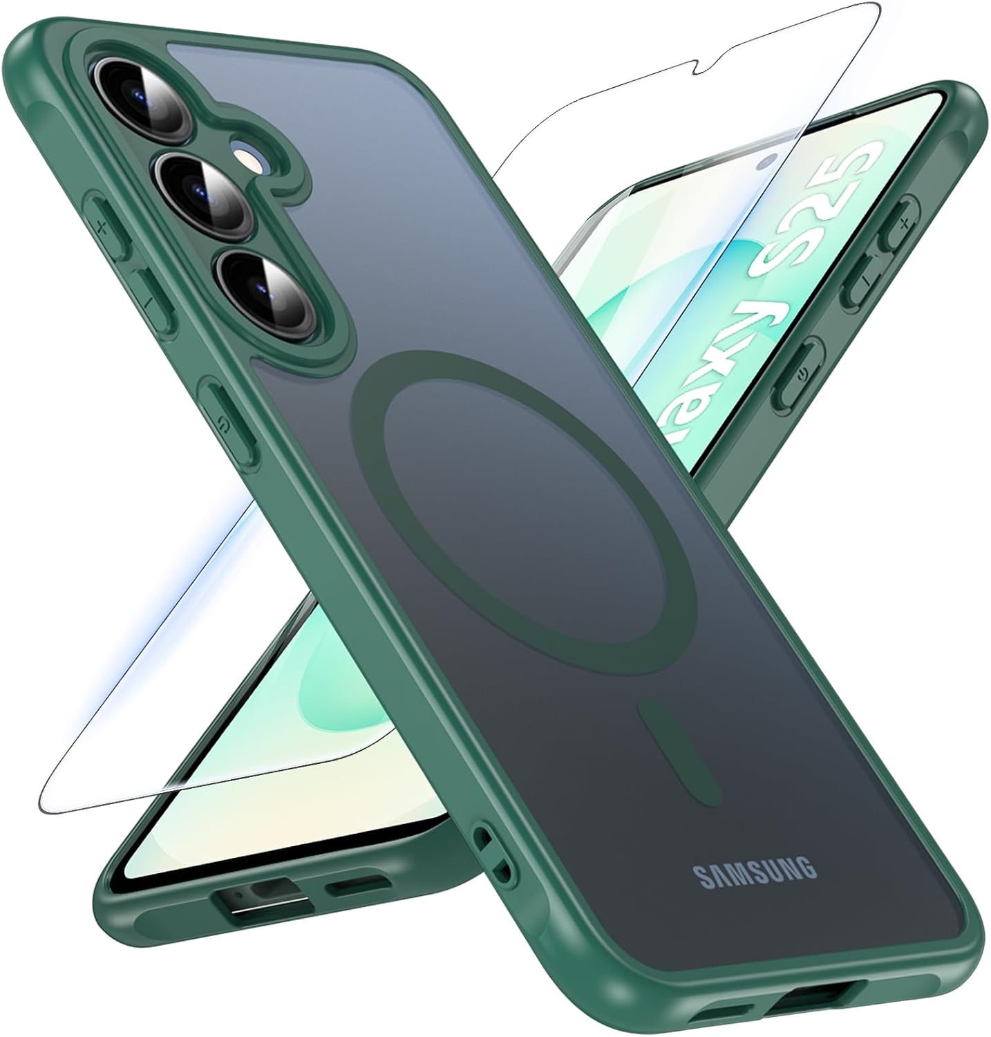 OWKEY калъф за Samsung Galaxy S25, магнитен калъф за мобилен телефон Samsung S25 за MagSafe със защитно стъкло, тънък военен защитен калъф за Samsung S25 (зелен)
