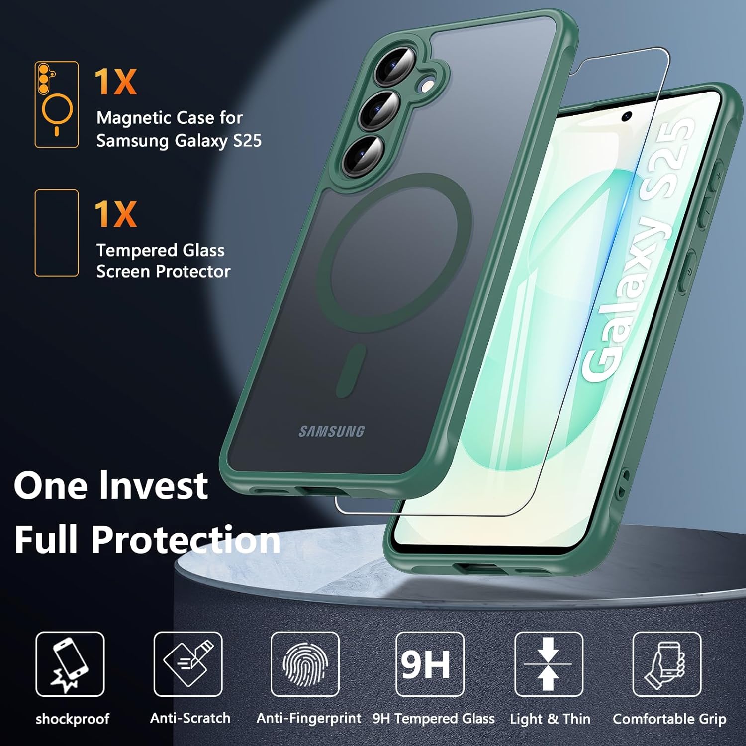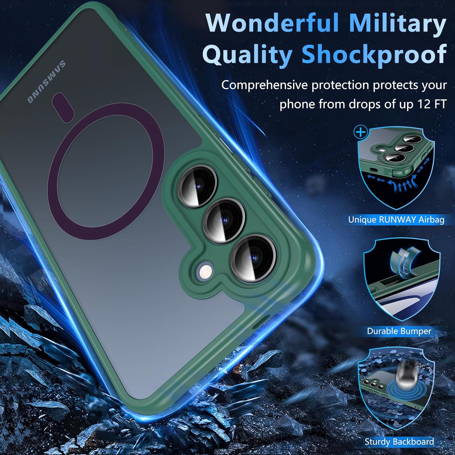 • Защита от военен клас: магнитен калъф за мобилен телефон Galaxy S25, полупрозрачната задна плоча е сертифицирана за тест за падане, има 4 вградени въздушни възглавници в ъглите за абсорбиране на удари, може да предпази вашия телефон Samsung Galaxy S25 от случайни падания, удари и драскотини.