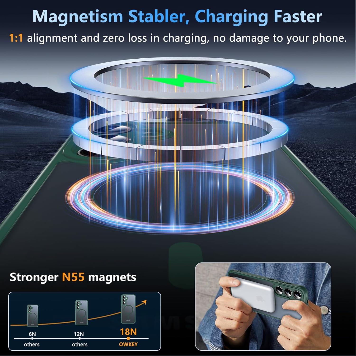 • [Супер магнитно привличане]: Този магнитен калъф за Samsung S25 5G подсилва магнитната връзка и осигурява автоматично подравняване с вграден магнитен пръстен N55. Калъфът се прикрепя добре към магнитни аксесоари като портфейли, стойки за кола и зарядни устройства.