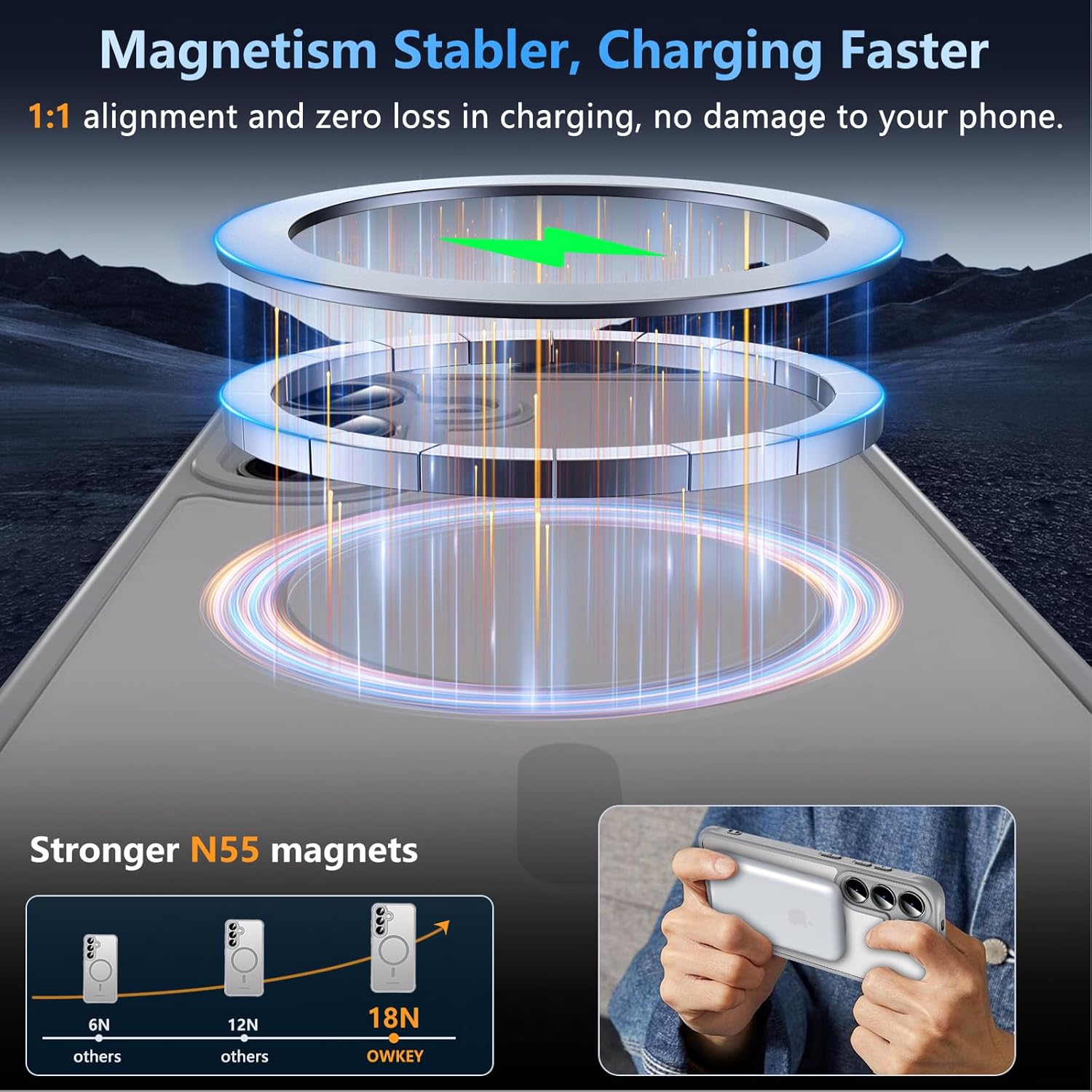 • [Супер магнитно привличане]: Този магнитен калъф за Samsung S25 5G подсилва магнитната връзка и осигурява автоматично подравняване с вграден магнитен пръстен N55. Калъфът се прикрепя добре към магнитни аксесоари като портфейли, стойки за кола и зарядни устройства.