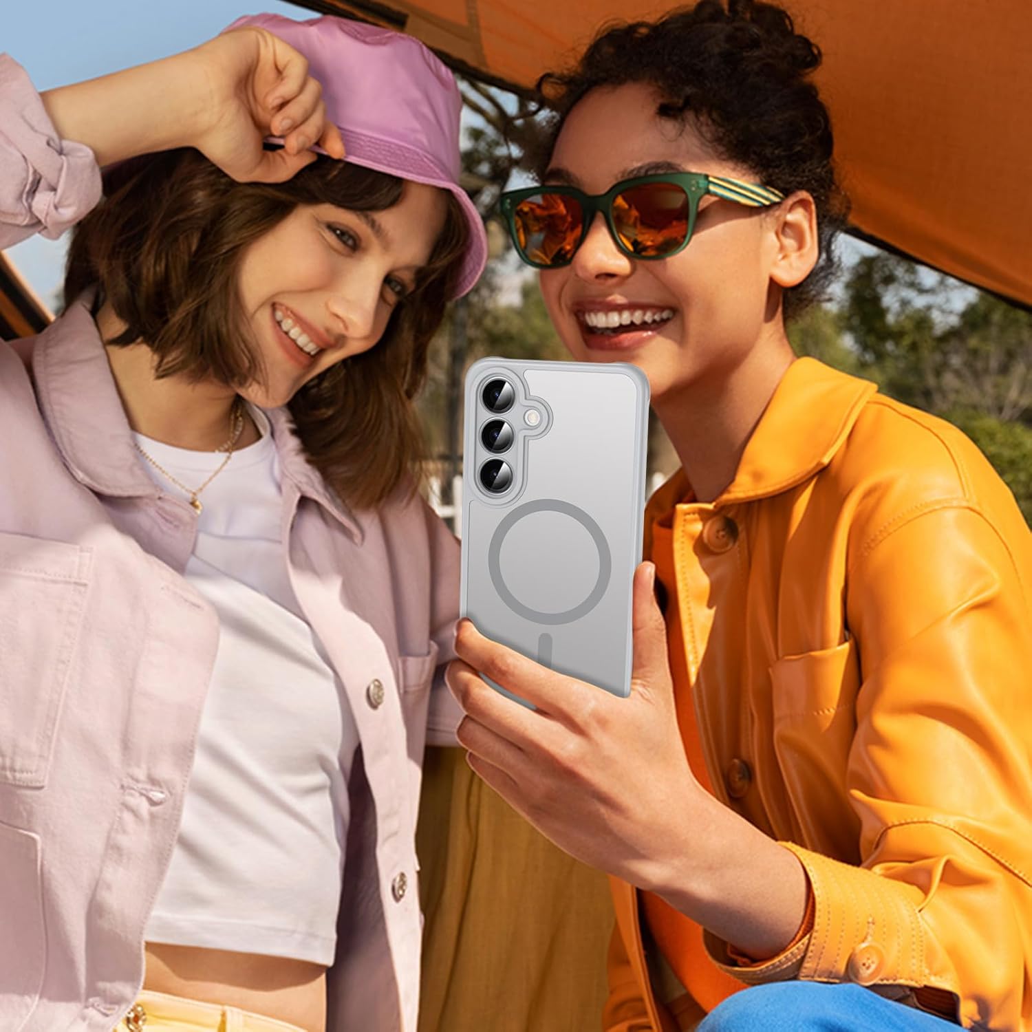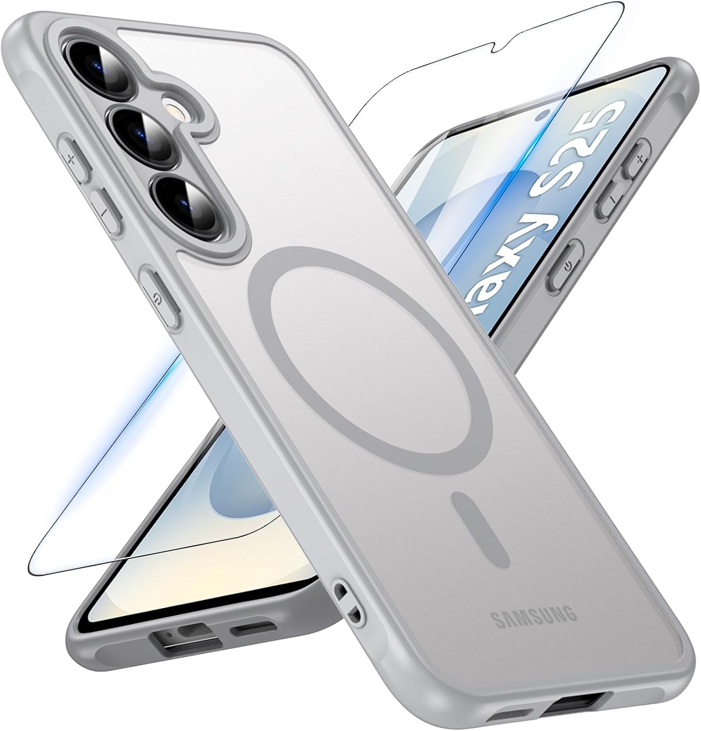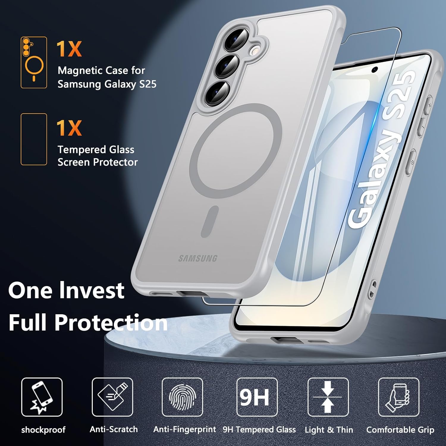 OWKEY калъф за Samsung Galaxy S25, магнитен калъф за мобилен телефон Samsung S25 за MagSafe със защитно стъкло, тънък защитен калъф с военна защита за Samsung Galaxy S25 (сив)
