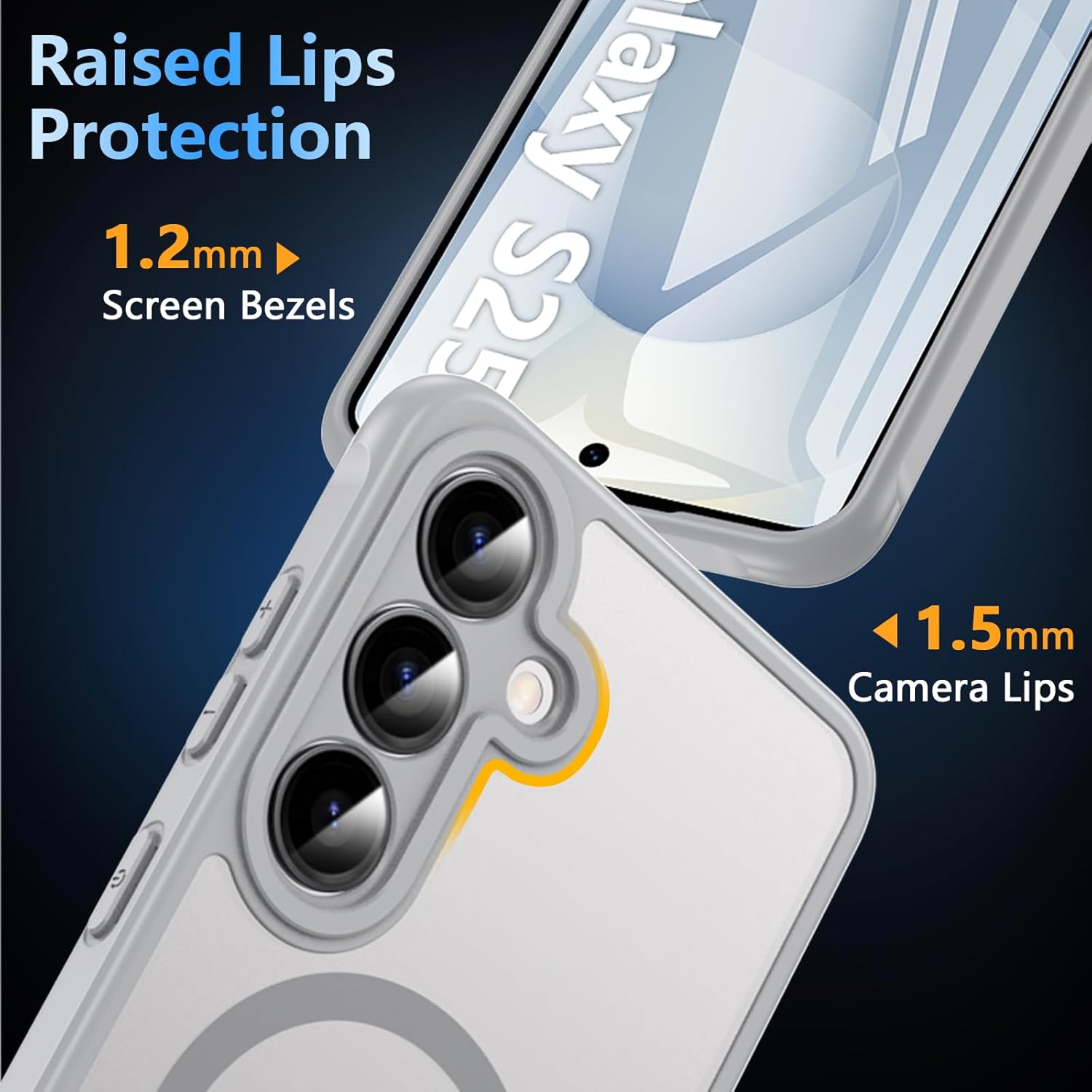 • Защита от военен клас: магнитен калъф за мобилен телефон Galaxy S25, полупрозрачната задна плоча е сертифицирана за тест за падане, има 4 вградени въздушни възглавници в ъглите за абсорбиране на удари, може да предпази вашия телефон Samsung Galaxy S25 от случайни падания, удари и драскотини.
