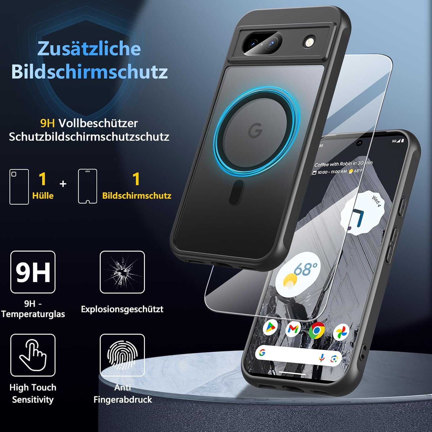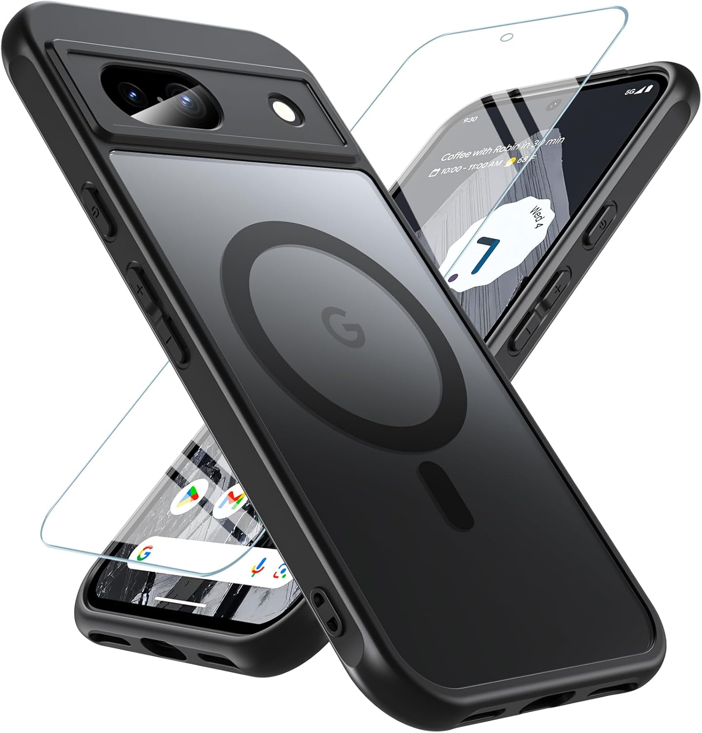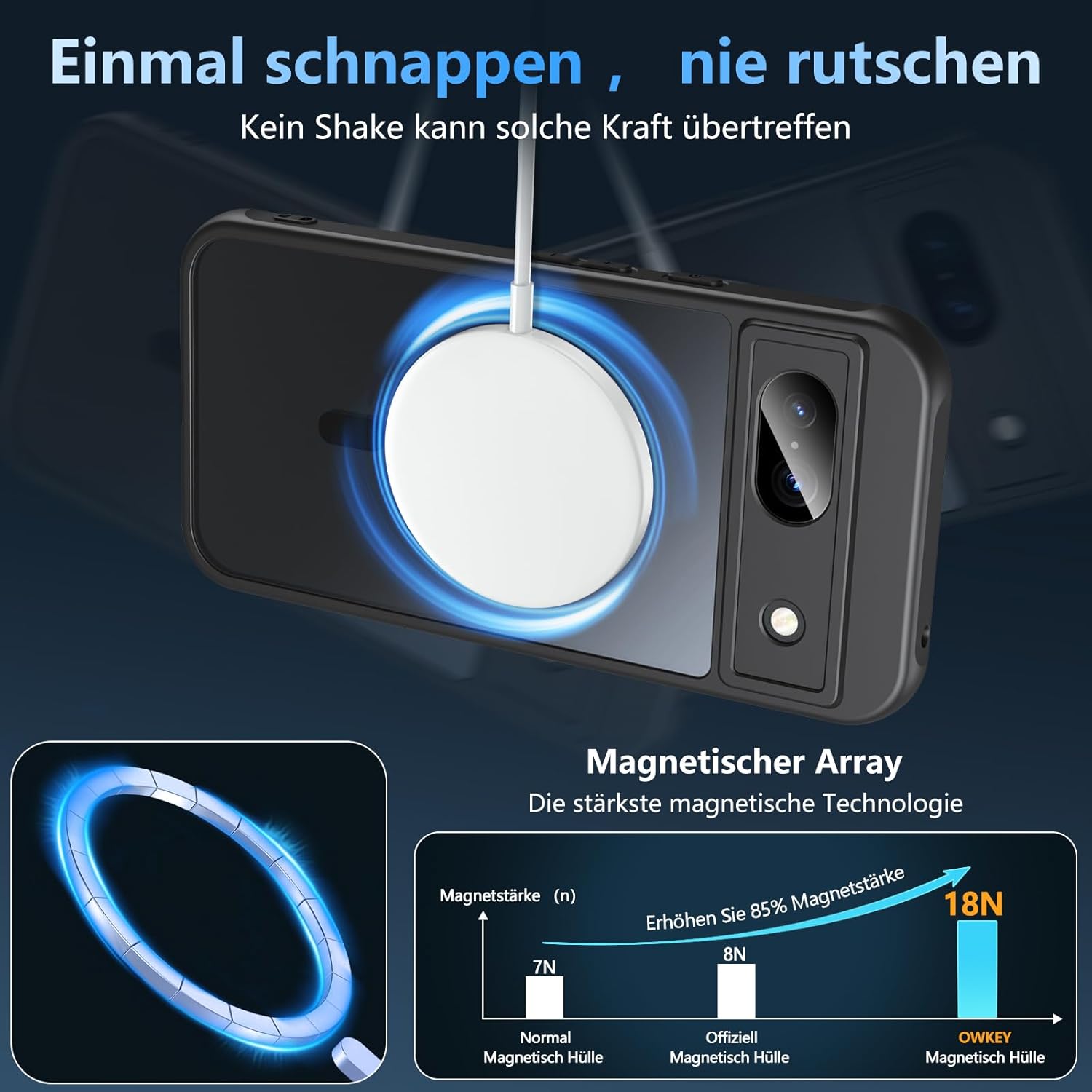 OWKEY Кейс за Google Pixel 8A 5G, Магнитен калъф за мобилен телефон Google Pixel 8A за MagSafe със защитно стъкло, тънък военен защитен калъф за Google Pixel 8A (черен)