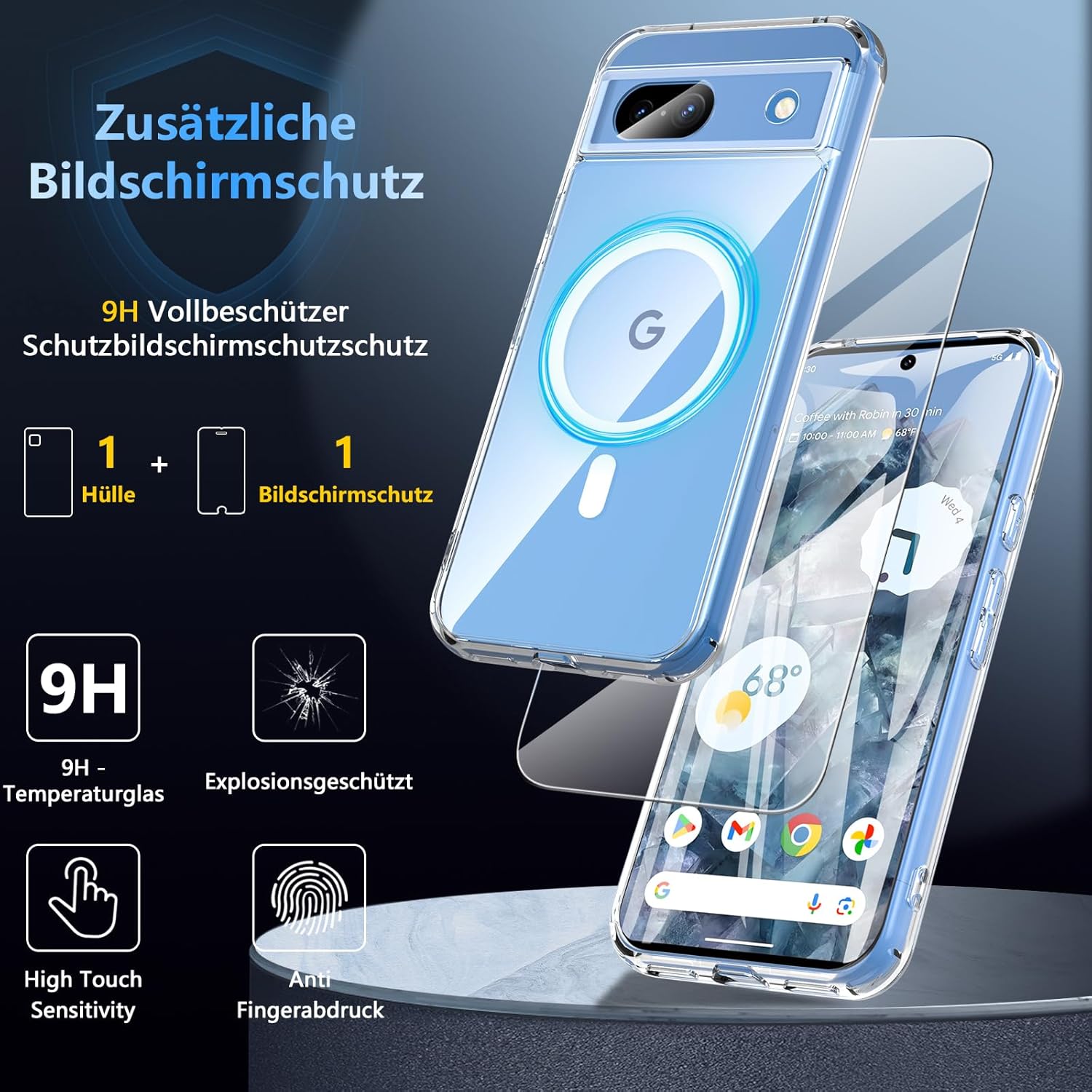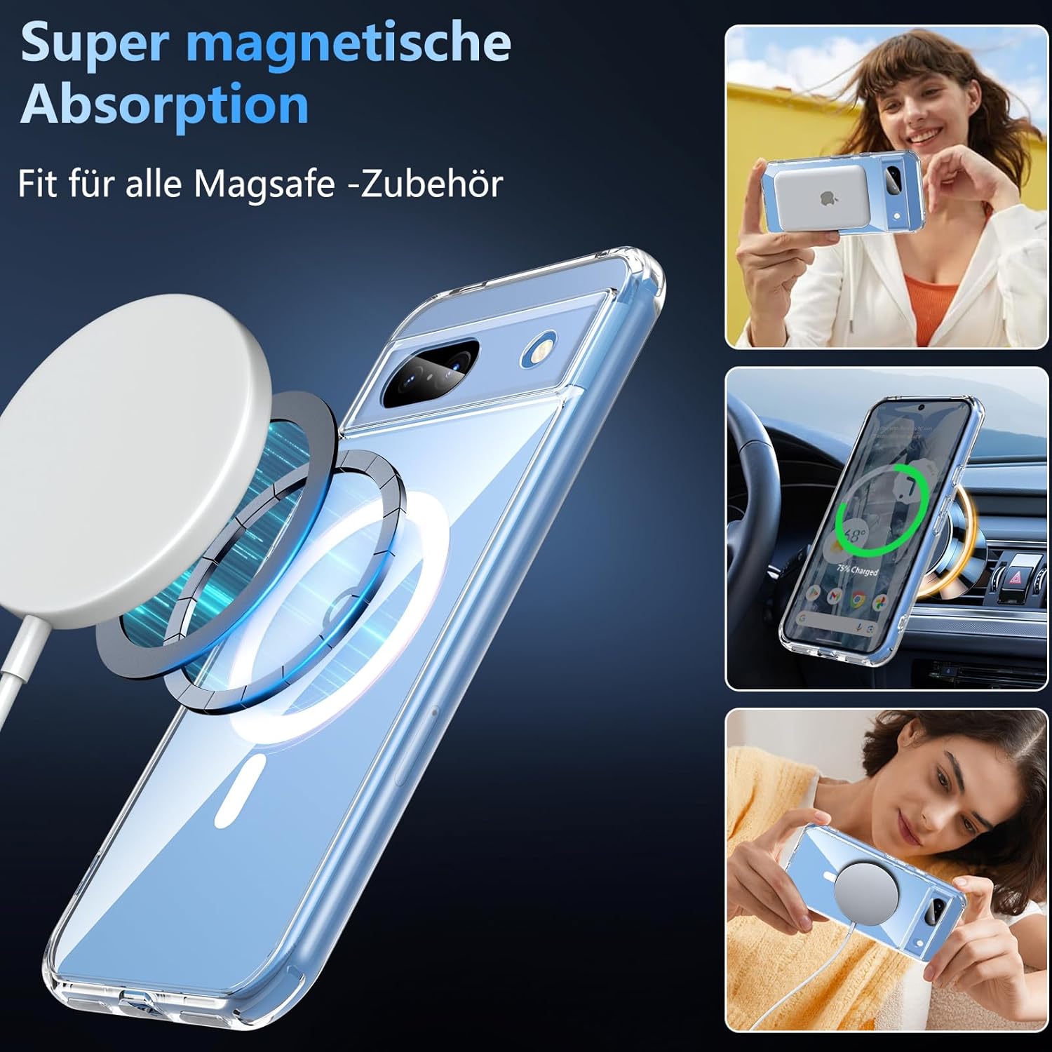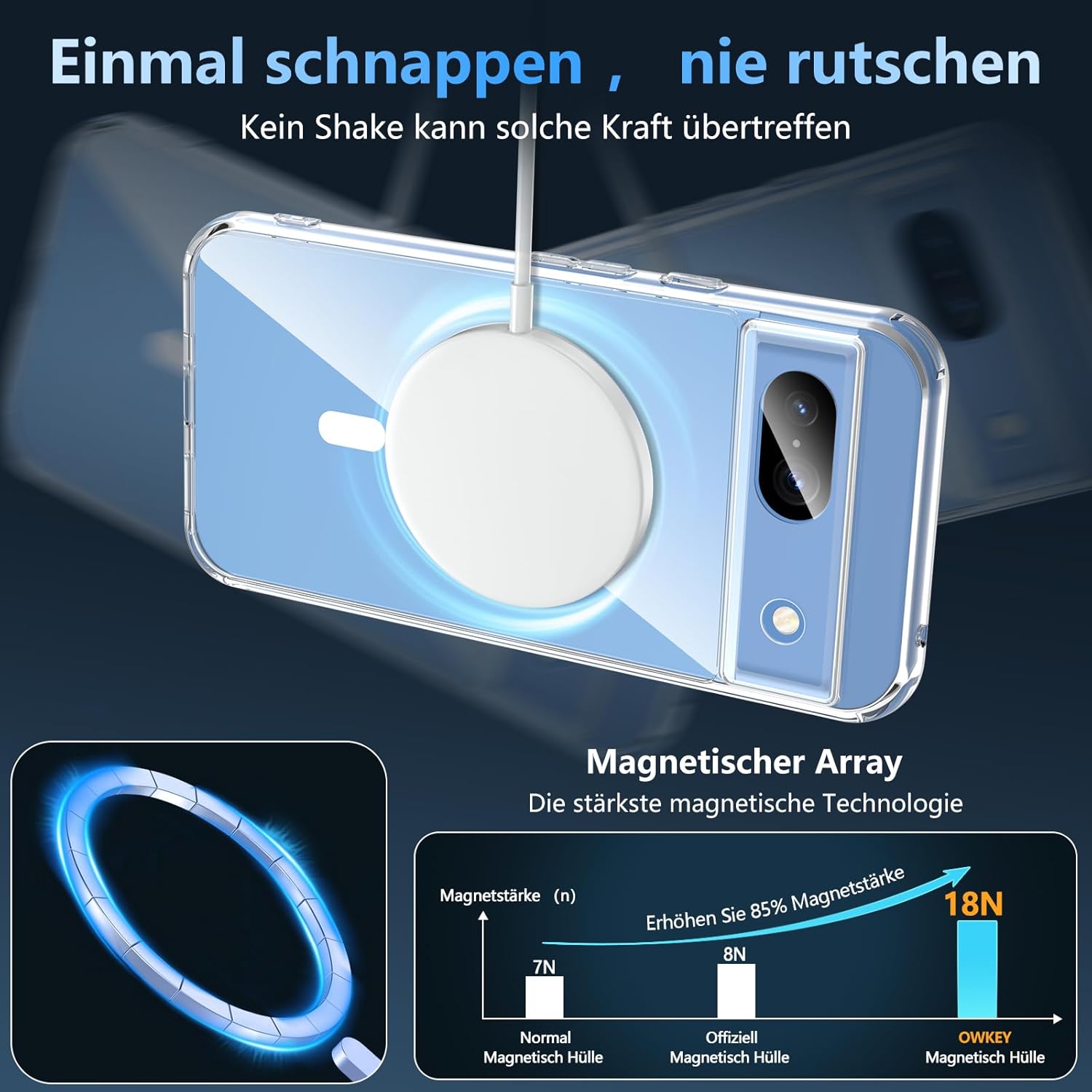 OWKEY Кейс за Google Pixel 8A 5G, Магнитен калъф за мобилен телефон Google Pixel 8A за MagSafe със защитно стъкло, тънък военен защитен калъф за Google Pixel 8A (прозрачен)