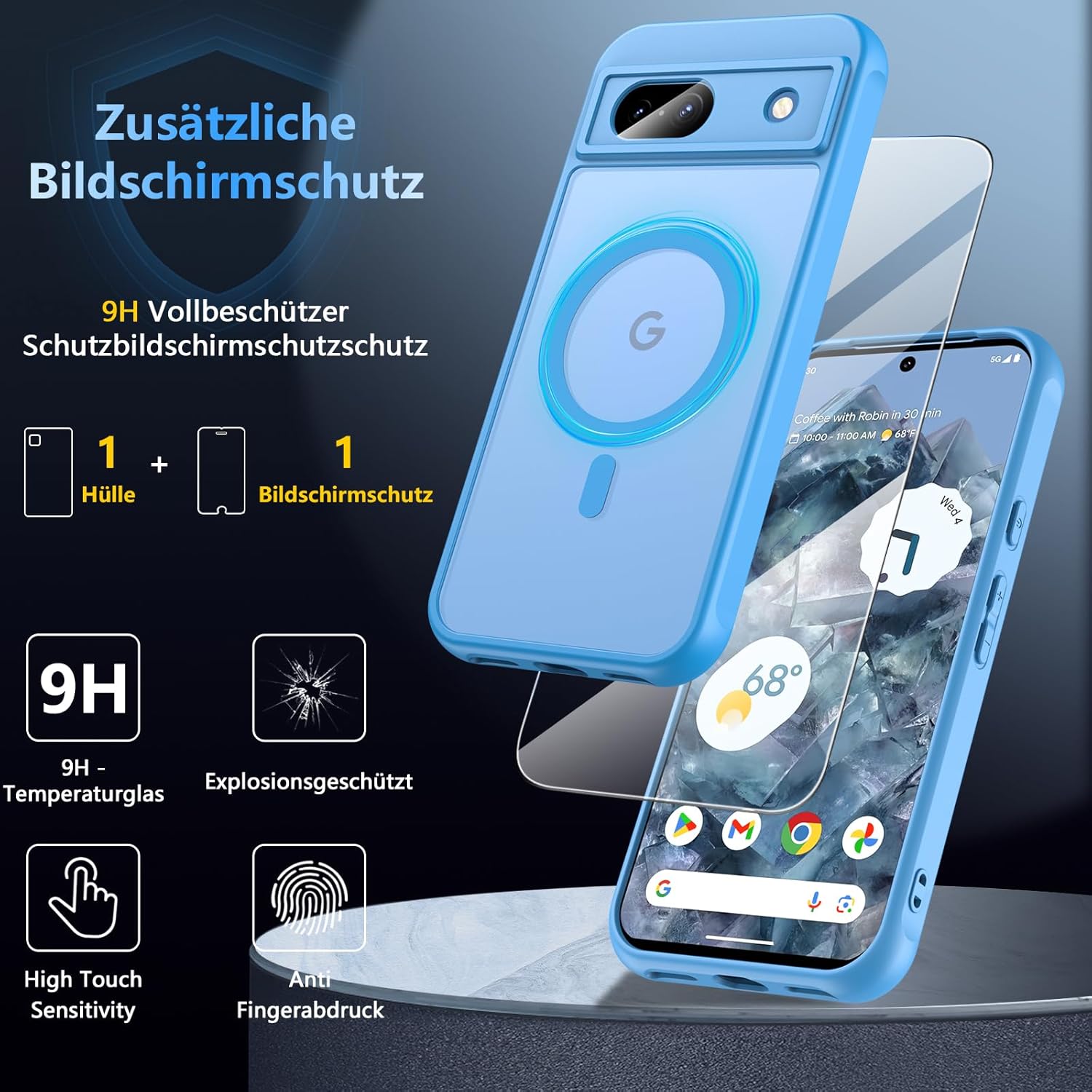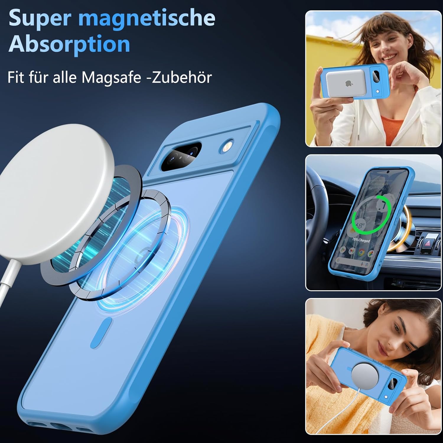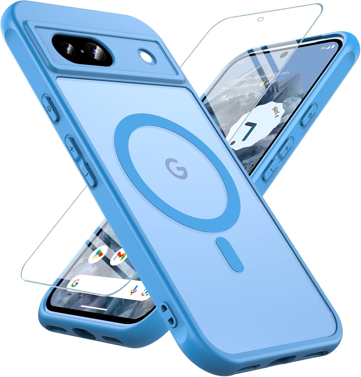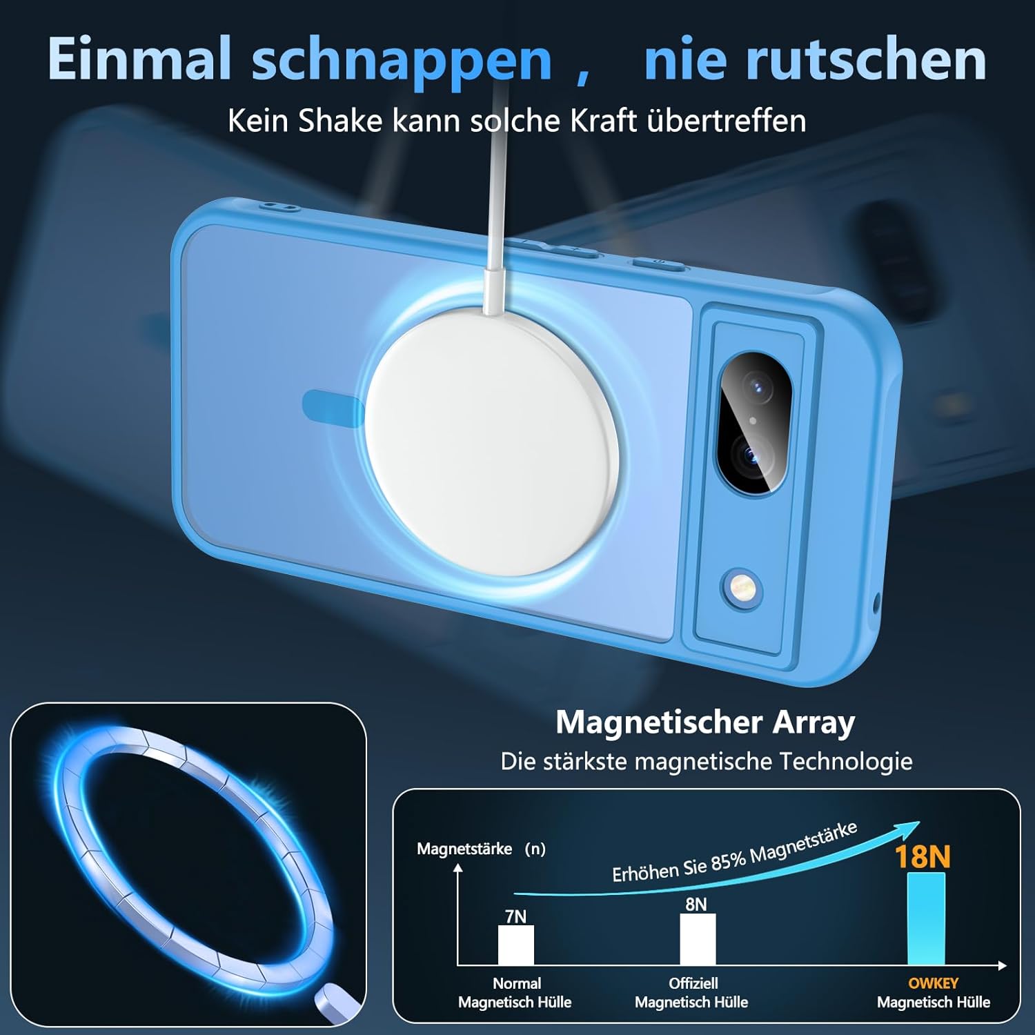 OWKEY Кейс за Google Pixel 8A 5G, Магнитен калъф за мобилен телефон Google Pixel 8A за MagSafe със защитно стъкло, тънък военен защитен калъф за Google Pixel 8A (син)