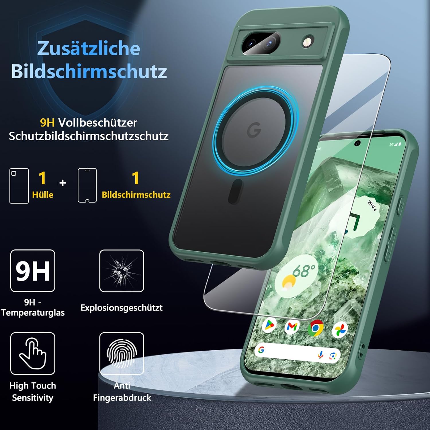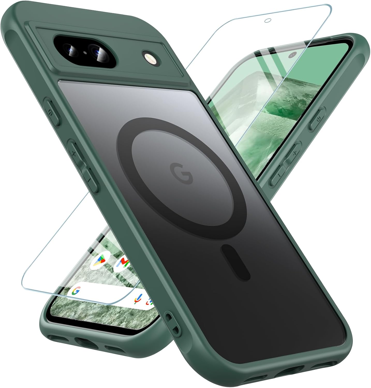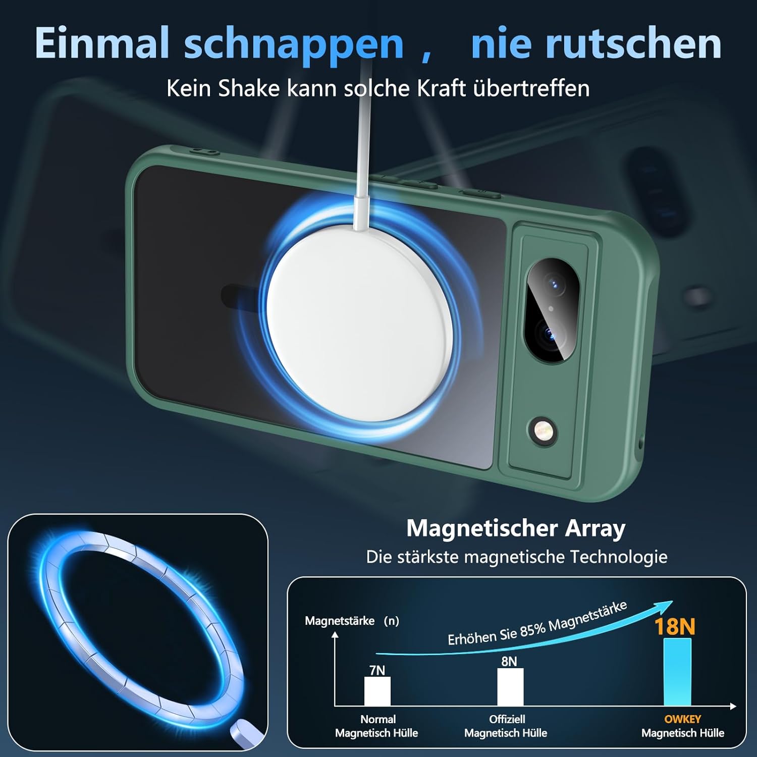 OWKEY Кейс за Google Pixel 8A 5G, Магнитен калъф за мобилен телефон Google Pixel 8A за MagSafe със защитно стъкло, тънък военен защитен калъф за Google Pixel 8A (зелен)