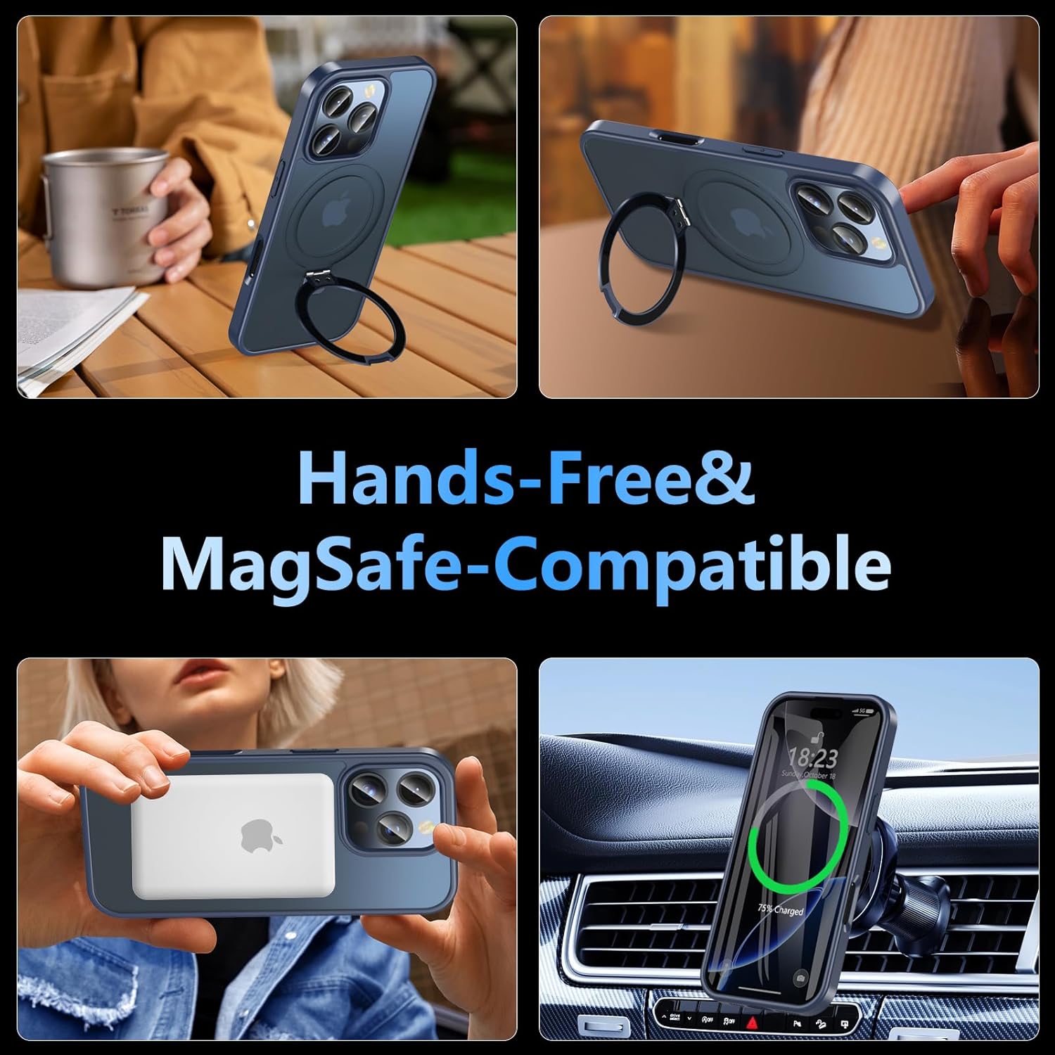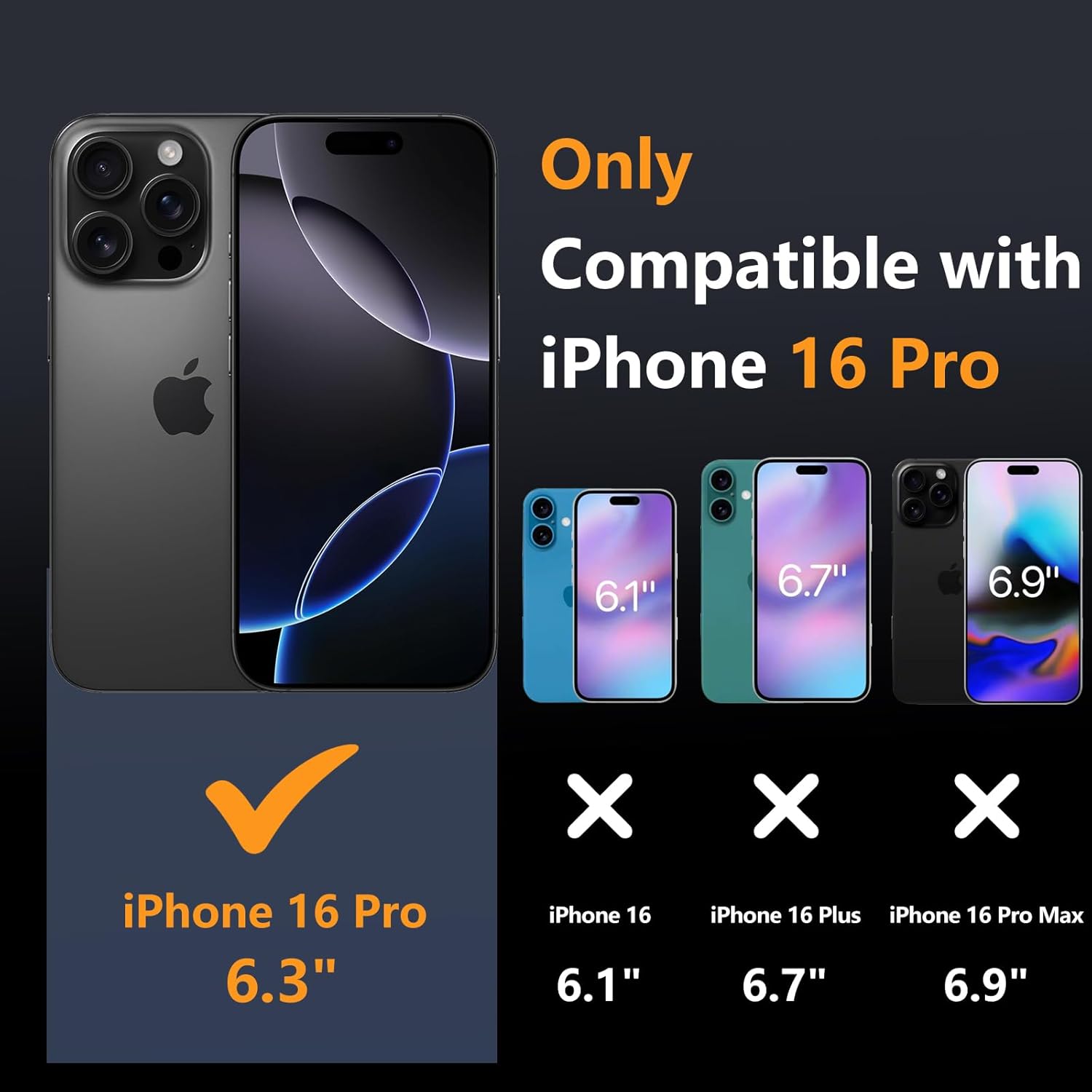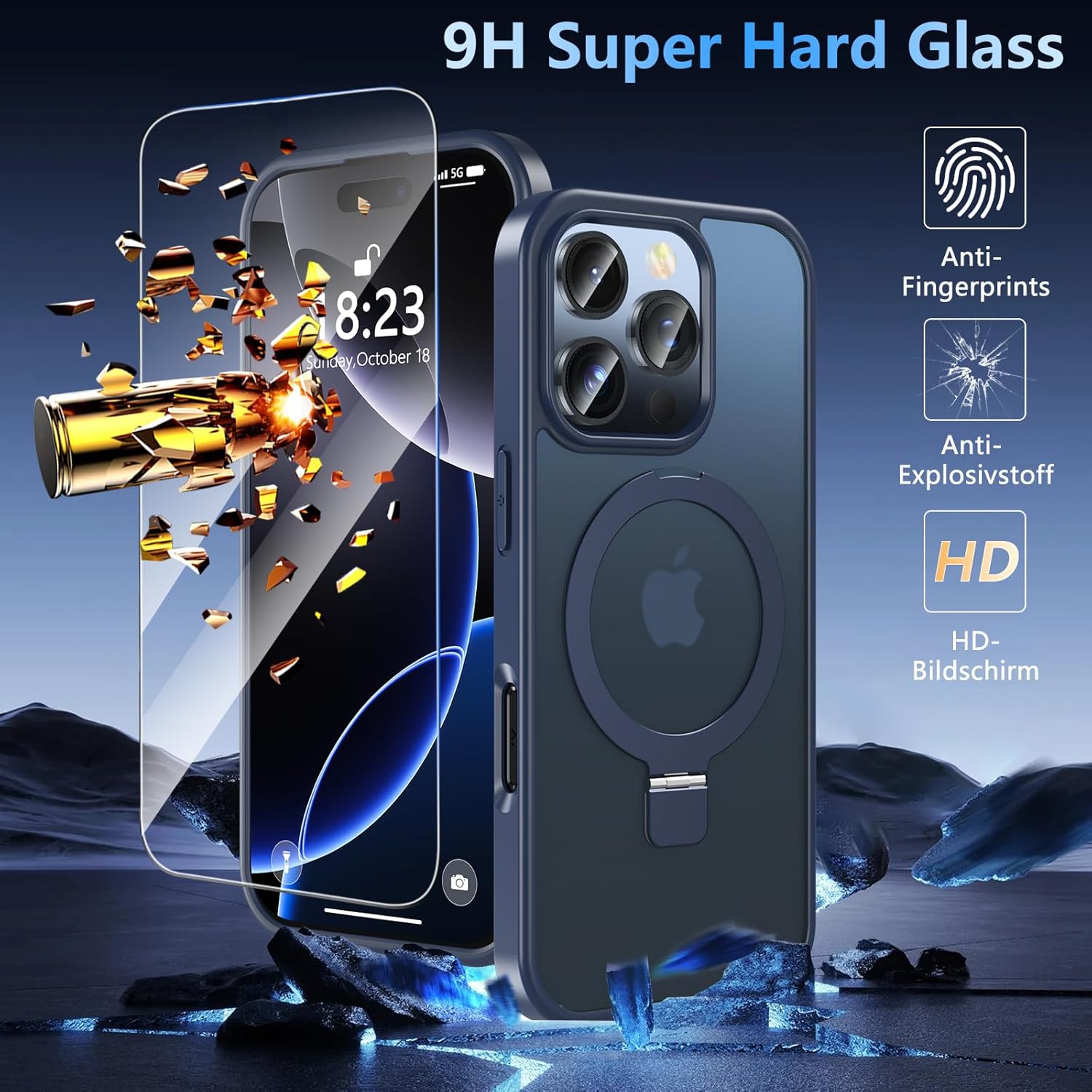 OWKEY Кейс за iPhone 16 Pro със стойка, съвместим с MagSafe, магнитен калъф за мобилен телефон за iPhone 16 Pro със закалено стъкло [военен клас защита] удароустойчив, прозрачен, матов, тънък