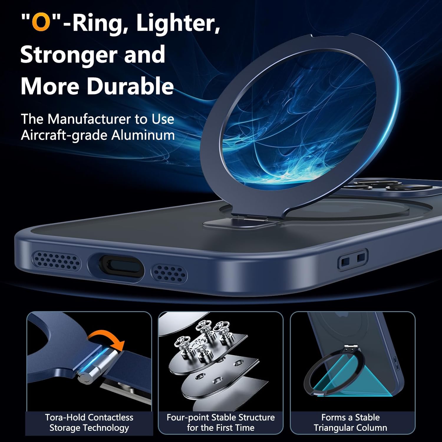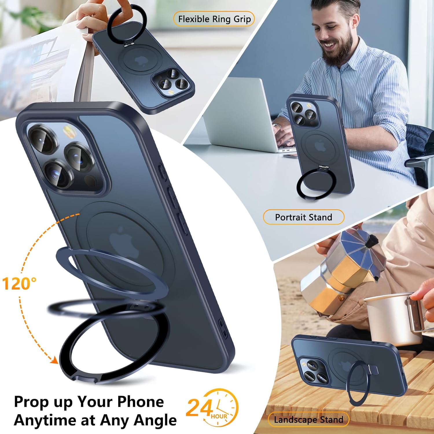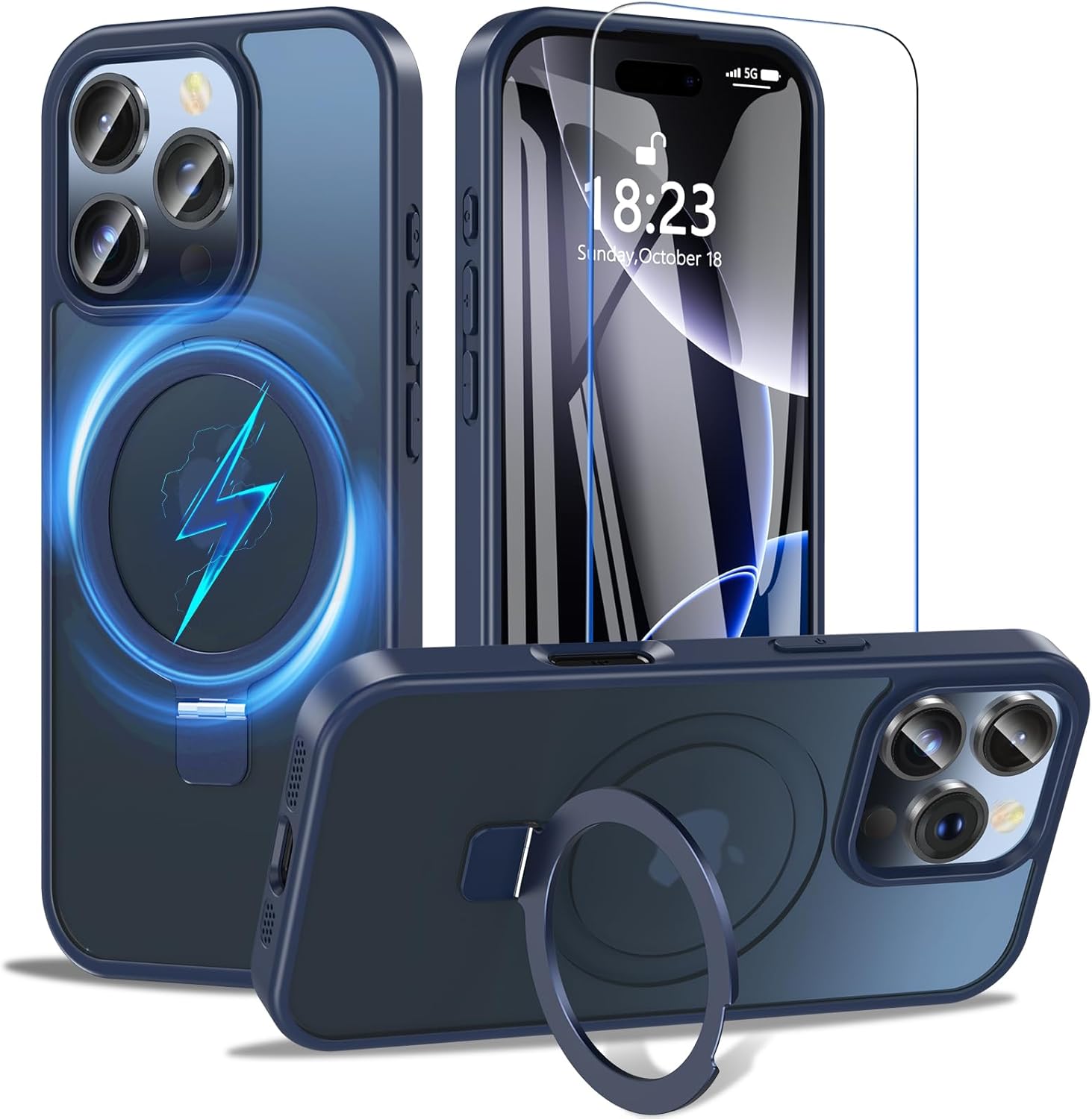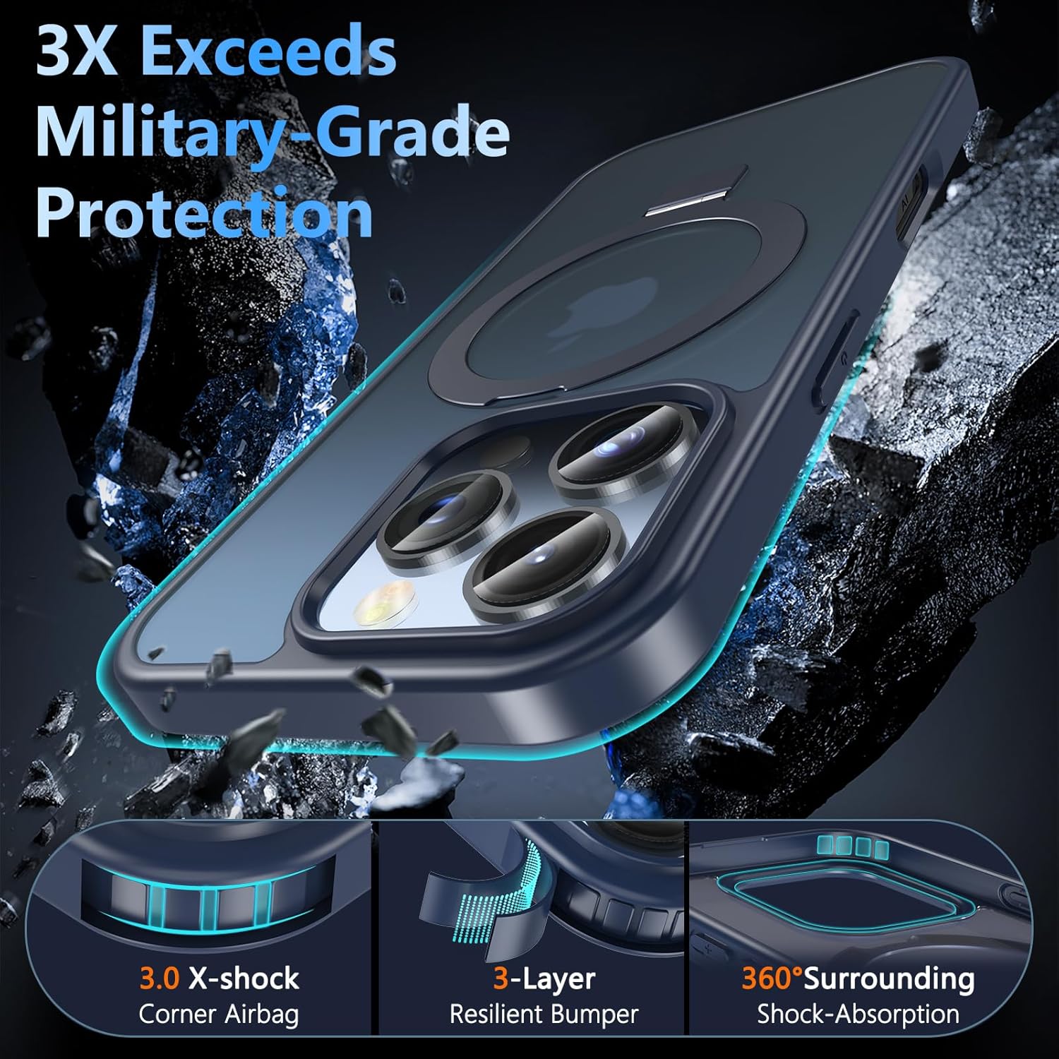 OWKEY Кейс за iPhone 16 Pro със стойка, съвместим с MagSafe, магнитен калъф за мобилен телефон за iPhone 16 Pro със закалено стъкло [военен клас защита] удароустойчив, прозрачен, матов, тънък