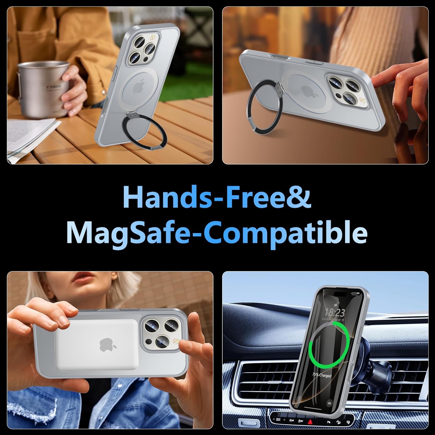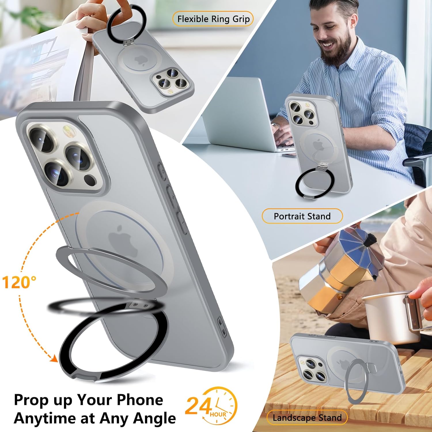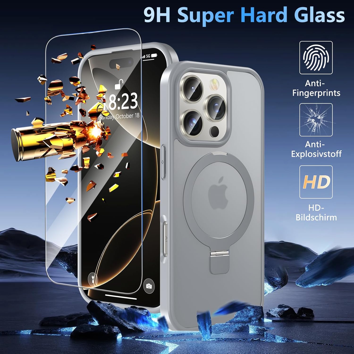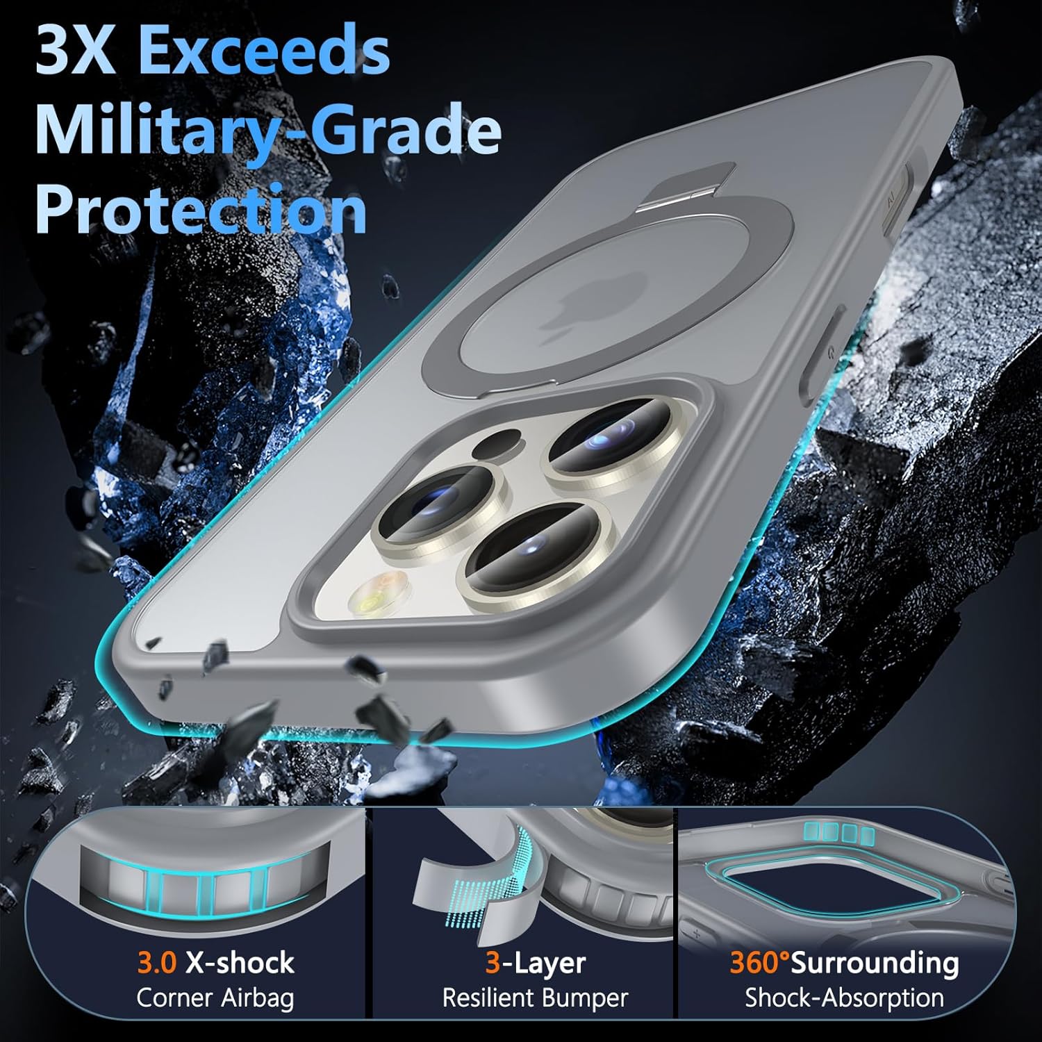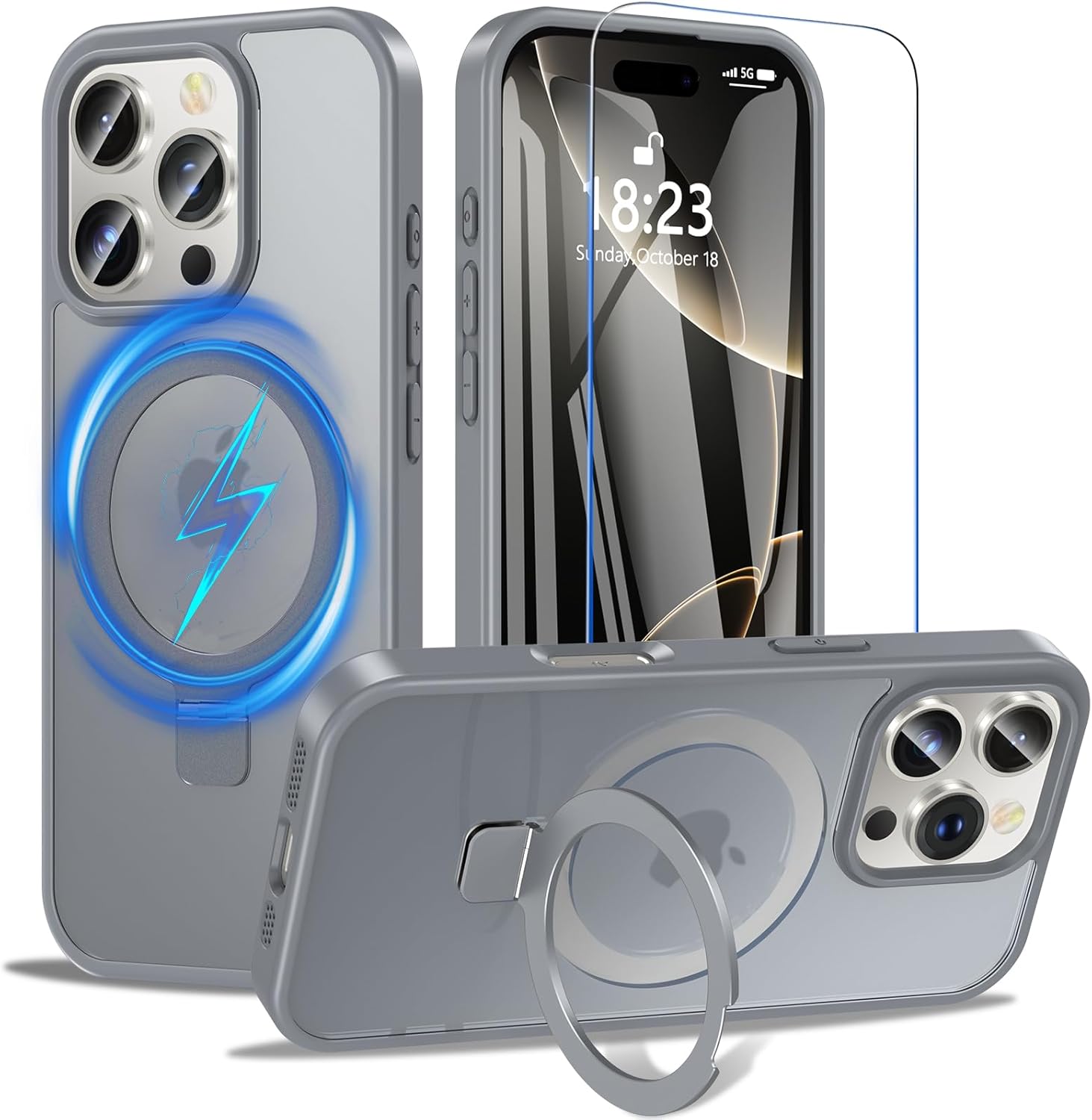 OWKEY Кейс за iPhone 16 Pro със стойка, съвместим с MagSafe, магнитен калъф за мобилен телефон за iPhone 16 Pro със закалено стъкло [военен клас защита] удароустойчив, прозрачен, матов, тънък