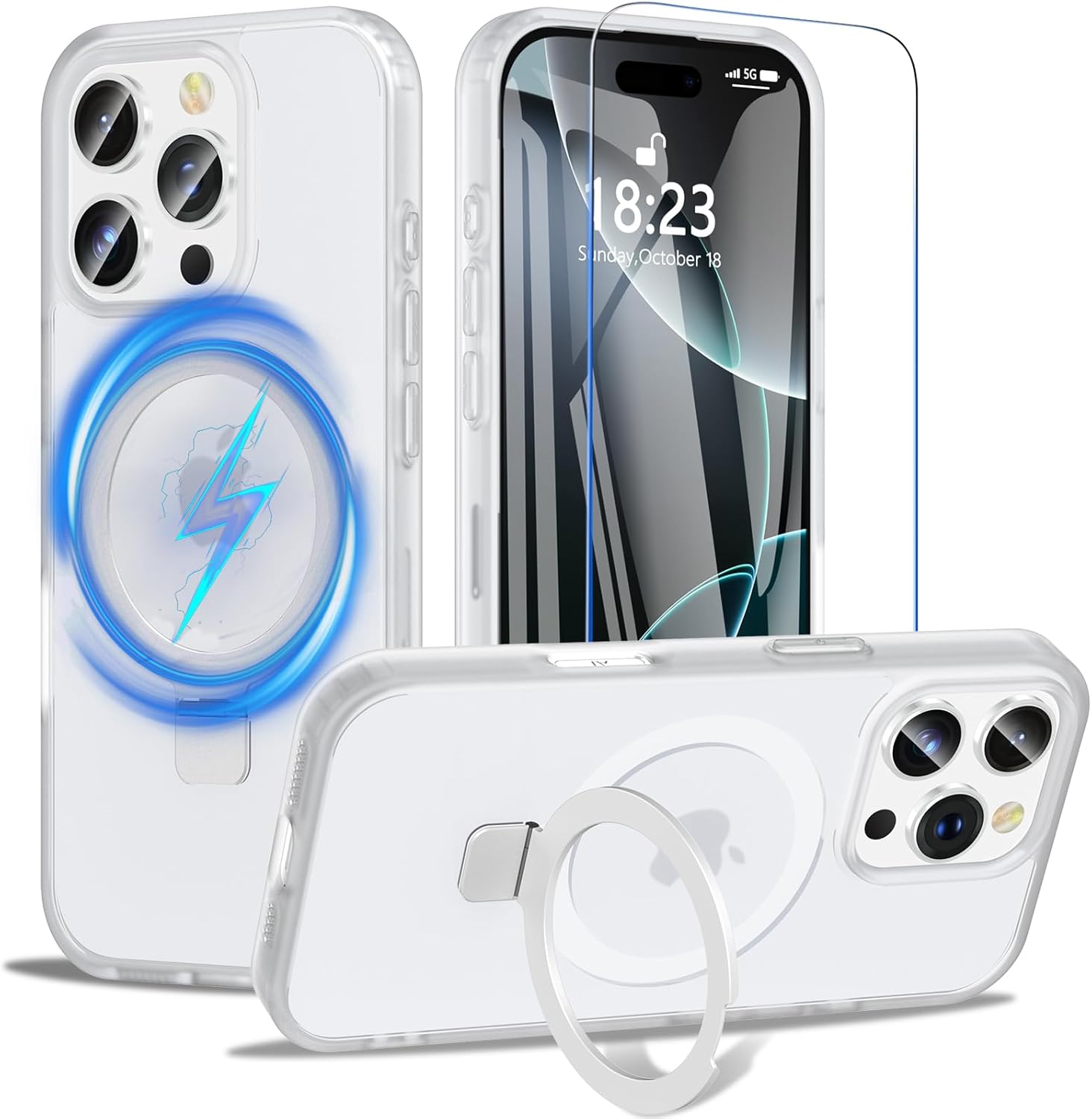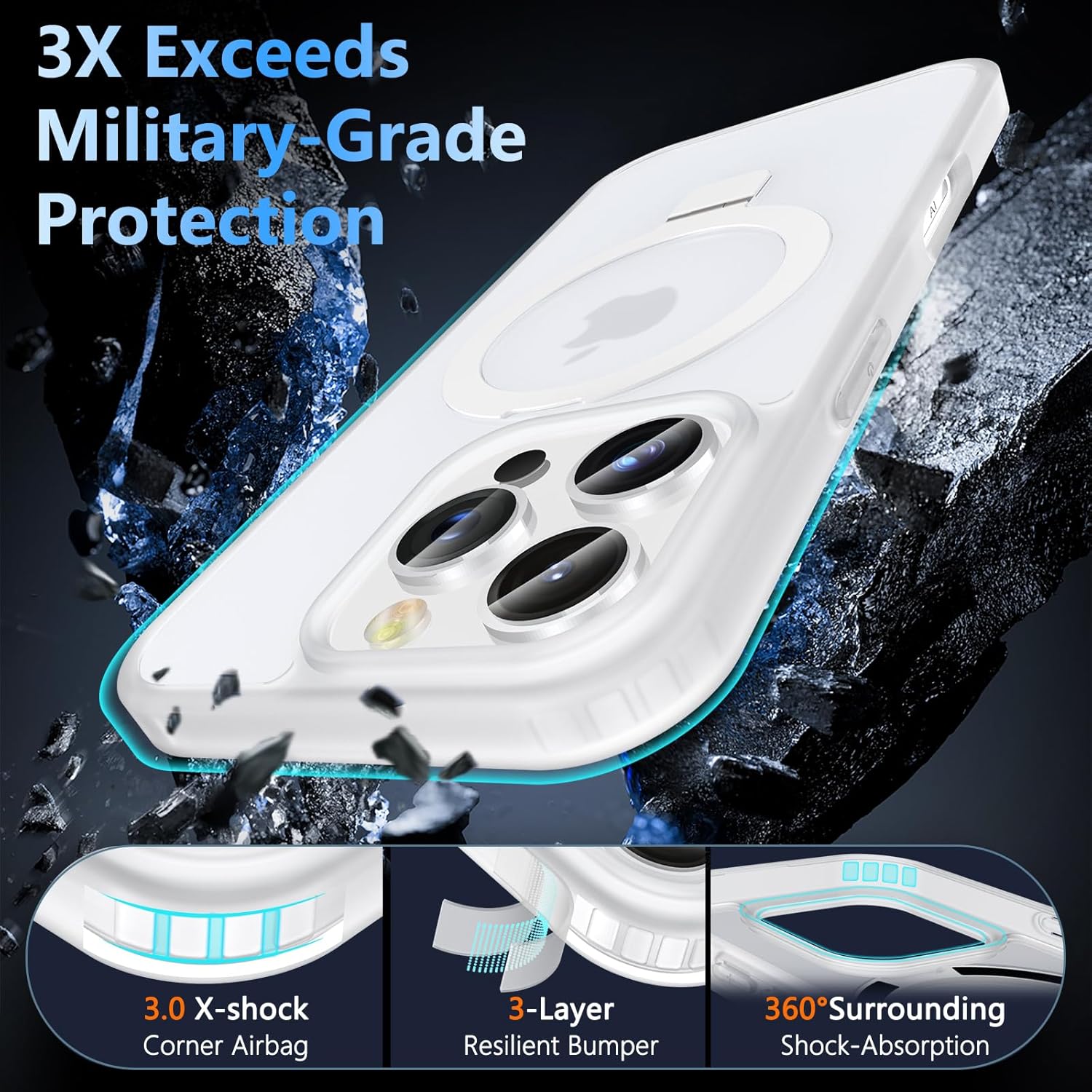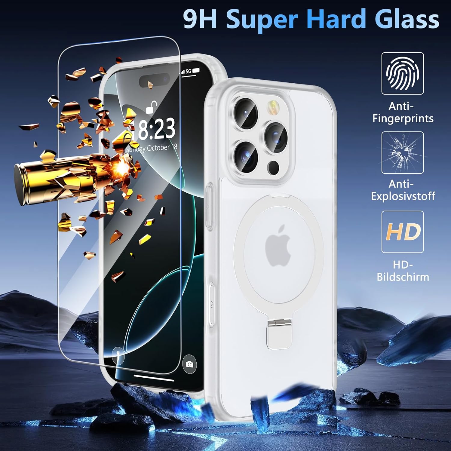 OWKEY Кейс за iPhone 16 Pro със стойка, съвместим с MagSafe, магнитен калъф за мобилен телефон за iPhone 16 Pro със закалено стъкло [военен клас защита] удароустойчив, прозрачен, матов, тънък
