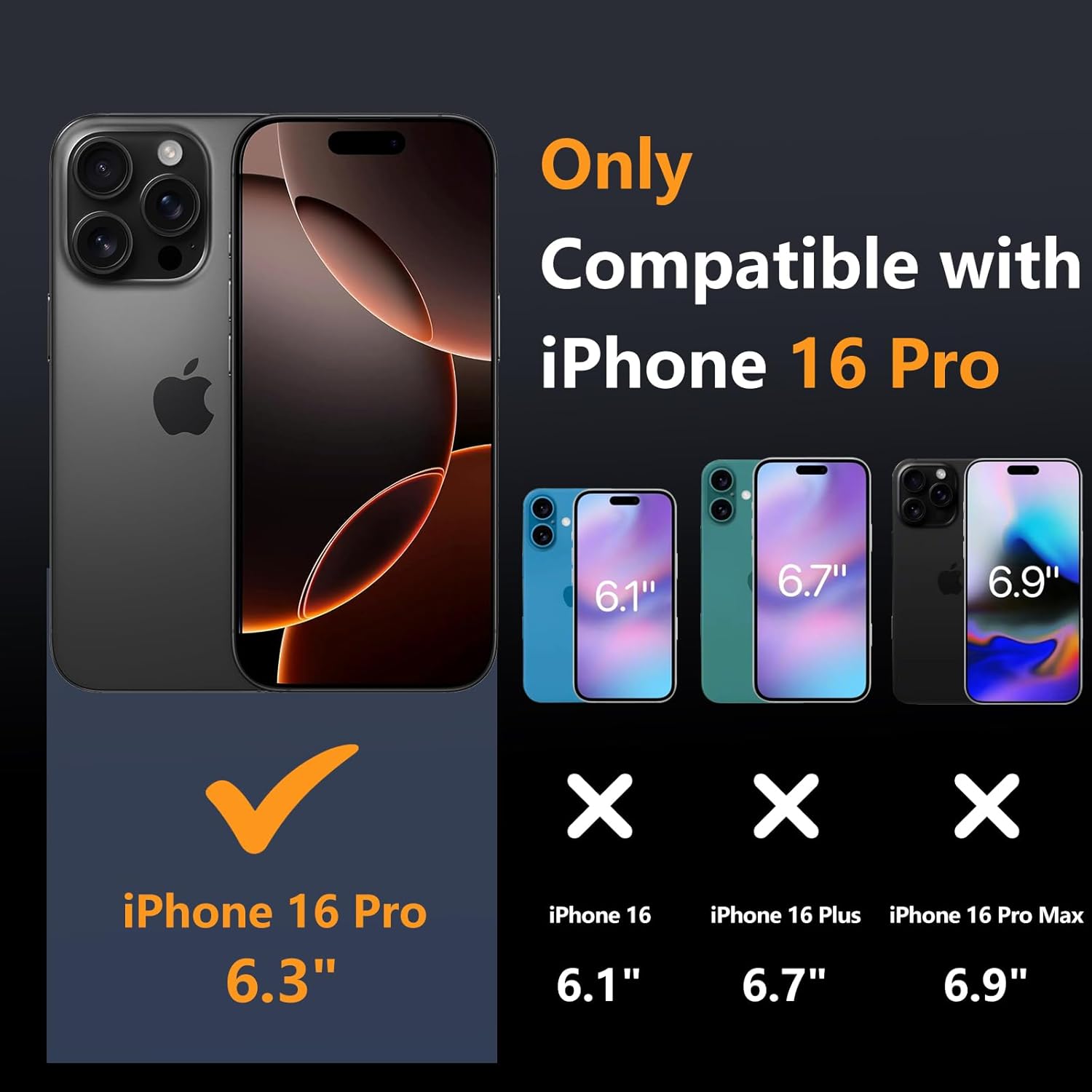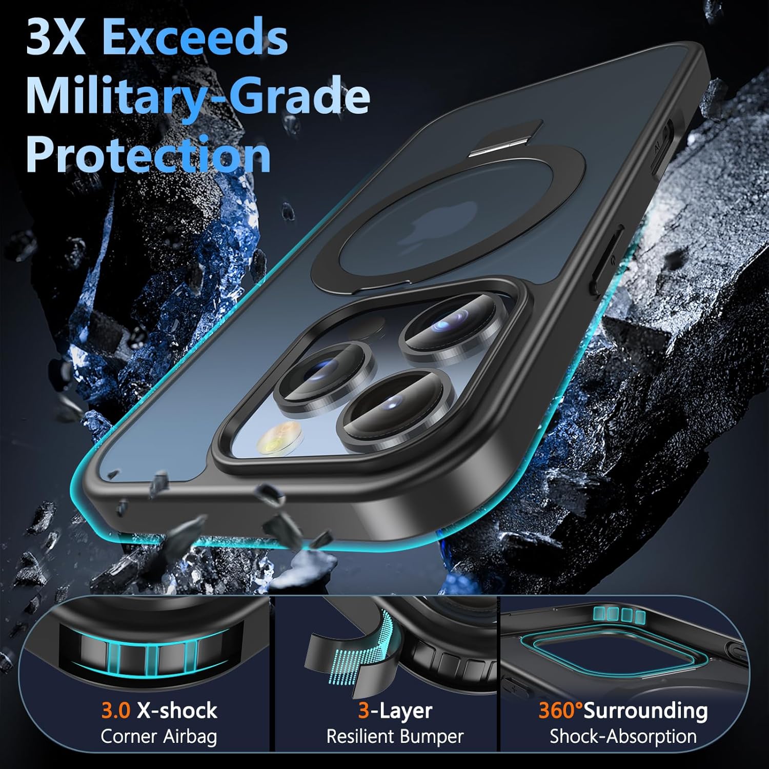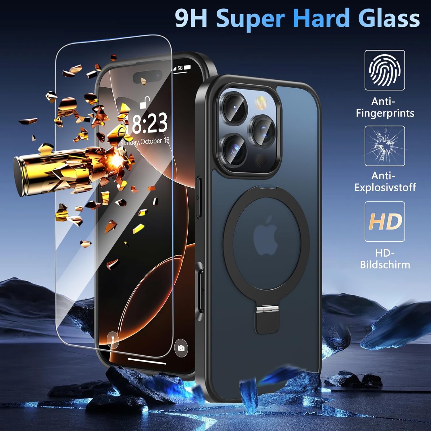OWKEY Кейс за iPhone 16 Pro със стойка, съвместим с MagSafe, Магнитен калъф за мобилен телефон за iPhone 16 Pro със закалено стъкло [Военен клас защита] Удароустойчив, прозрачен, матов, защитен