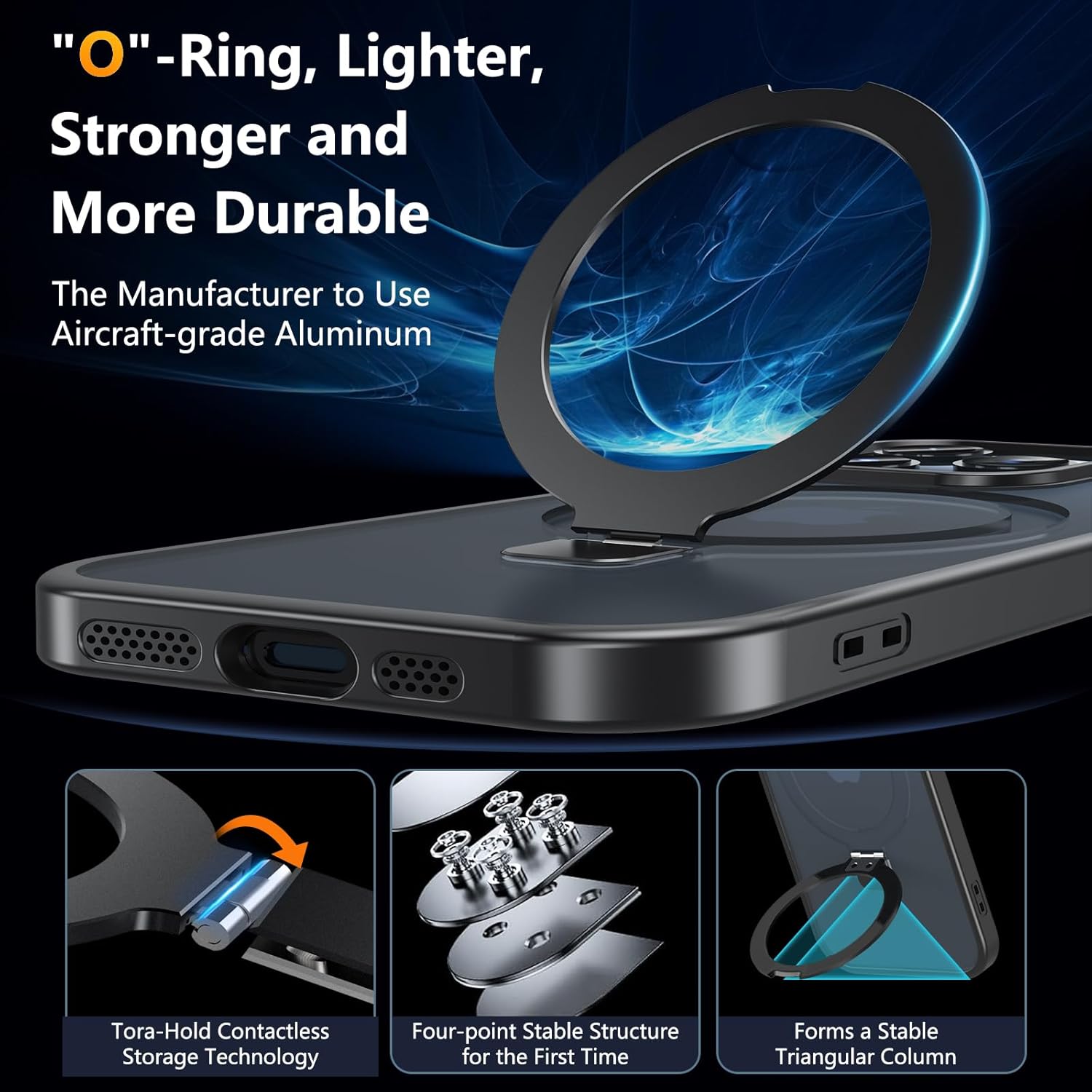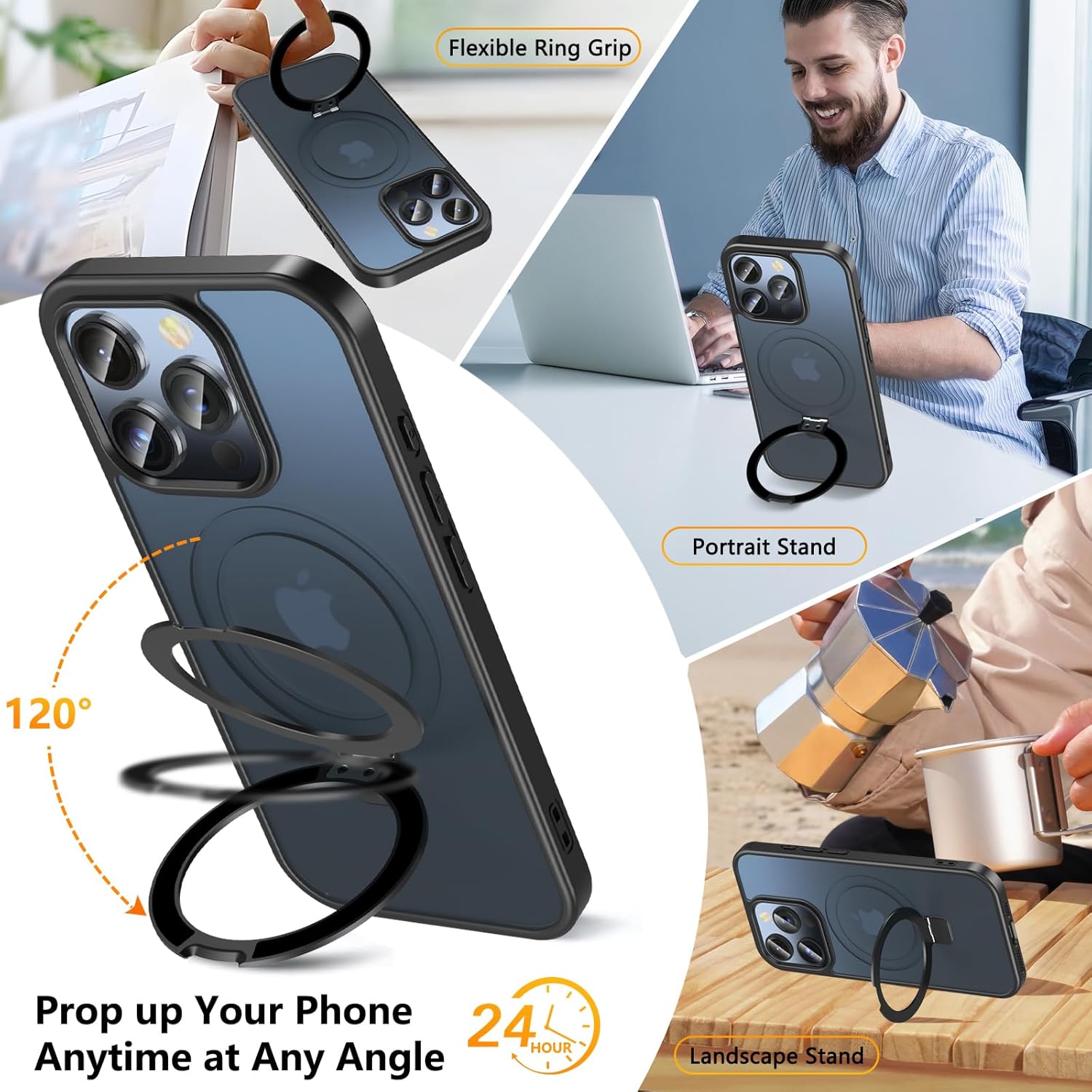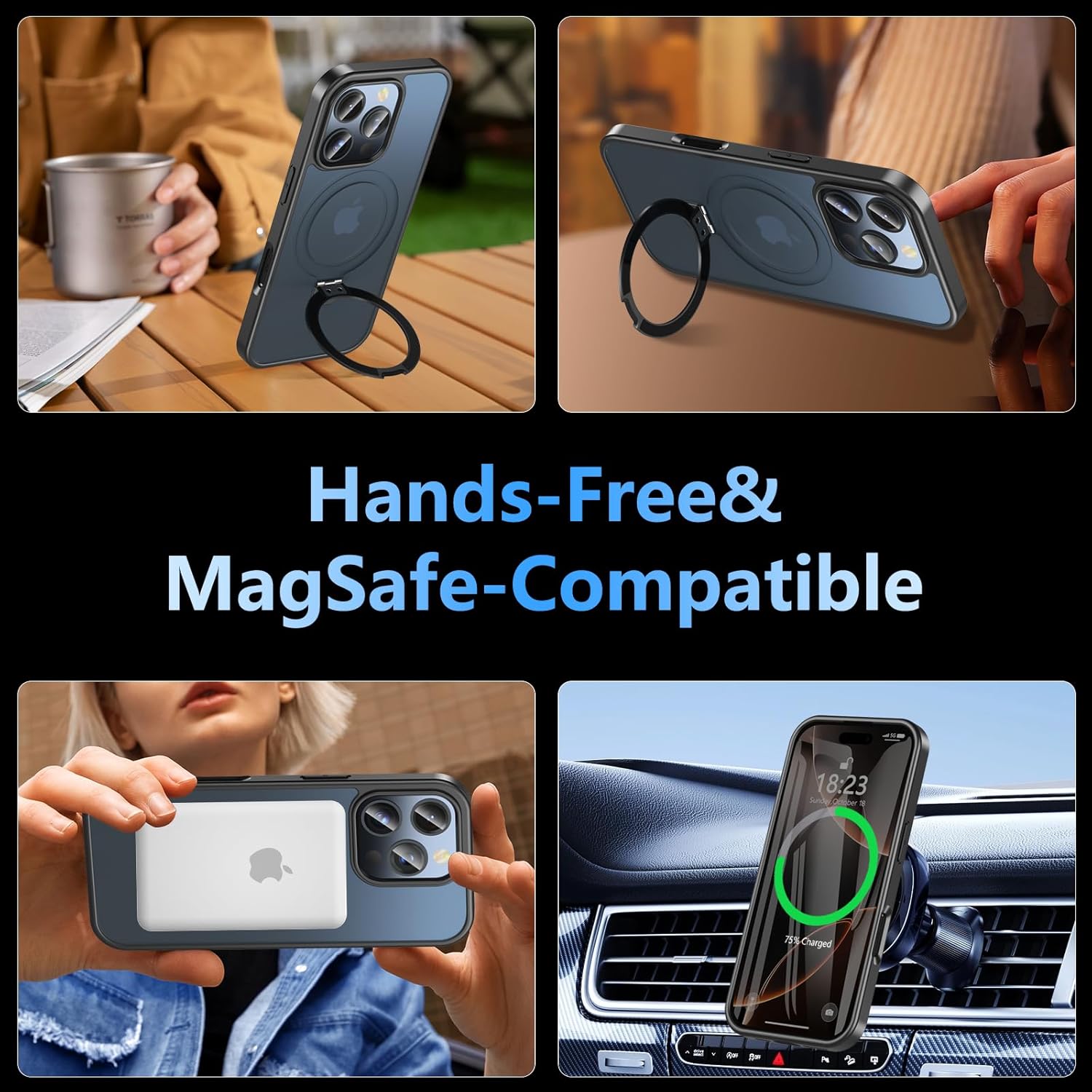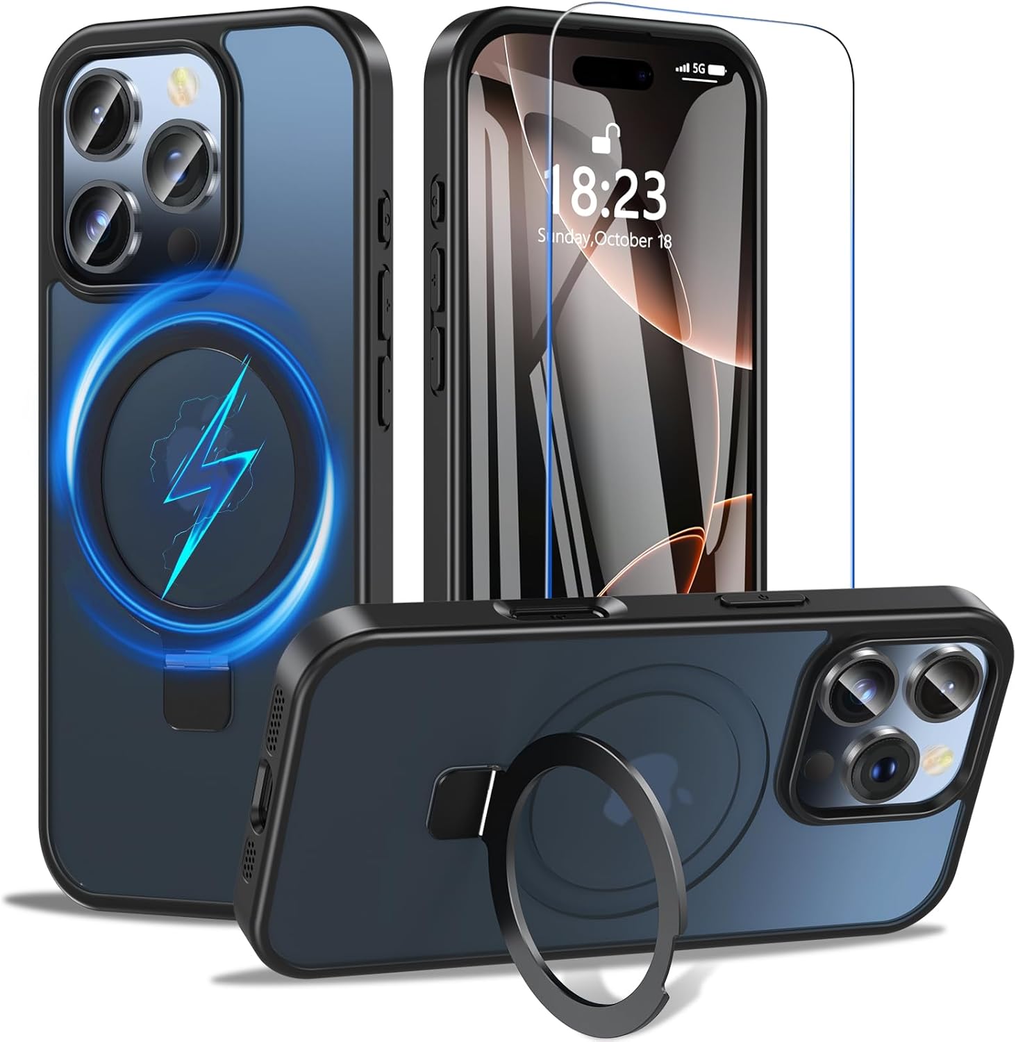 OWKEY Кейс за iPhone 16 Pro със стойка, съвместим с MagSafe, Магнитен калъф за мобилен телефон за iPhone 16 Pro със закалено стъкло [Военен клас защита] Удароустойчив, прозрачен, матов, защитен