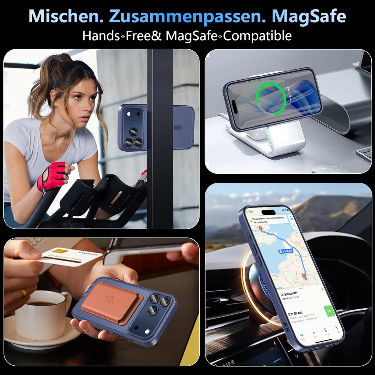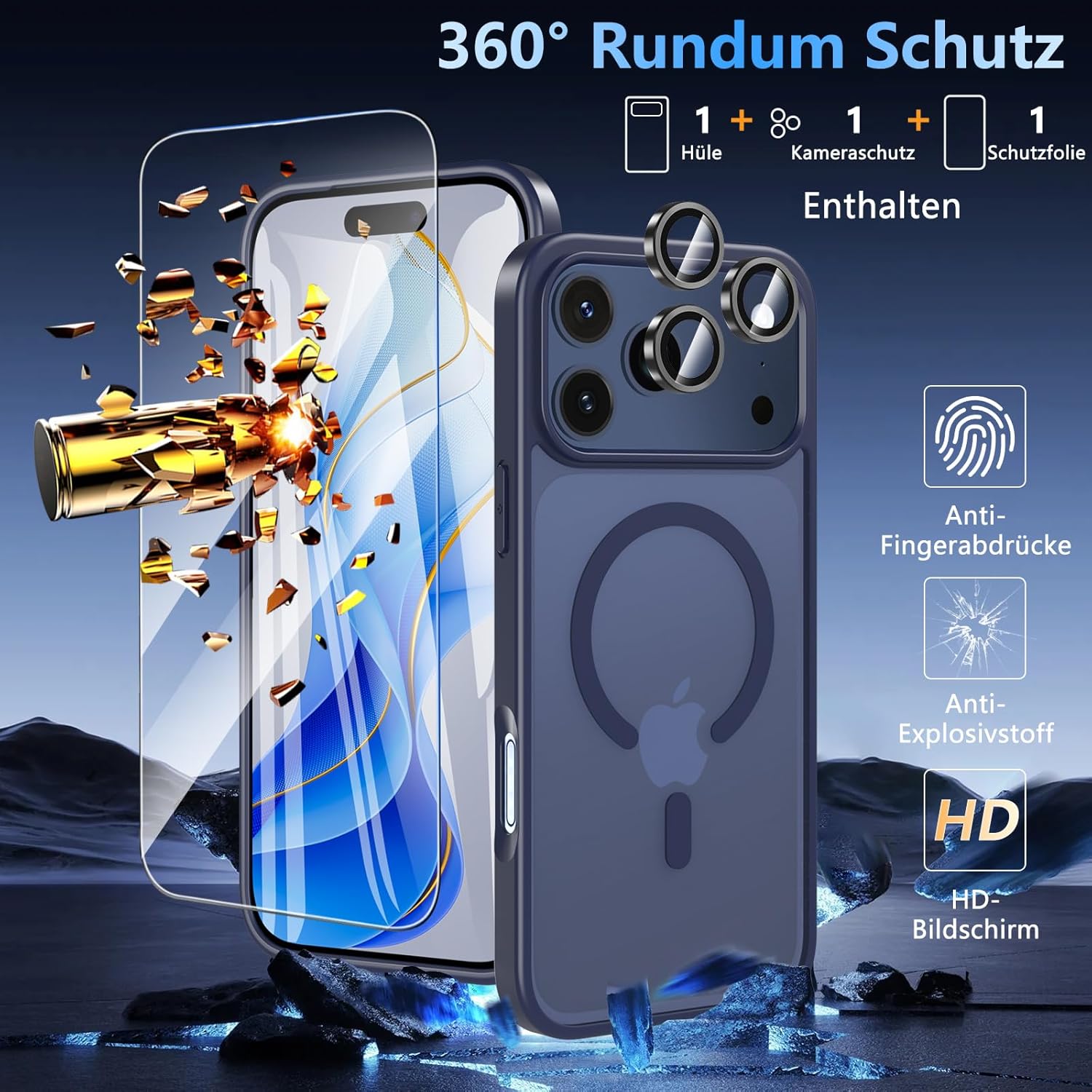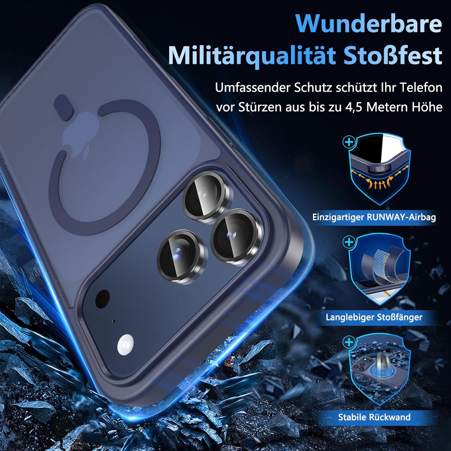 OWKEY Кейс за iPhone 17 Pro Max със защита на камерата, съвместим с MagSafe, Магнитен калъф за мобилен телефон за iPhone 17 Pro Max със защитно стъкло, удароустойчив, полупрозрачен матов, военен клас