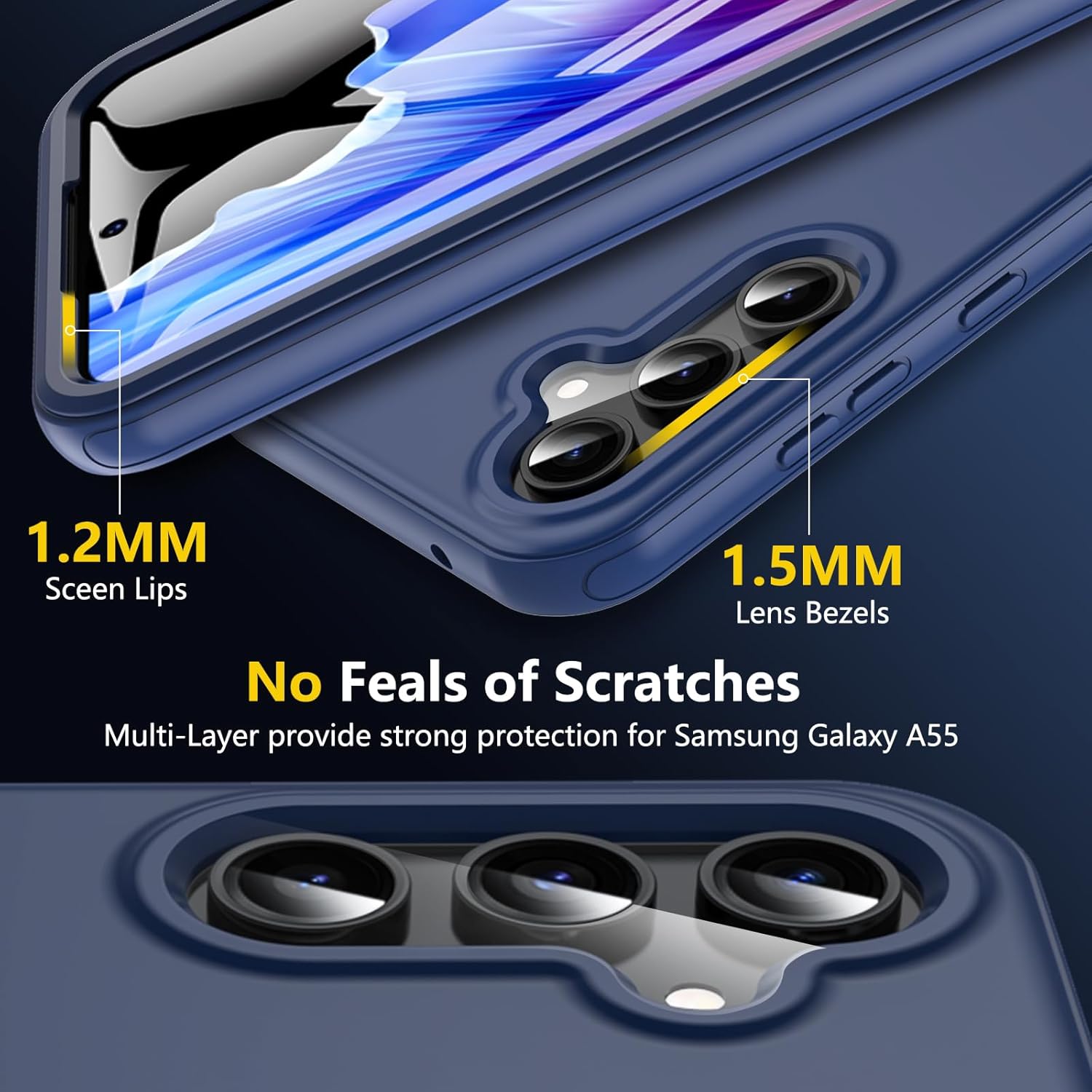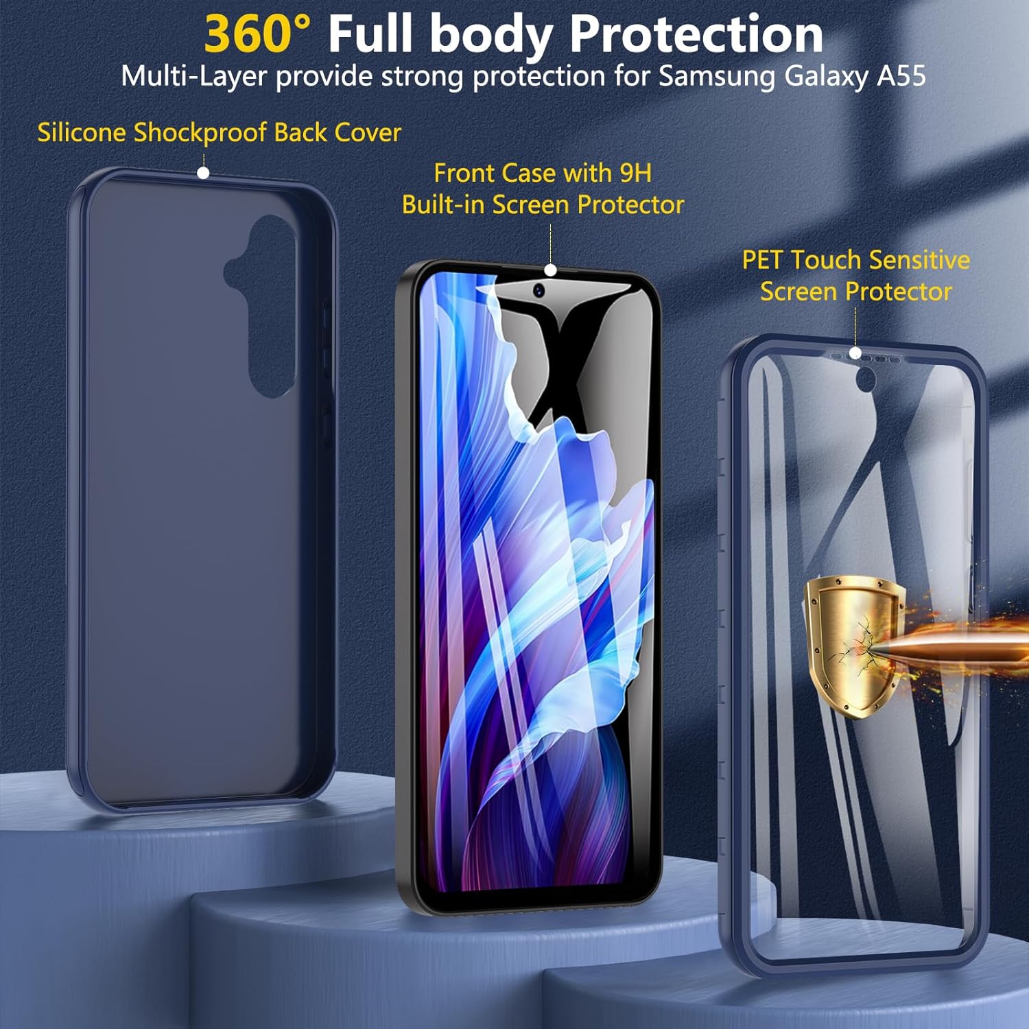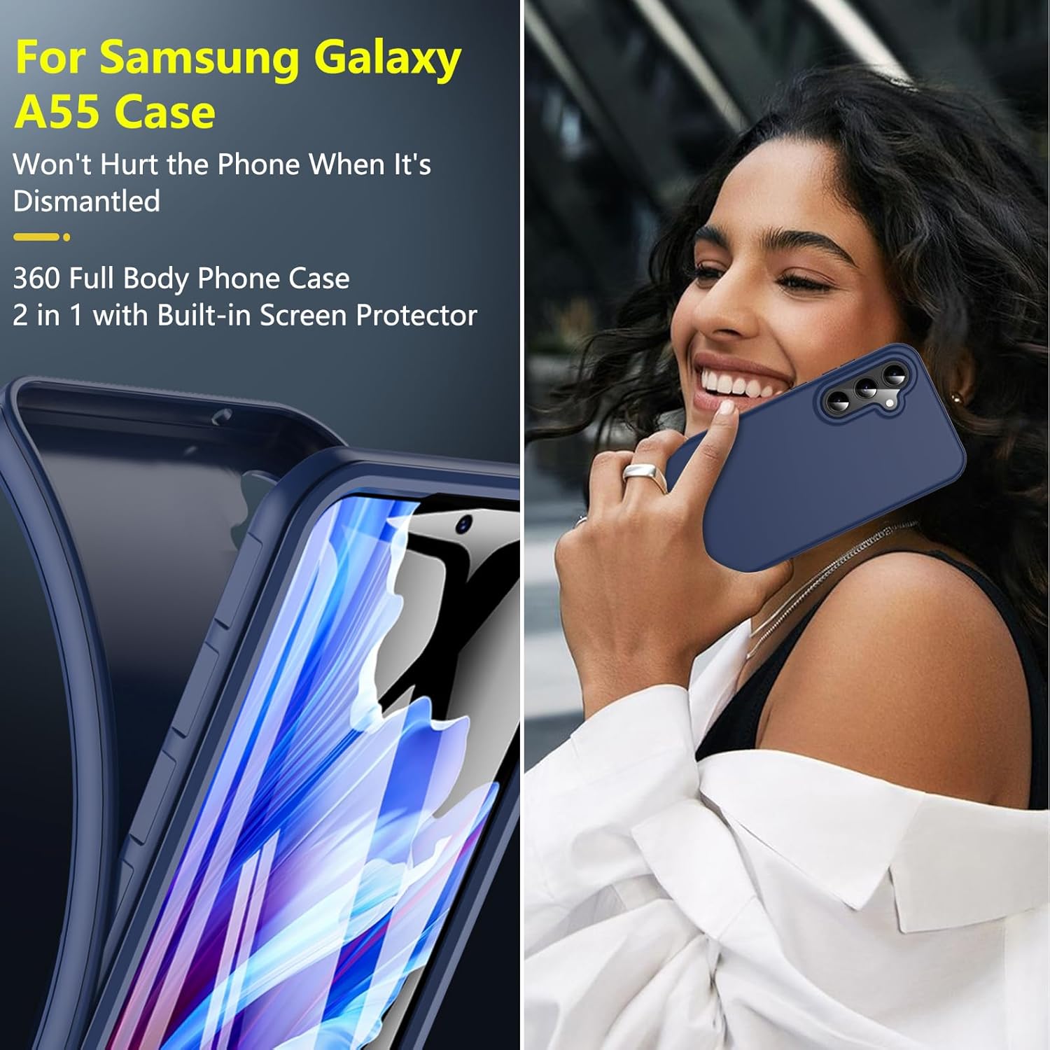 OWKEY Кейс за Samsung Galaxy A55 5G, Калъф за мобилен телефон Samsung A55 5G, 360° всестранна защита, Удароустойчив силиконов здрав калъф-бъмпер, Външен калъф с вграден протектор за екрана, Защитен