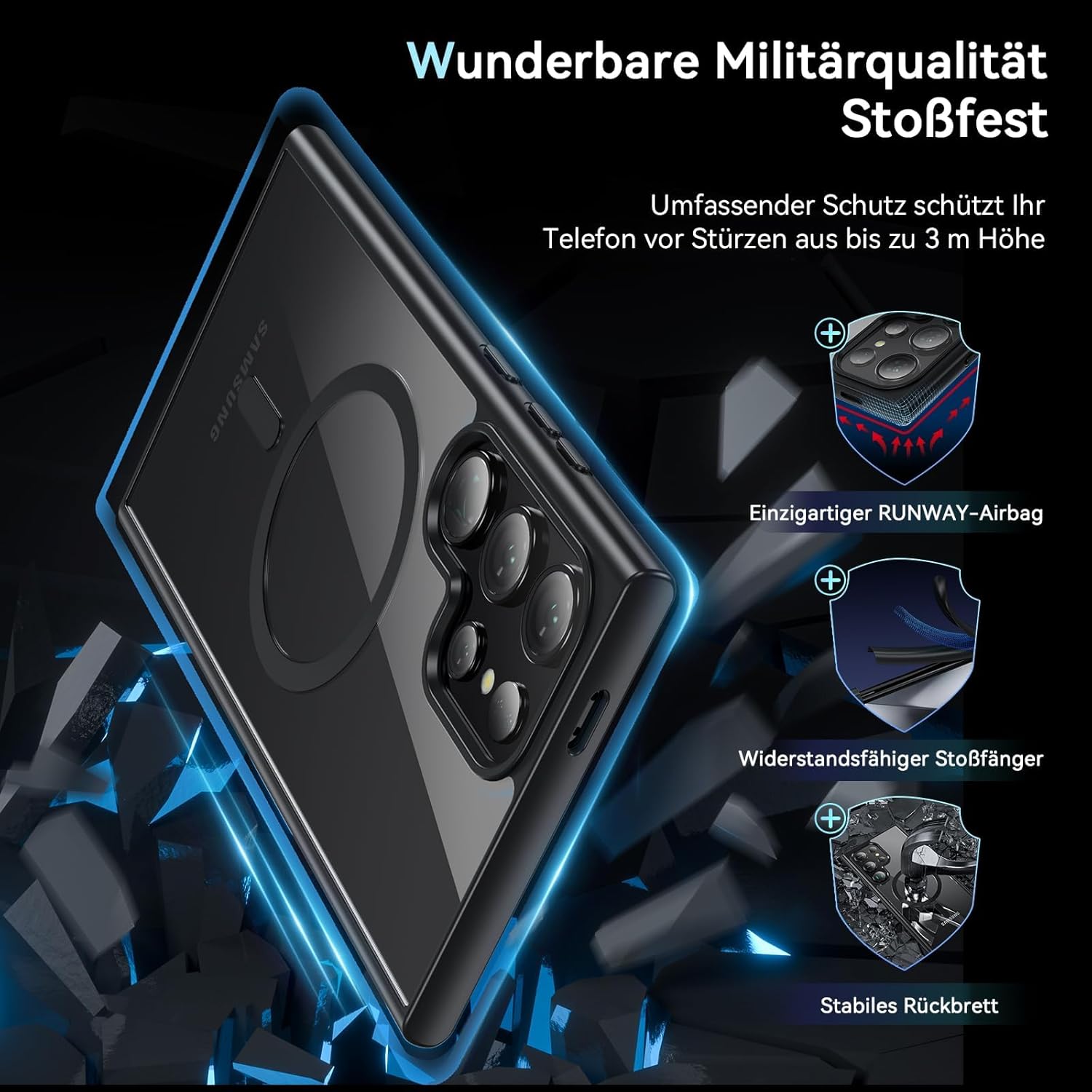 • Certified military-grade drop-tested: The Samsung S25 Ultra case has been thoroughly hardened by combining a high-impact polycarbonate (PC) screen protector, durable silicone protective back and flexible soft thermoplastic polyurethane (TPU) edge. The 4 corners with anti-collision angle technology mean the case can endure 1000+ times drops with zero damage from a 3 m height. This certified MIL-STD drop-test shockproof Samsung S25 Ultra 5G case provides the toughest protection for your phone from drops, scratches, bumps and shocks.