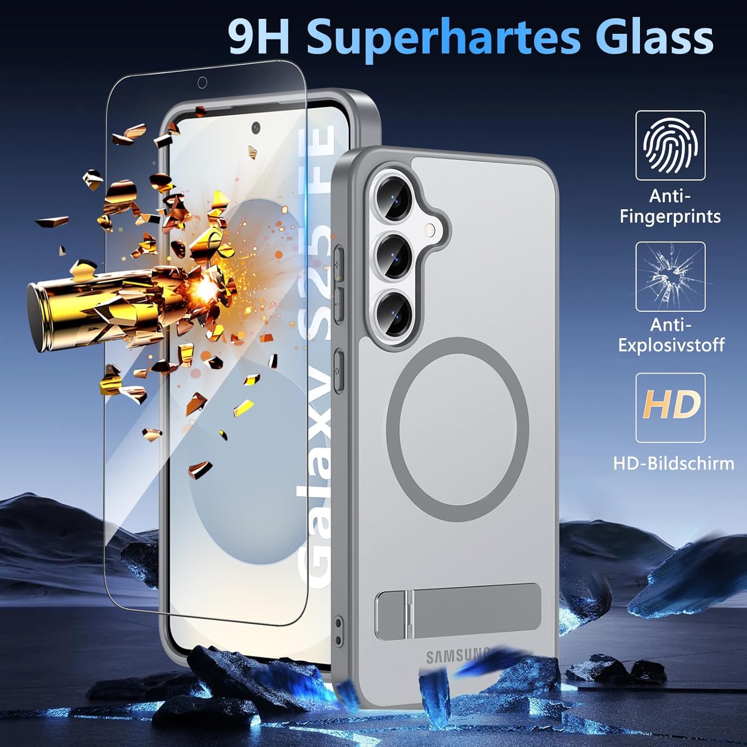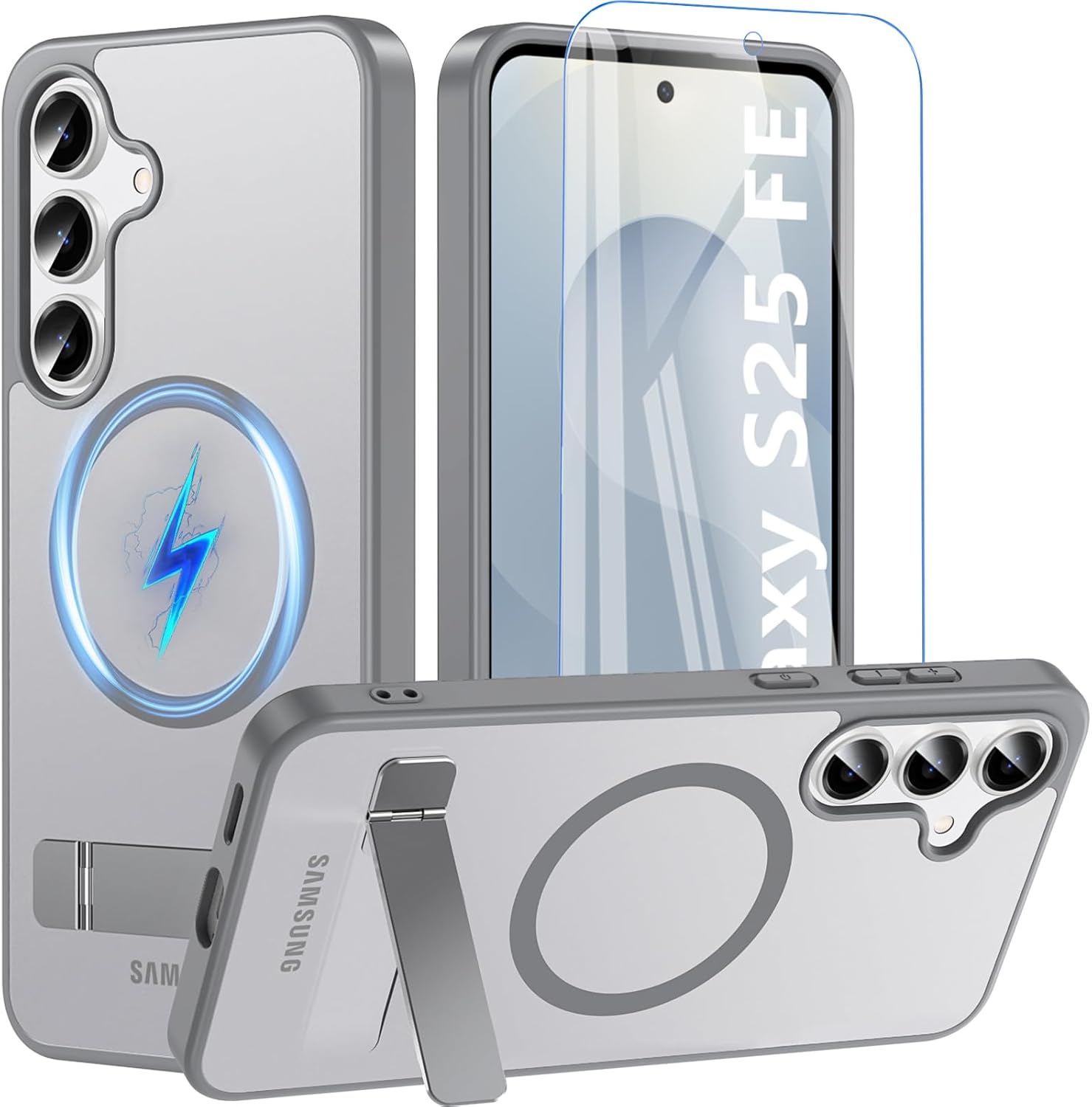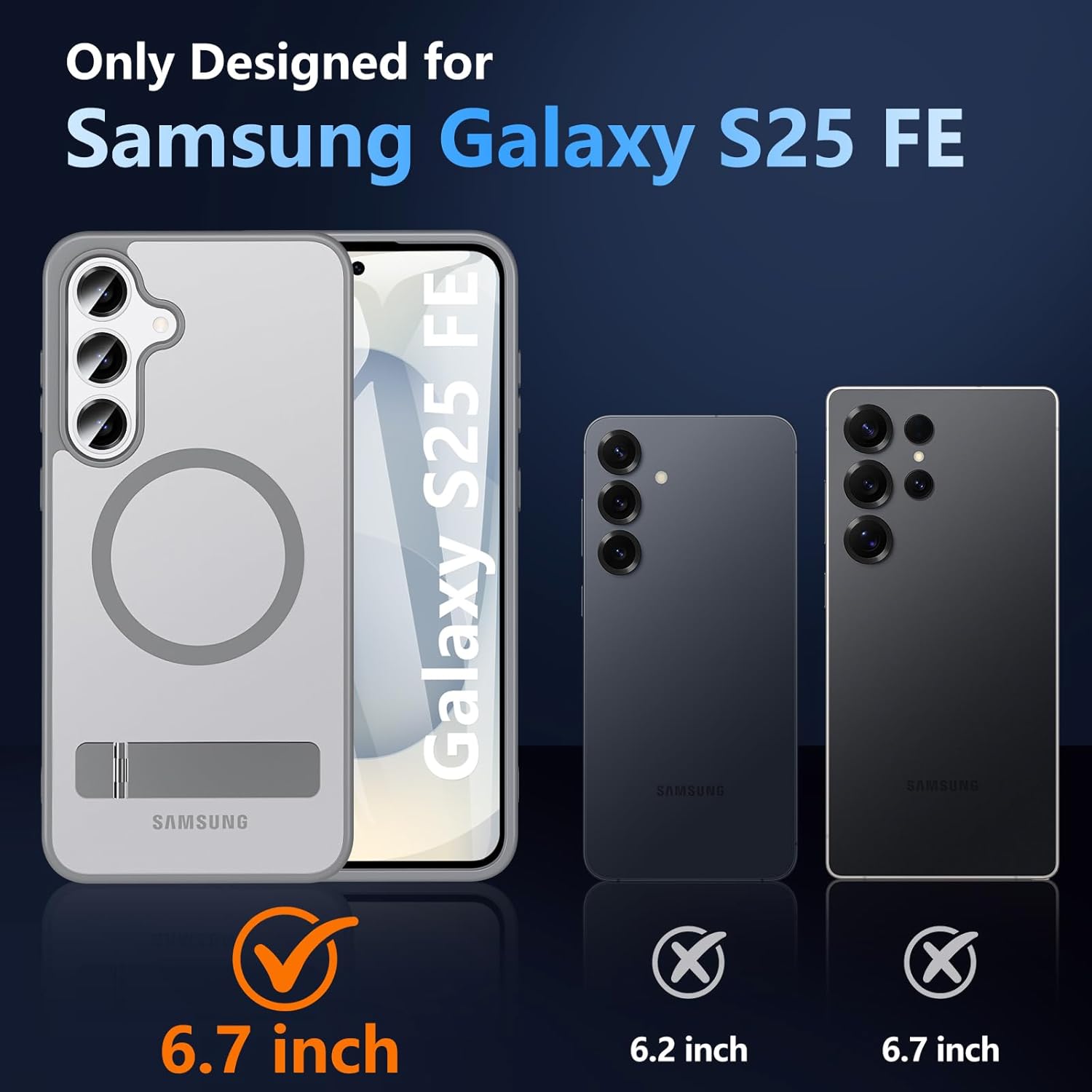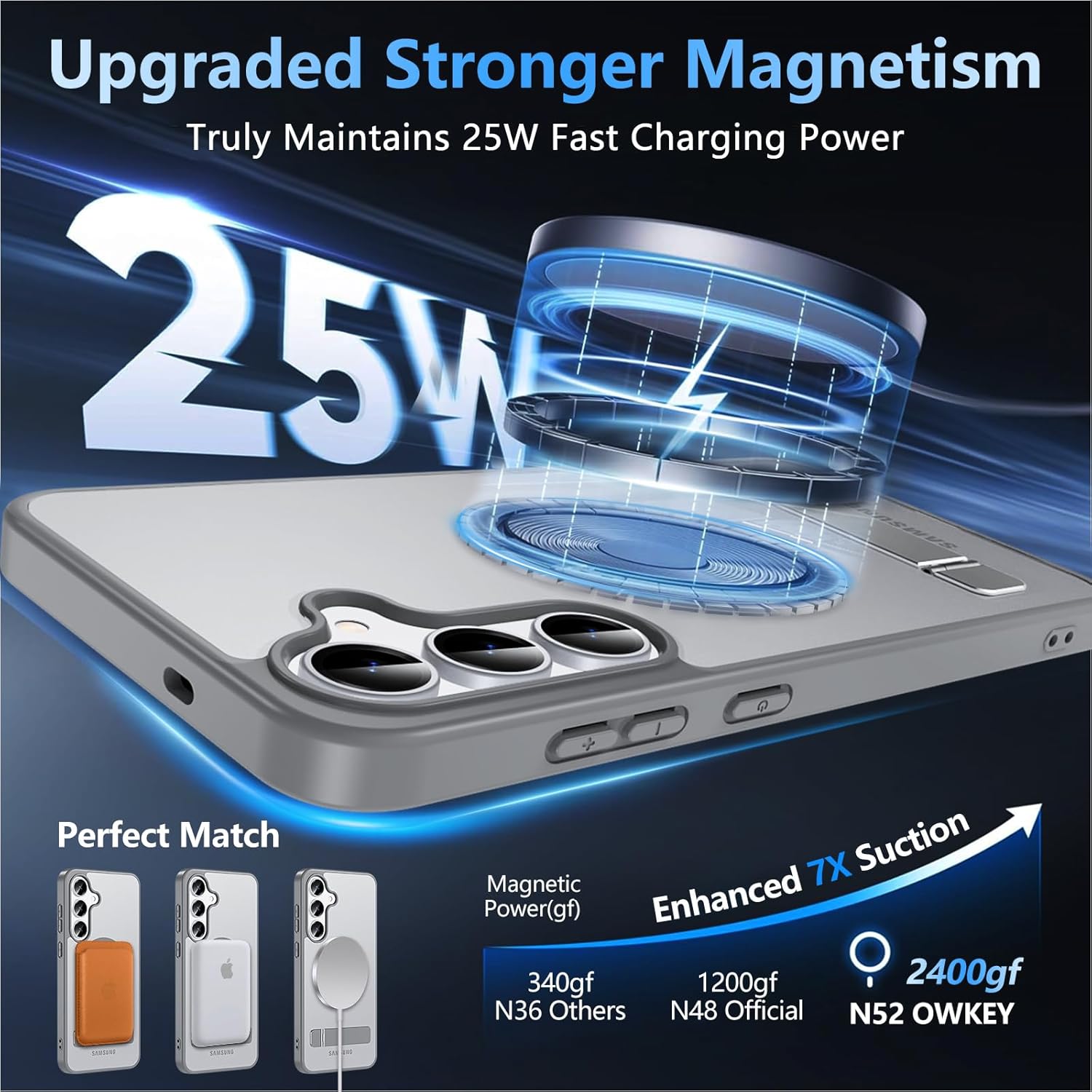 OWKEY Кейс за Samsung Galaxy S25 FE с регулируем държач, съвместим с MagSafe [закалено стъкло], магнитна защита, S25 FE, военен удароустойчив, прозрачен, матов, със стойка, сив