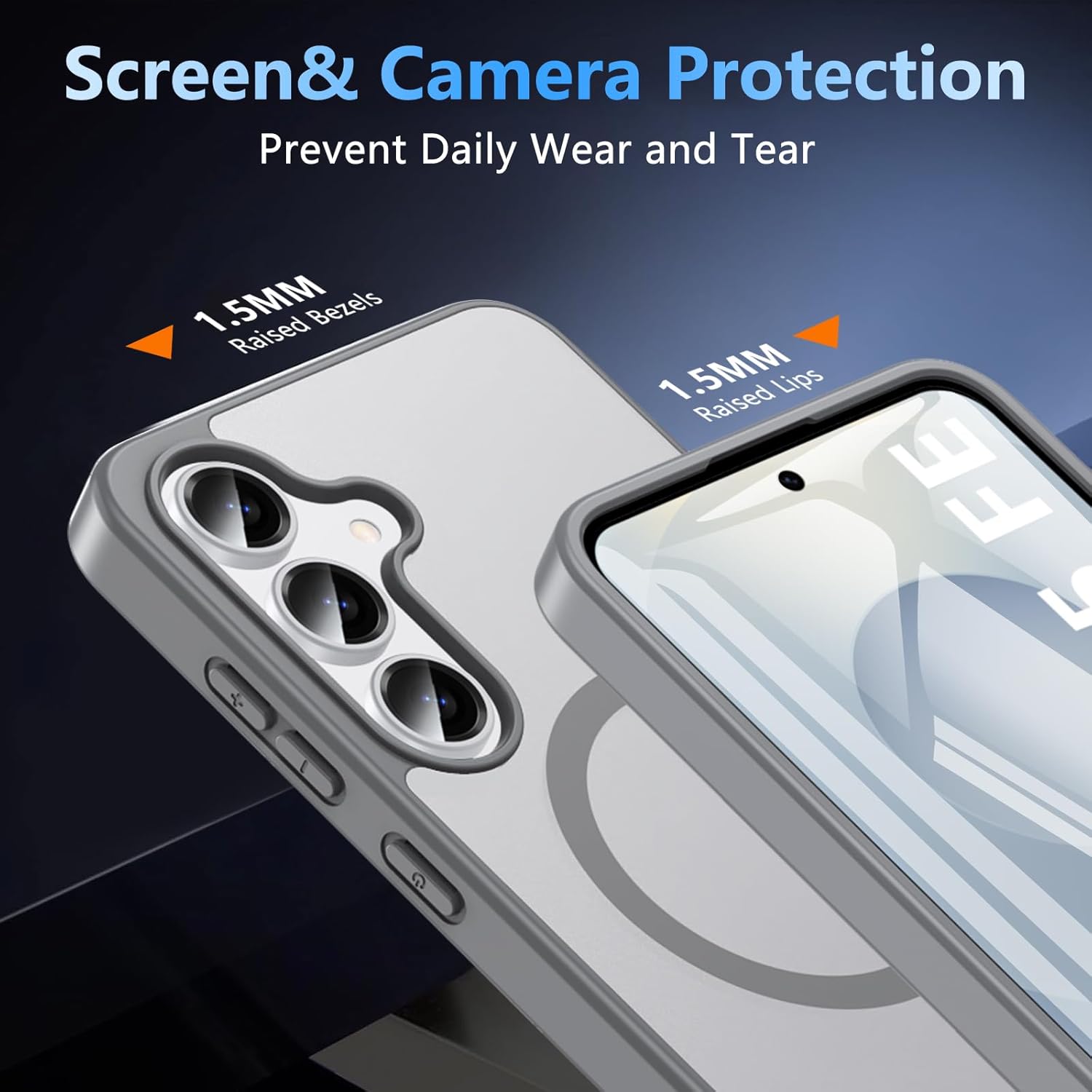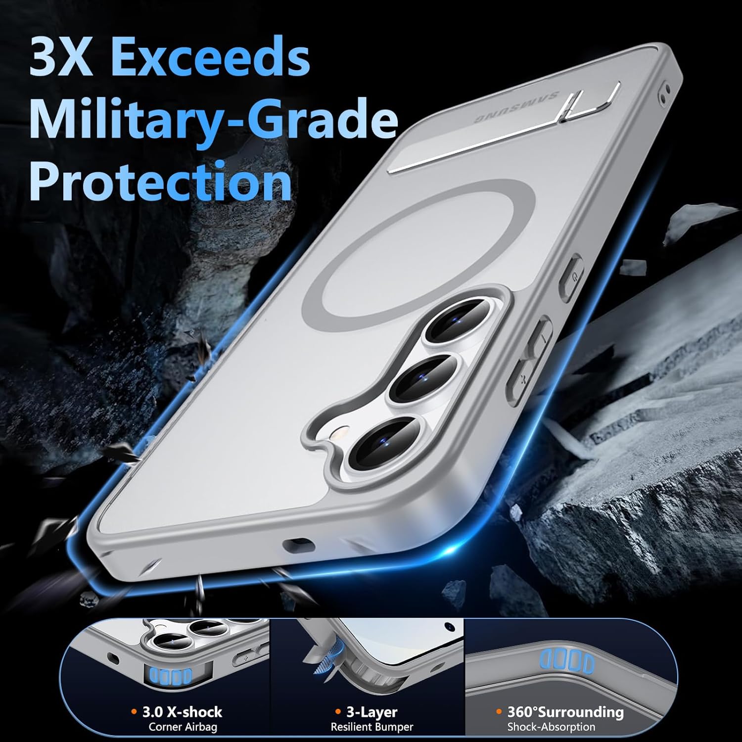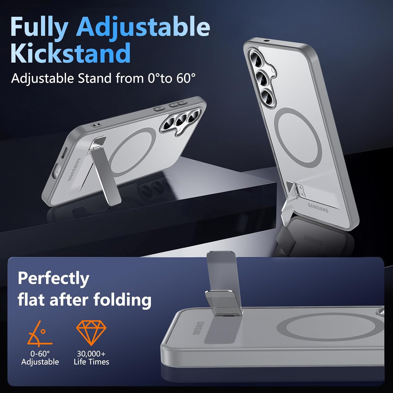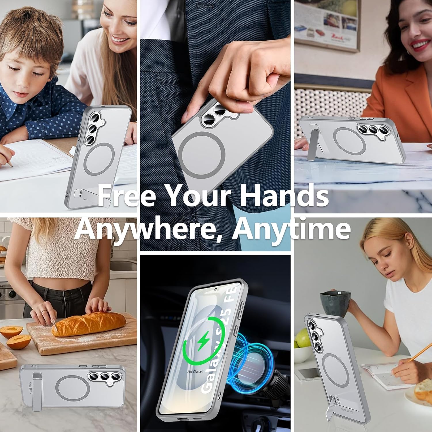 OWKEY Кейс за Samsung Galaxy S25 FE с регулируем държач, съвместим с MagSafe [закалено стъкло], магнитна защита, S25 FE, военен удароустойчив, прозрачен, матов, със стойка, сив