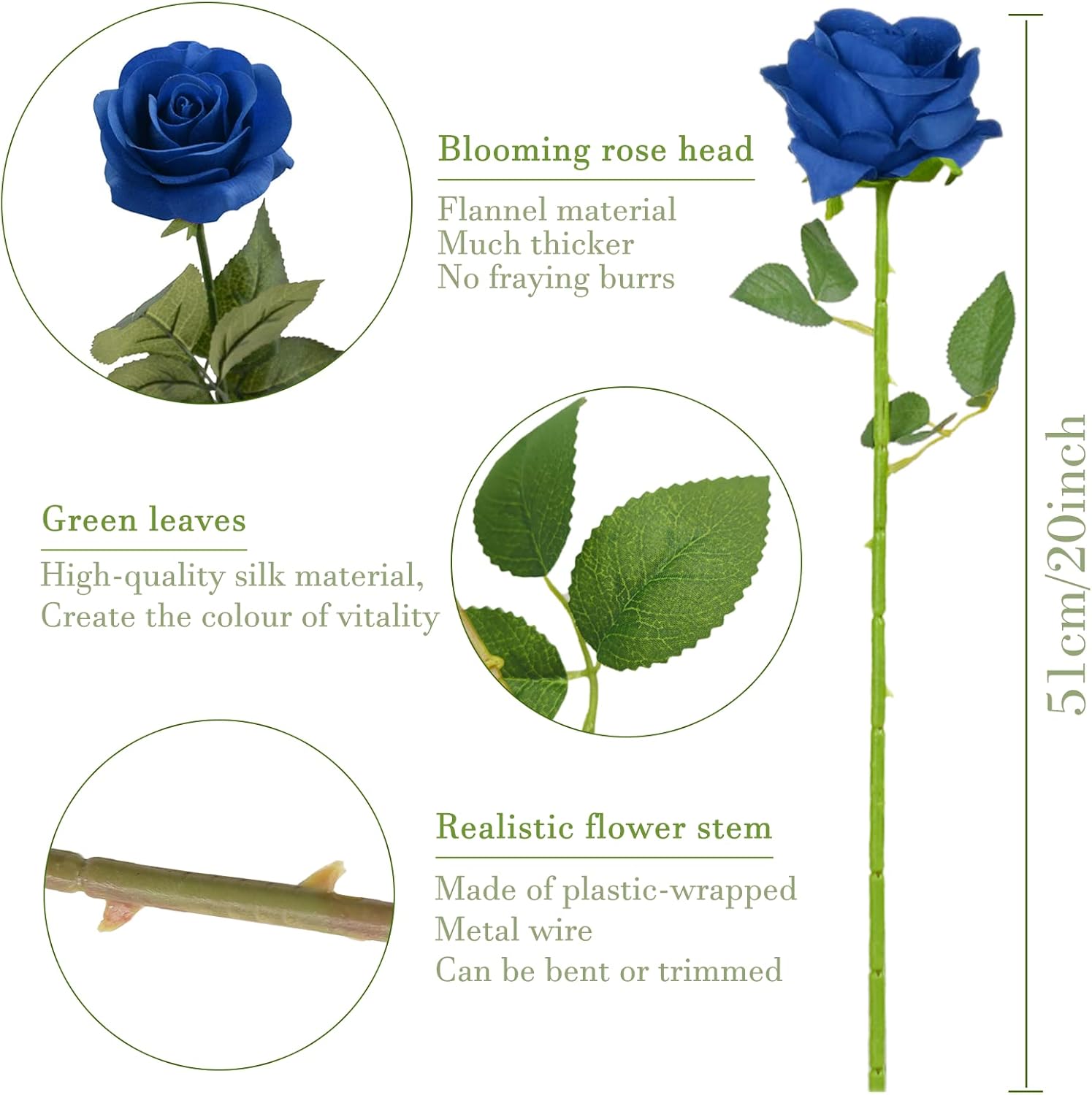 OWLKELA Пакет от 12 сини изкуствени рози, изкуствени фланелени цветя, изкуствени цветя, единични цветя с дълги стъбла, реалистични декоративни цветя за сватба, дом, градина, декорация