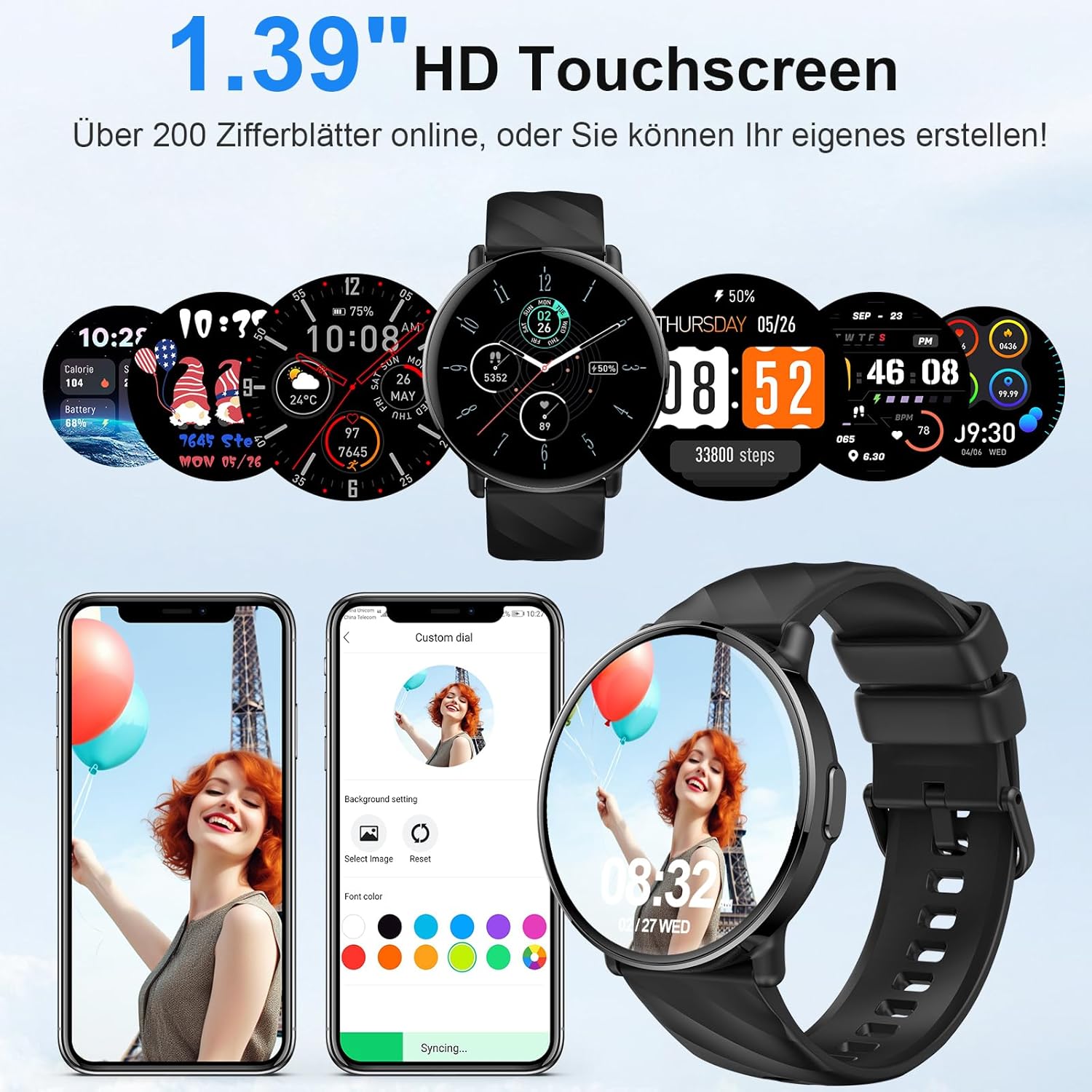 OWMSIC Смарт часовник за мъже и жени 1.39 инча HD сензорен смарт часовник с Bluetooth разговори, 112+ спортни режима, фитнес тракер, SpO2 пулсомер, монитор за сън, броене на крачки, черен