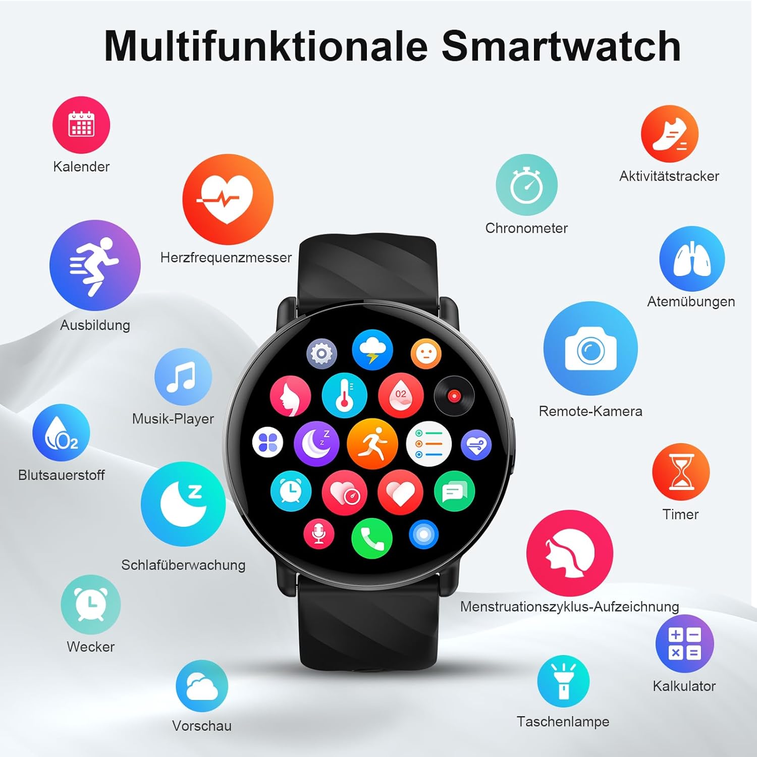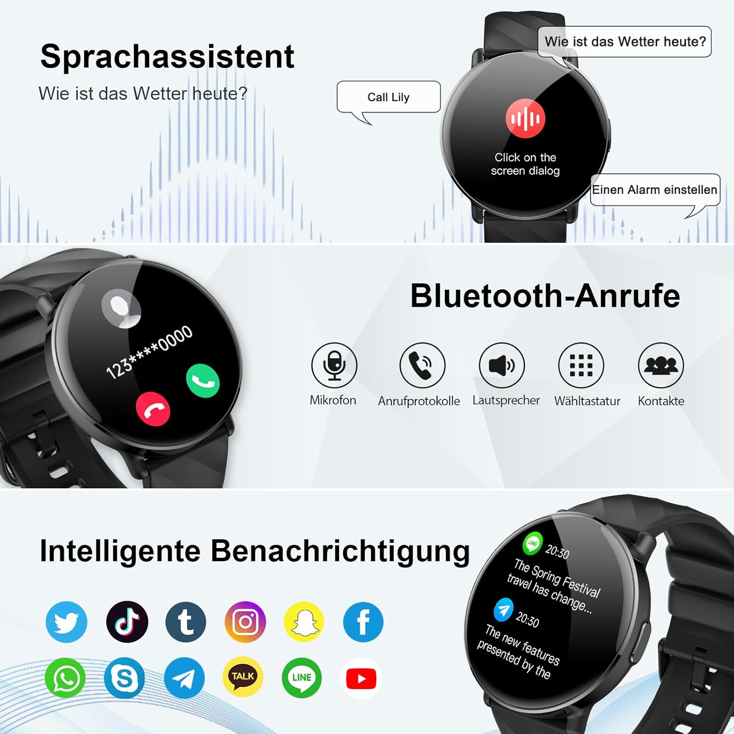 • Bluetooth разговори и напомняне за съобщения: Този смарт часовник за мъже и жени използва Bluetooth 5.4 и има вграден HD микрофон и високоговорител. Просто свържете смартфона си чрез Bluetooth, за да осъществявате и отговаряте на разговори директно чрез смарт часовника и да съхранявате до 50 контакта. Също така получавате известия от платформи като SMS, Facebook, WhatsApp, Instagram и др. Така винаги ще имате цялата важна информация под ръка.