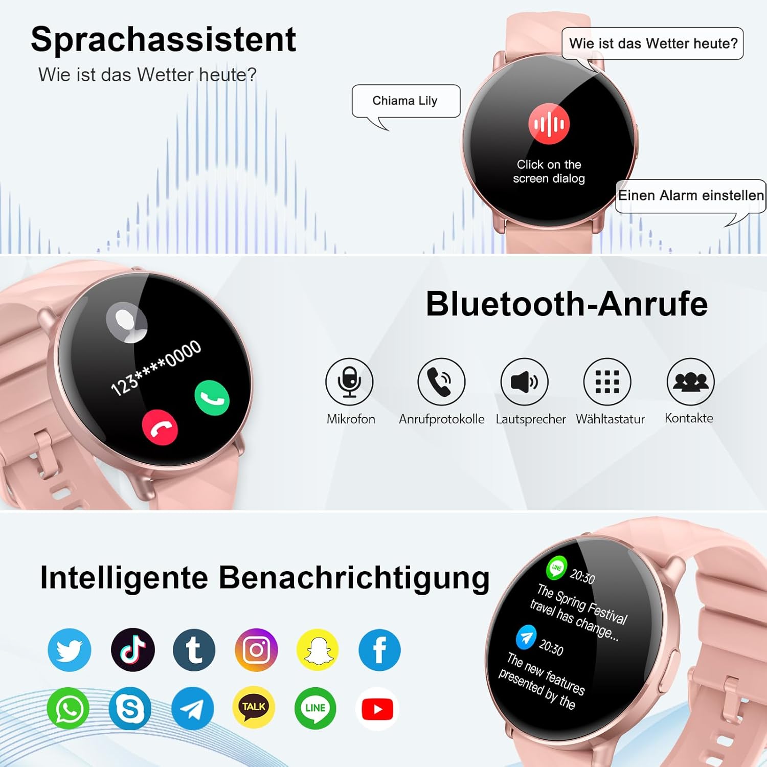• Bluetooth разговори и напомняне за съобщения: Този смарт часовник за мъже и жени използва Bluetooth 5.4 и има вграден HD микрофон и високоговорител. Просто свържете смартфона си чрез Bluetooth, за да осъществявате и отговаряте на разговори директно чрез смарт часовника и да съхранявате до 50 контакта. Също така получавате известия от платформи като SMS, Facebook, WhatsApp, Instagram и др. Така винаги ще имате цялата важна информация под ръка.