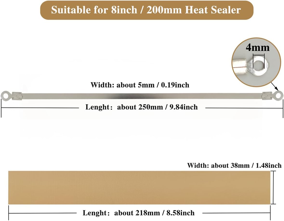 Пакетът включва: 10 нагревателни елемента и 10 парчета термоустойчива тефлонова тъкан, както и термоустойчива тефлонова лента от 5 м (ширина 38 мм. Може да се отреже на желаната дължина), което е достатъчно, за да отговори на вашите дългосрочни нужди.