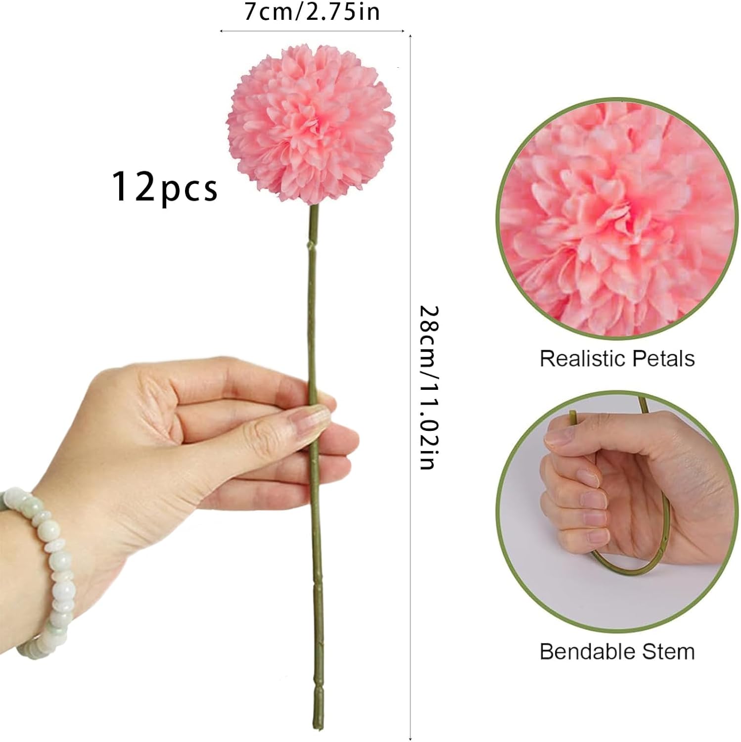 • Информация за опаковката: изкуствени цветя и растения. Съдържа 12 хризантеми, отделните стъбла са високи приблизително 28 см, а цветните главички имат диаметър приблизително 7 см. Стъблата могат да се огъват и режат по желание, което ги прави подходящи за букети „Направи си сам“ и добавят текстура към всеки класически дизайн на букет.