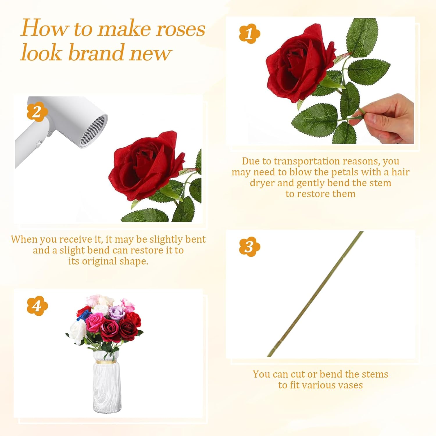 • Елегантни и романтични: изкуствените листа на цветята имат прозрачна текстура, клонките са изработени от пластмаса, а в корена е поставена метална тел, която можете да огънете или отрежете, ако е необходимо. Цветните главички са топли и плътни, а копринените цветя, като истински, предлагат много възможности, можете да избирате от разнообразие от цветове и стилове, за да отговорите на вашите различни естетически изисквания и стилове на декорация.
