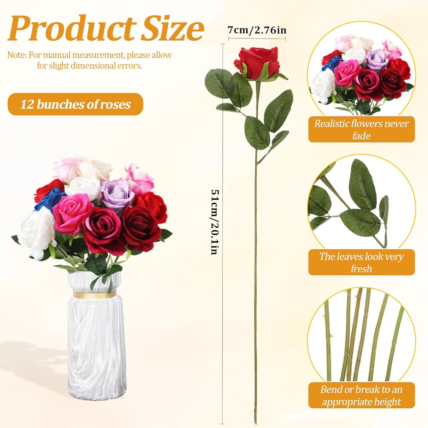 • Реалистична артистична красота: тези изкуствени рози впечатляват с изящната си изработка и реалистичен външен вид, изкуствено цвете. Всяко венчелистче е внимателно обработено и има деликатен щрих, независимо дали става въпрос за текстурата на венчелистчетата или за прехода на цветовете. Като с истинските рози, можете да усетите романтиката и красотата на природата у дома.