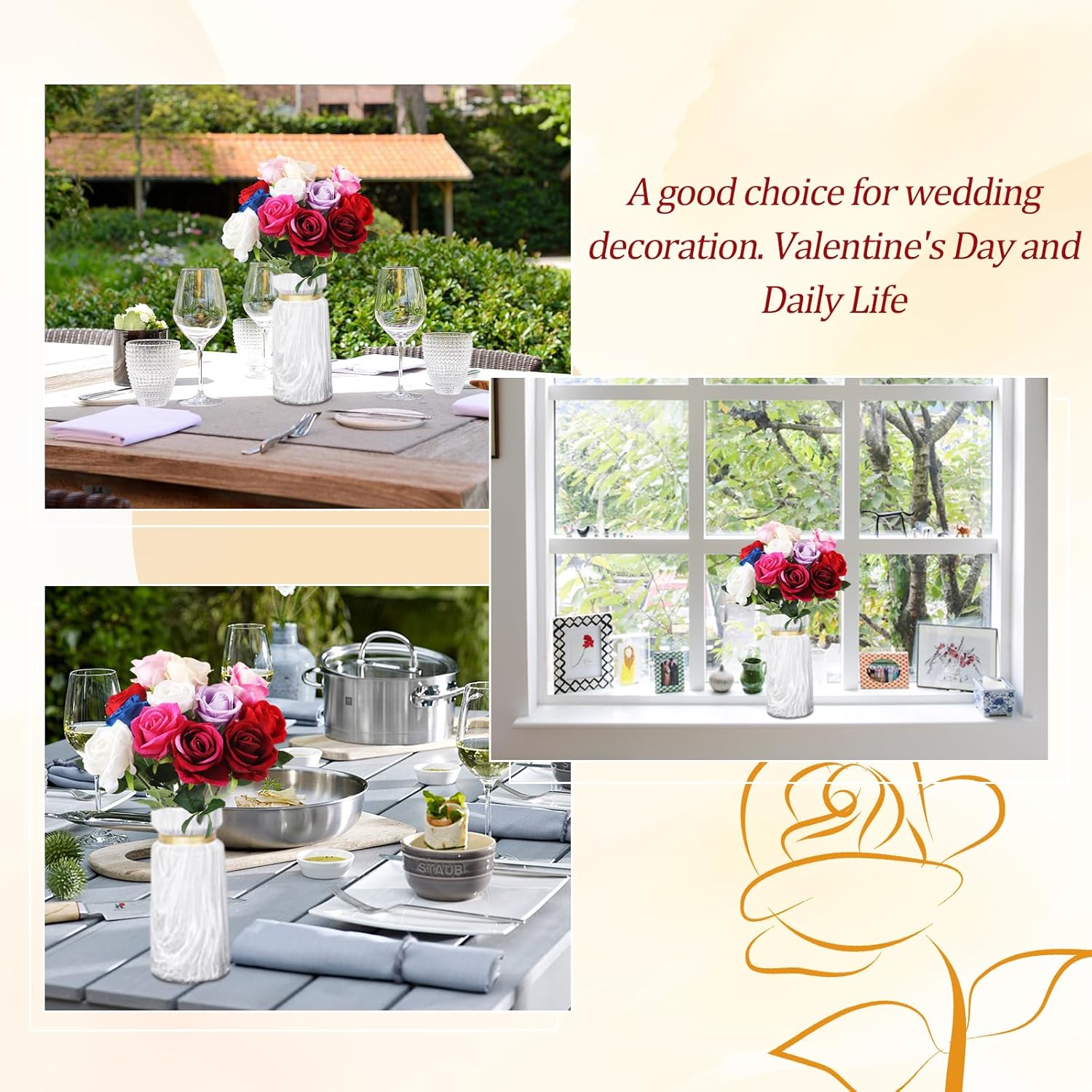 • Дълготраен чар: за разлика от свежите рози, нашите изкуствени цветя никога не избледняват като истинските, не са обвързани със сезони и време и винаги запазват нежния си вид, независимо дали са като декорация за дома, сватбена украса или като подарък. В сравнение с високата цена и краткото време на цъфтеж на истинските цветя, нашите изкуствени цветя са изключително рентабилни.