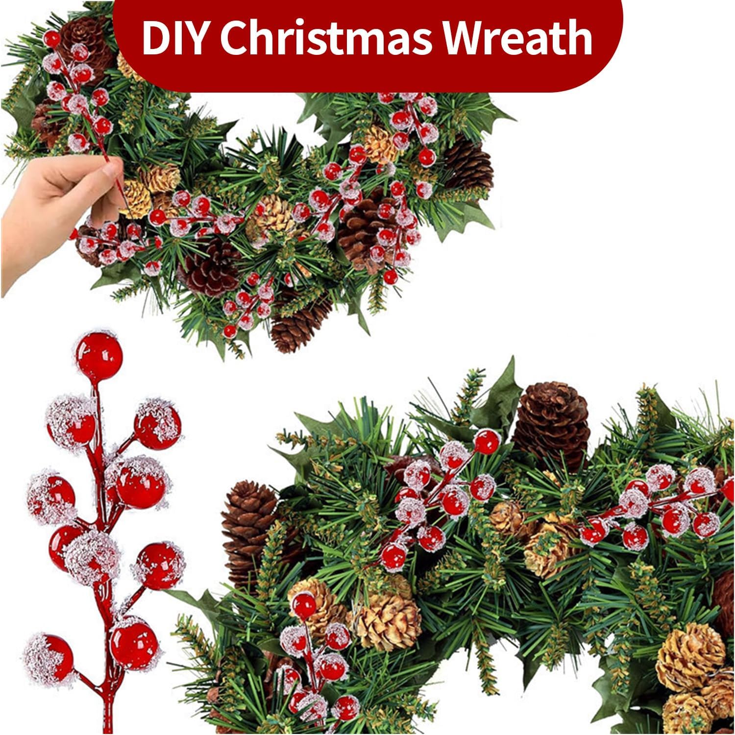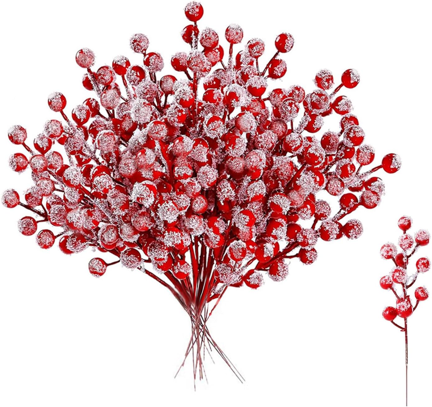 Ще получите 16 изкуствени клонки от горски плодове. Тези клонки са украсени с яркочервени плодове и нежни снежинки, идеални за коледна украса.