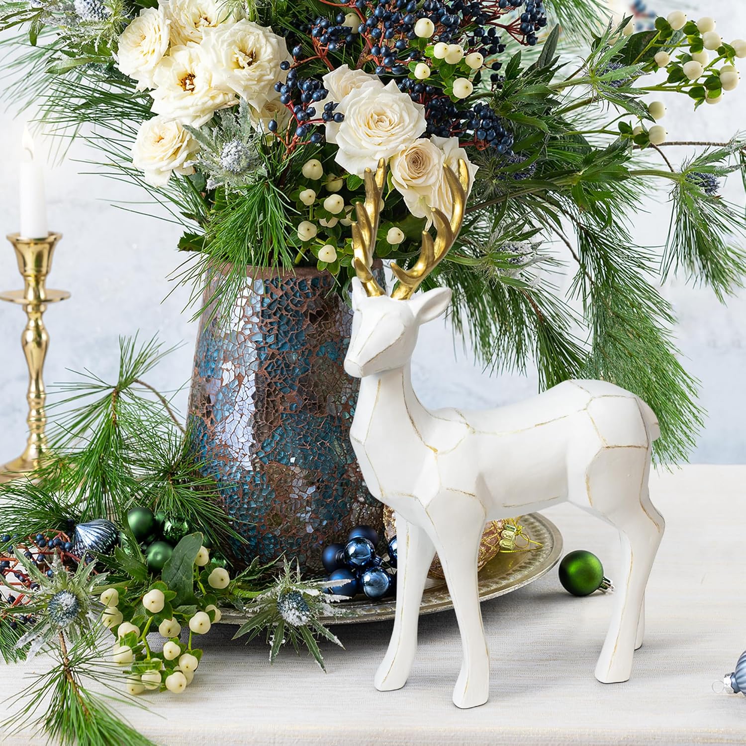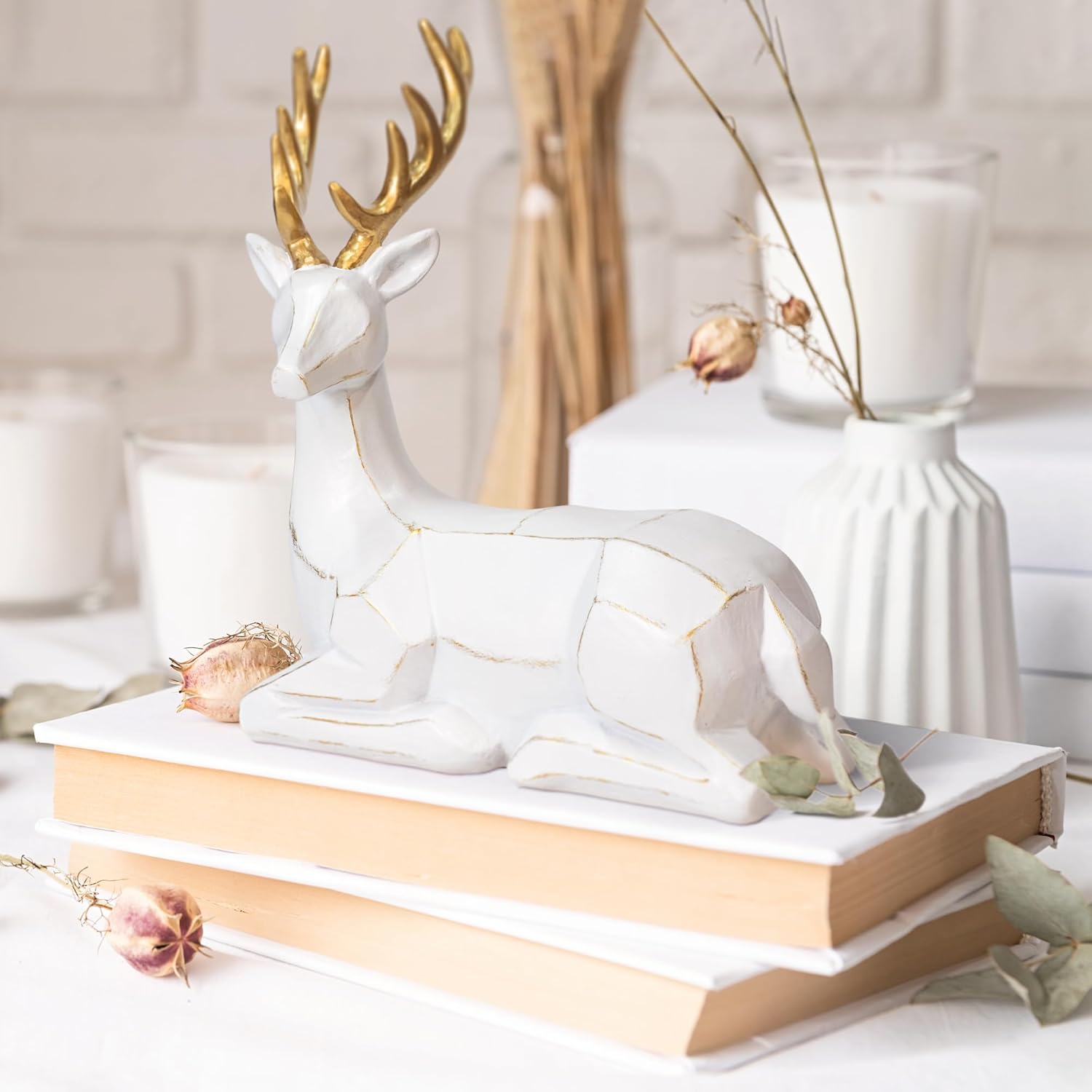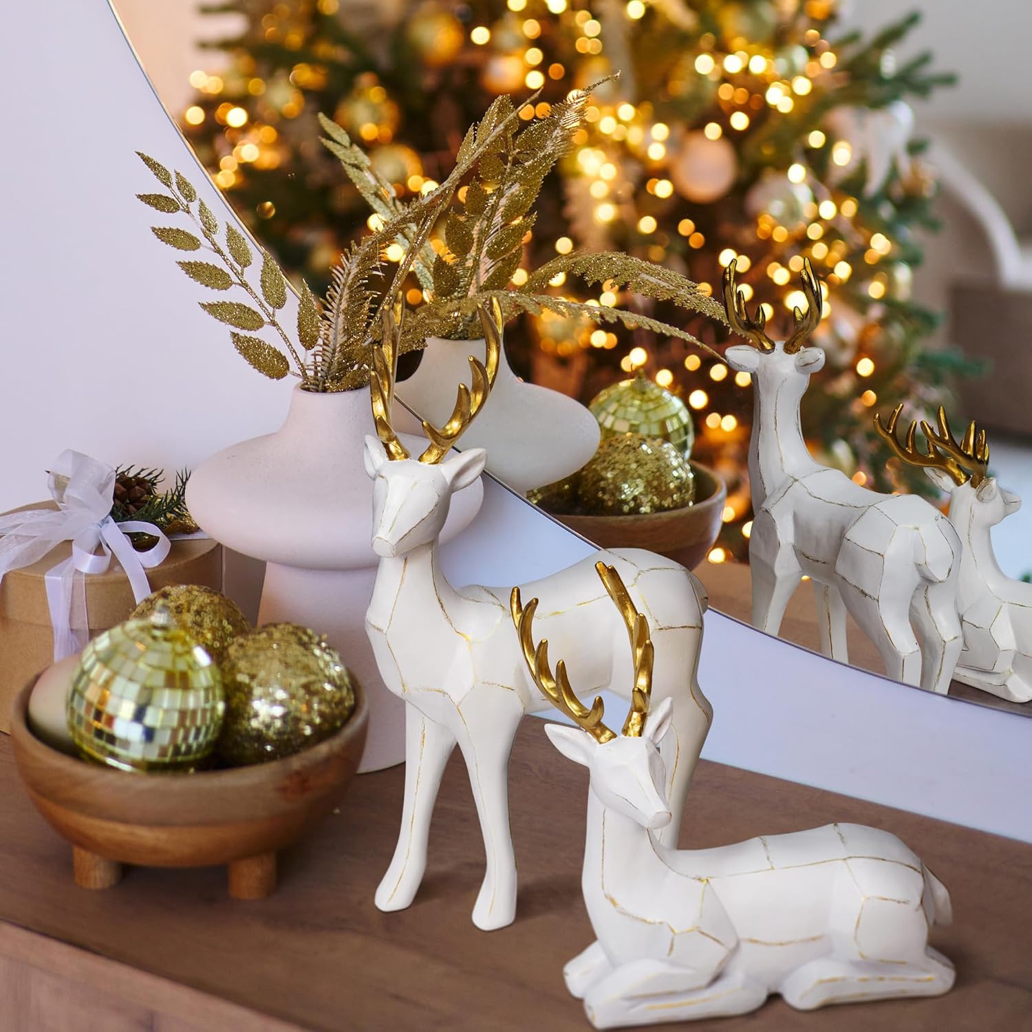 Пакет от 2 фигурки на животни от елени, скулптури, статуи, декоративна фигурка, голяма 20/30 см, фигурка на декоративен елен, коледна украса, елен, изработен от смола (бял)