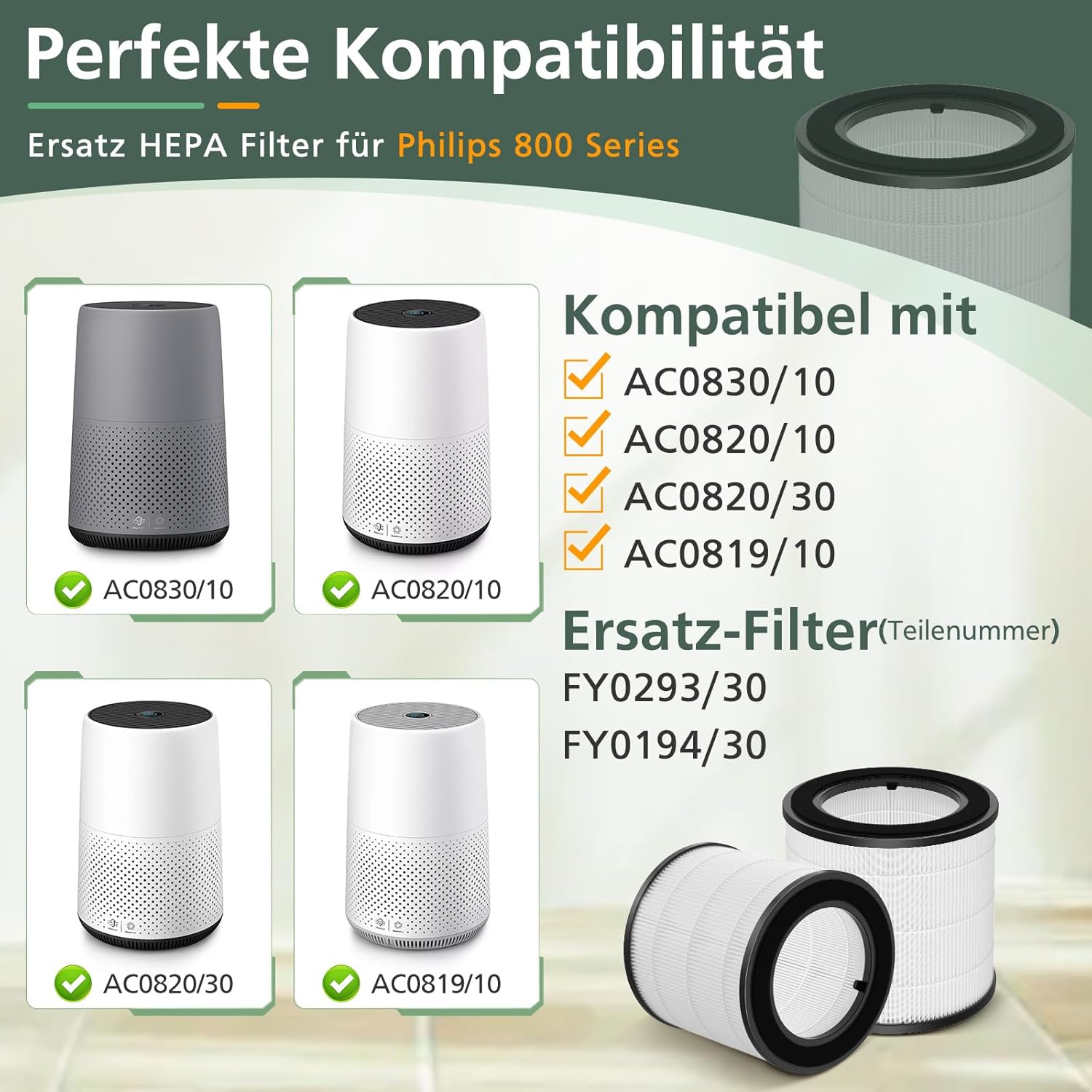 • Комплектът включва: 2 x HEPA филтъра. Подходящ за пречиствател на въздух Philips AC0830/10 AC0820/30 AC0820/10 AC0819/10 серия 800. (Моля, потвърдете модела на вашия пречиствател на въздух преди покупка).