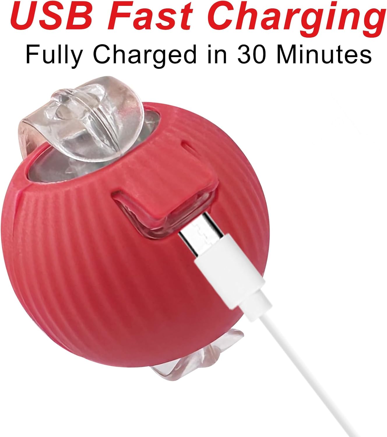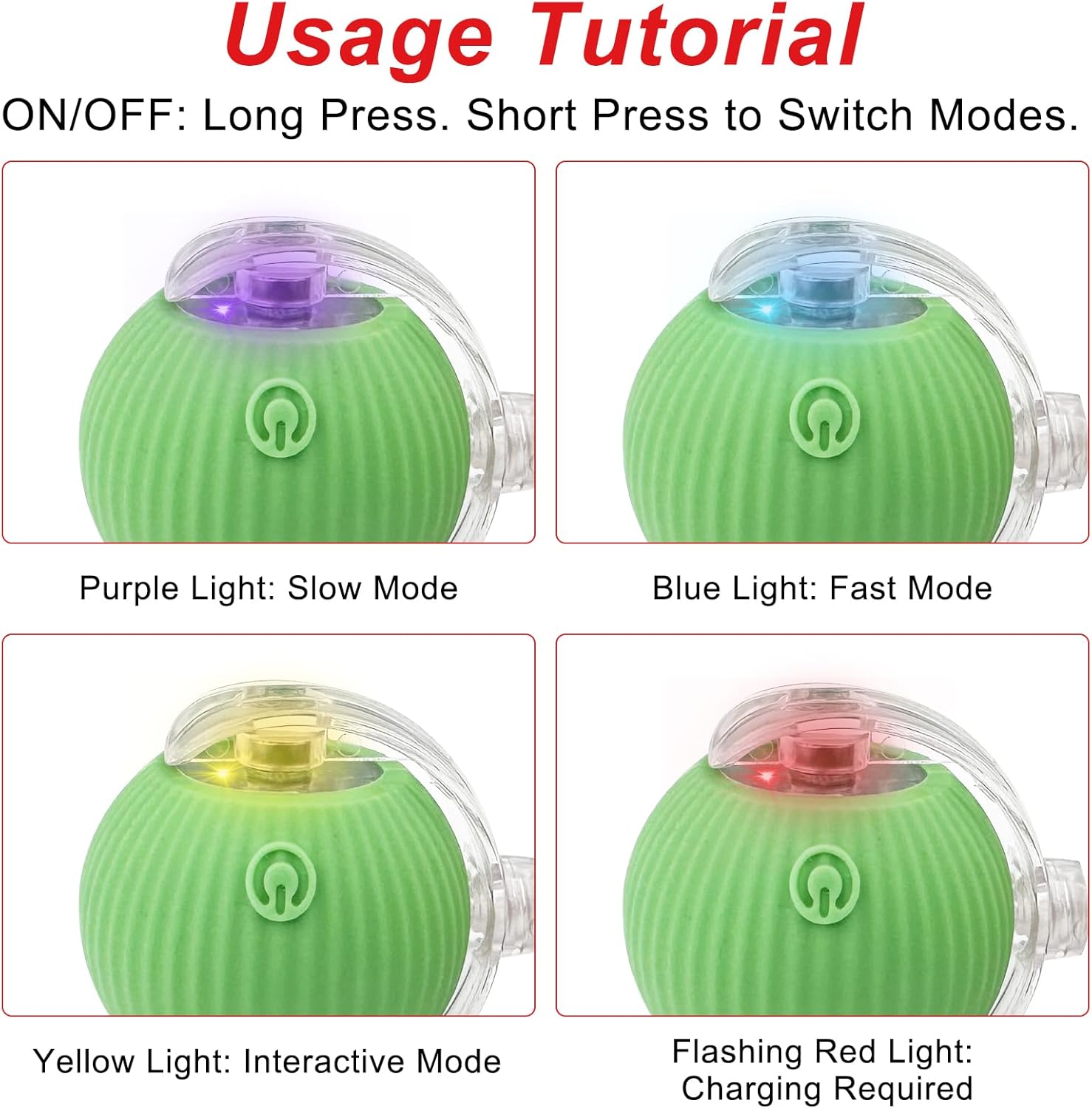 • 【Устройство за игра с домашен любимец】Ще получите червена топка, зелена топка и два кабела за данни. Топката преминава в режим на заспиване след 5 минути неактивност и се изключва автоматично след 30 минути. Веднага щом вашият домашен любимец я докосне, умната топка ще се рестартира и ще си играе с него. Забележка: За да избегнете прекомерен шум и драскотини по пода, препоръчваме да използвате този продукт върху килим или мека постелка.