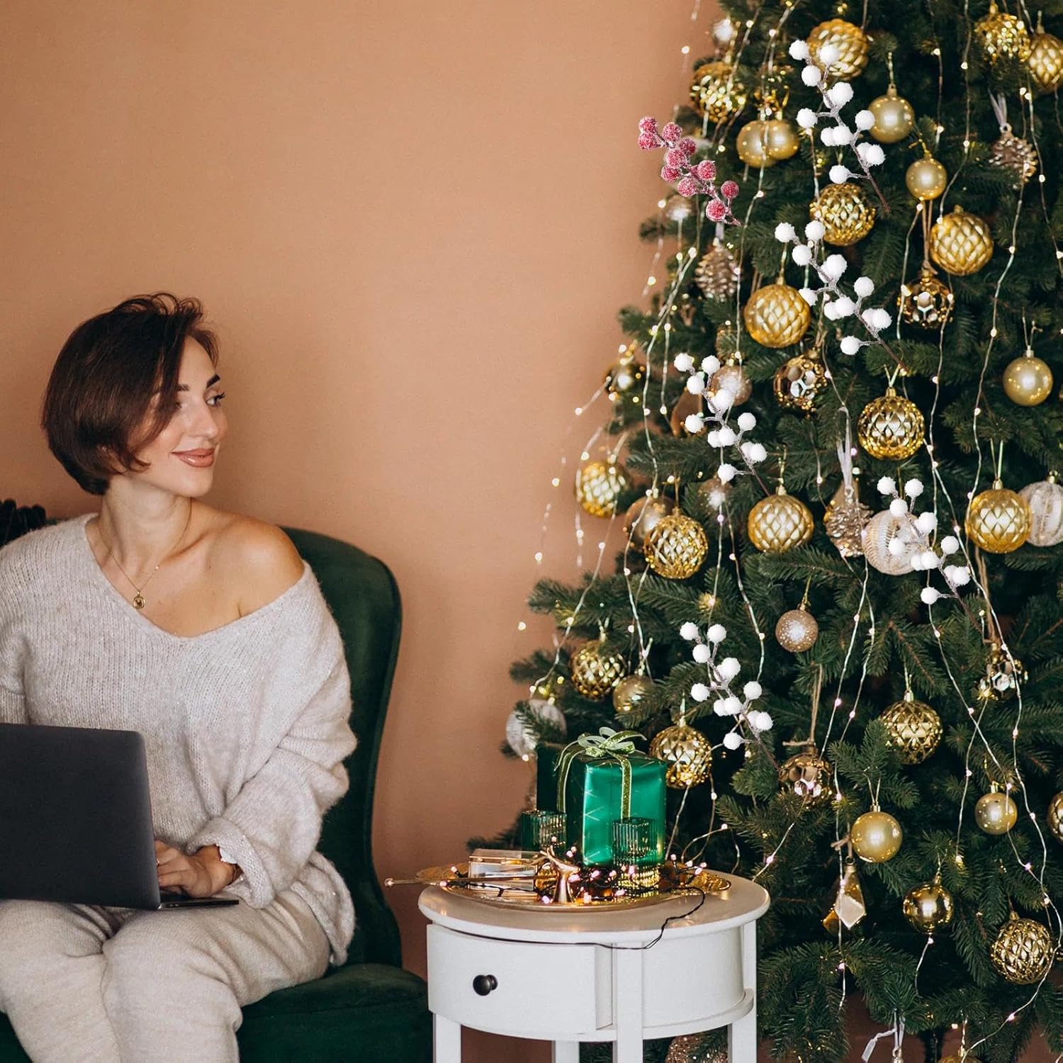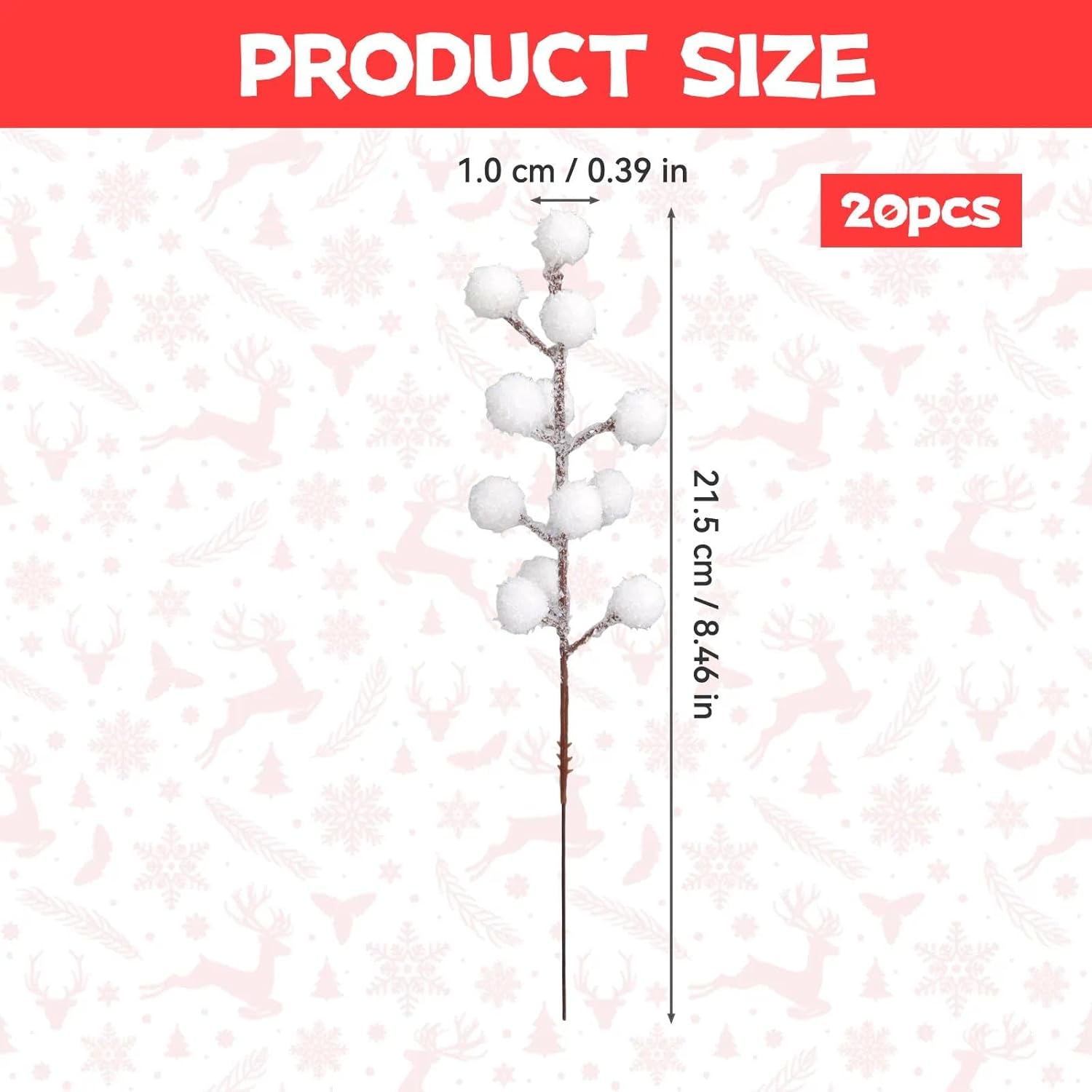 Съдържание на кутията: ще получите 20 клонки с бели горски плодове (22 см всяка). Превърнете мигновено венци или коледни елхи в блестящи произведения на изкуството с тези изкуствени клонки.