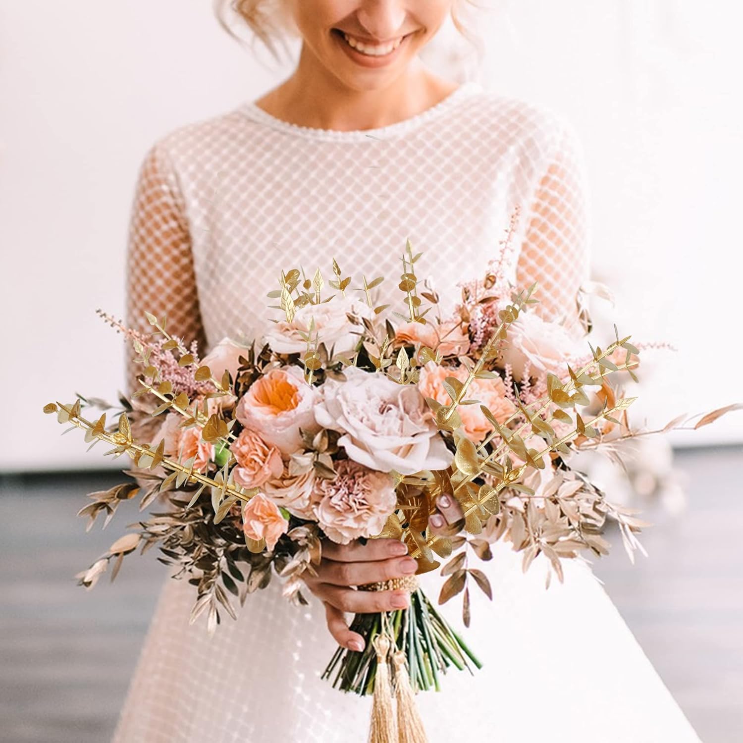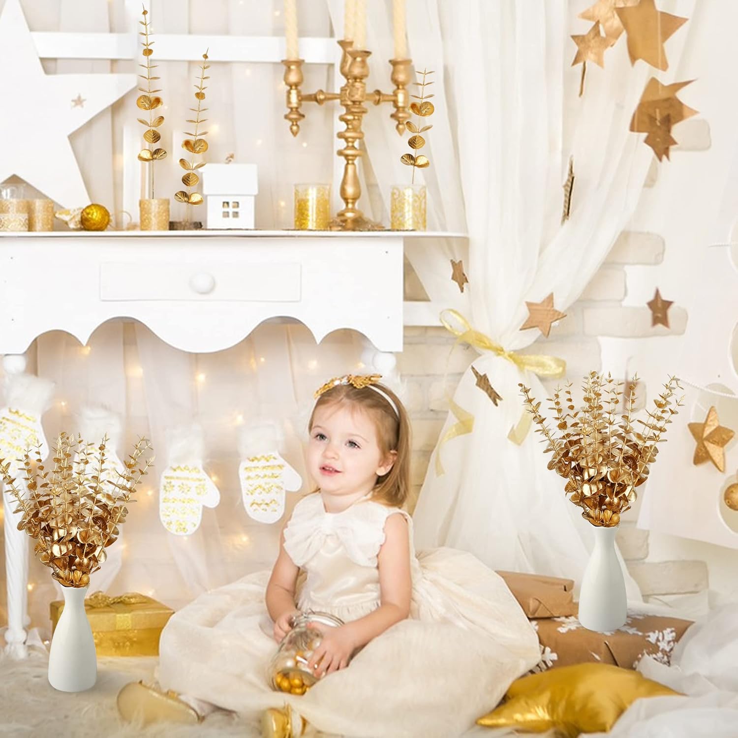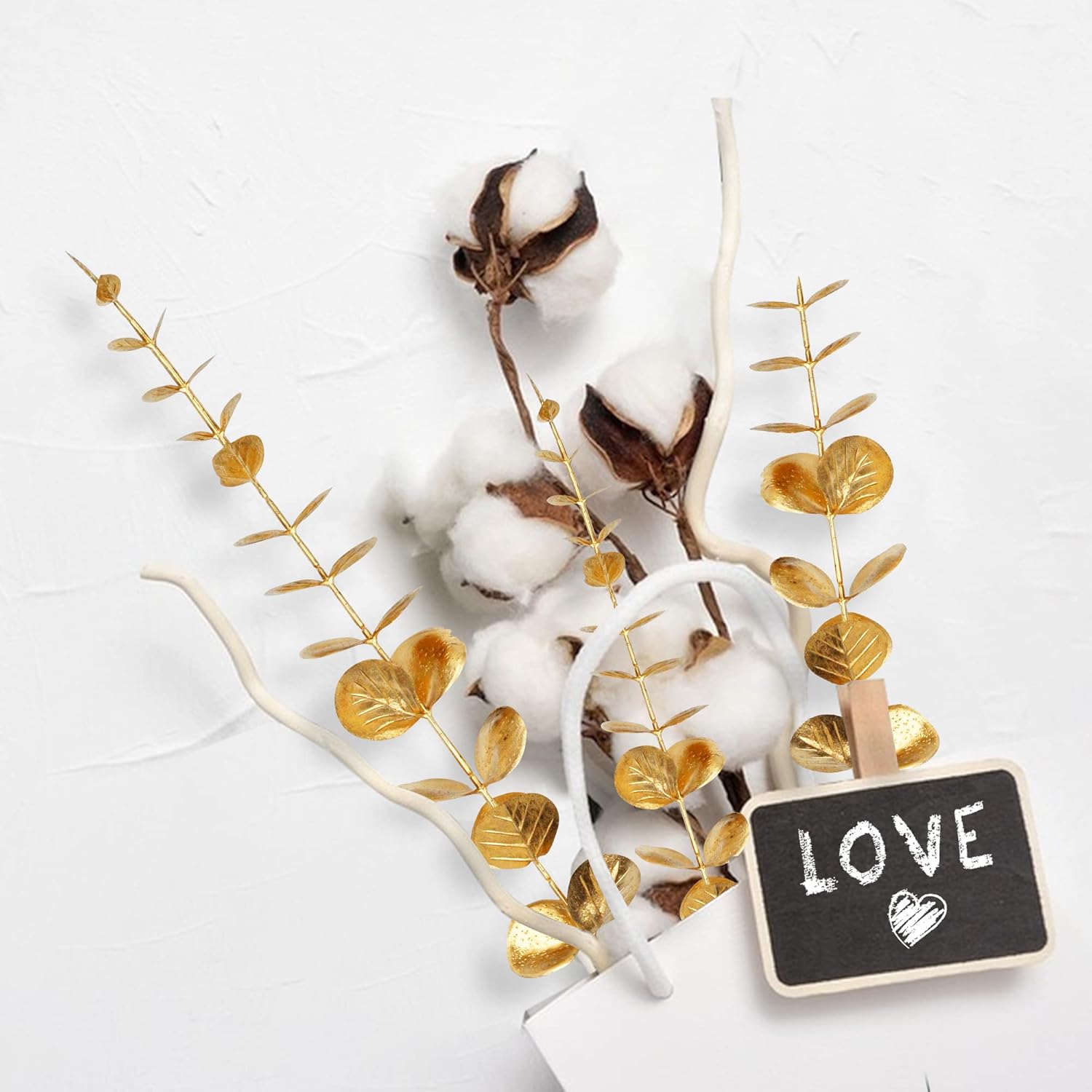 Пакет от 20 изкуствени евкалиптови клонки, златни евкалиптови растения, декорация, евкалиптови стъбла, изкуствени растения, изкуствени евкалиптови дървета, сребърен долар, фалшиво растение за декорация на маса, парти, коледна украса.