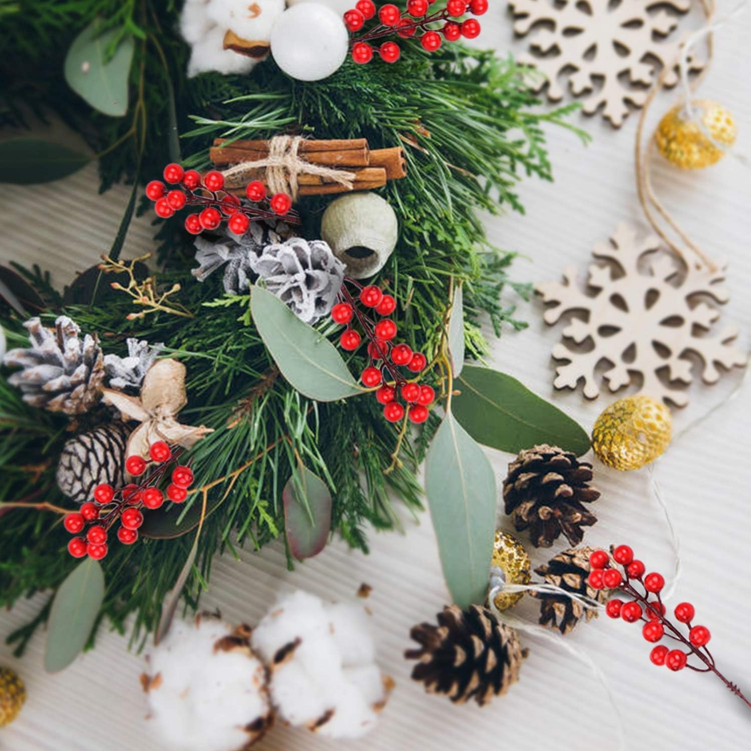 • Подходящи за „Направи си сам“: коледни цветни стъбла за аранжировки, дизайн на венци „Направи си сам“, стайни фенери или кошници, добавете ги към вашата елха, за да постигнете рустикален селски вид, стъблото е с тел за лесна работа.