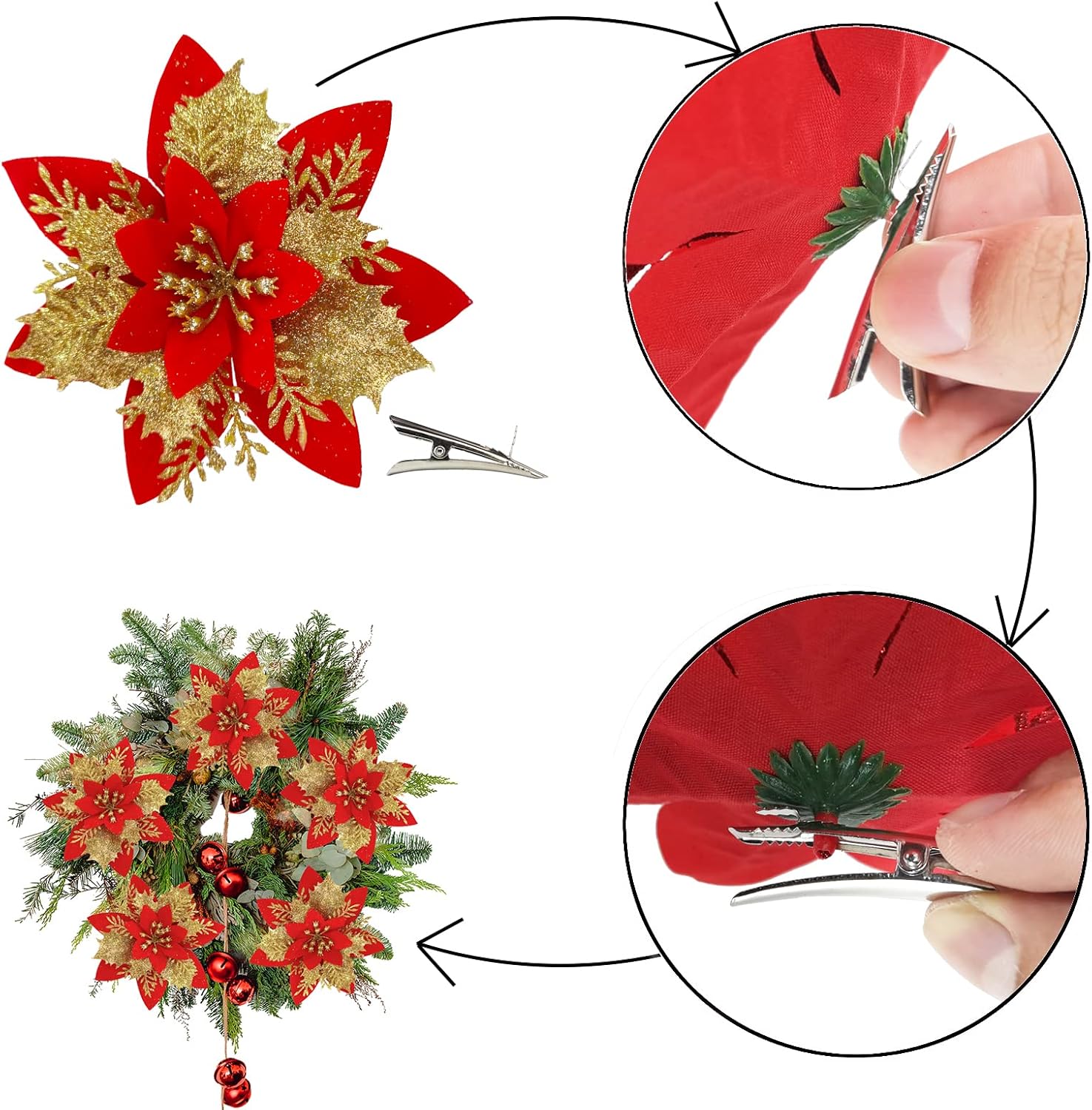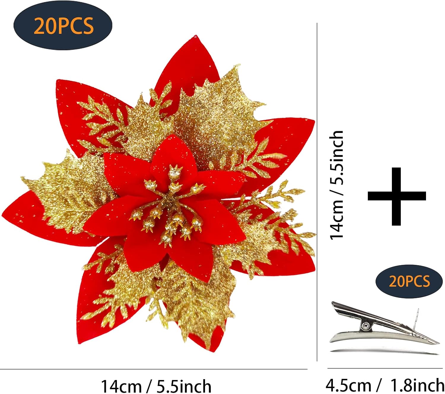 • ЛЕСНО ЗА ДЕКОРИРАНЕ Предлагаме 20 броя щипки с размер 1,77 инча, които са по-големи и по-лесни за декориране с изкуствени коледни цветя. Поставете основата на цветето в горната част на щипката. Можете да декорирате изкуствените коледни цветя навсякъде, както желаете. Не се притеснявайте за намирането на аксесоари.