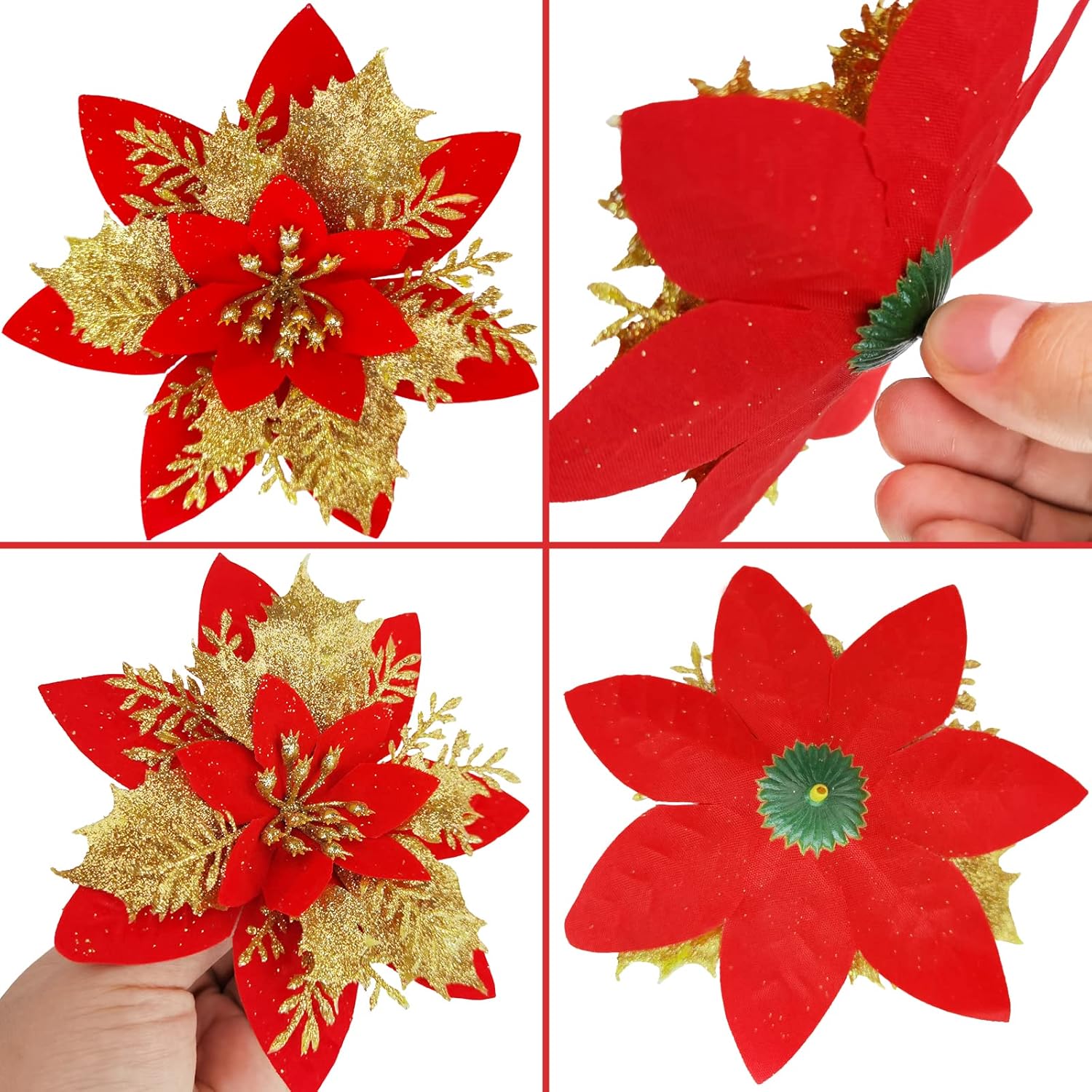 • Здрав материал: коледните цветя са изработени от коприна и здрава пластмаса и са покрити с красив брокат на прах. Тези зашеметяващи орнаменти ще украсят вашата луксозна коледна елха.