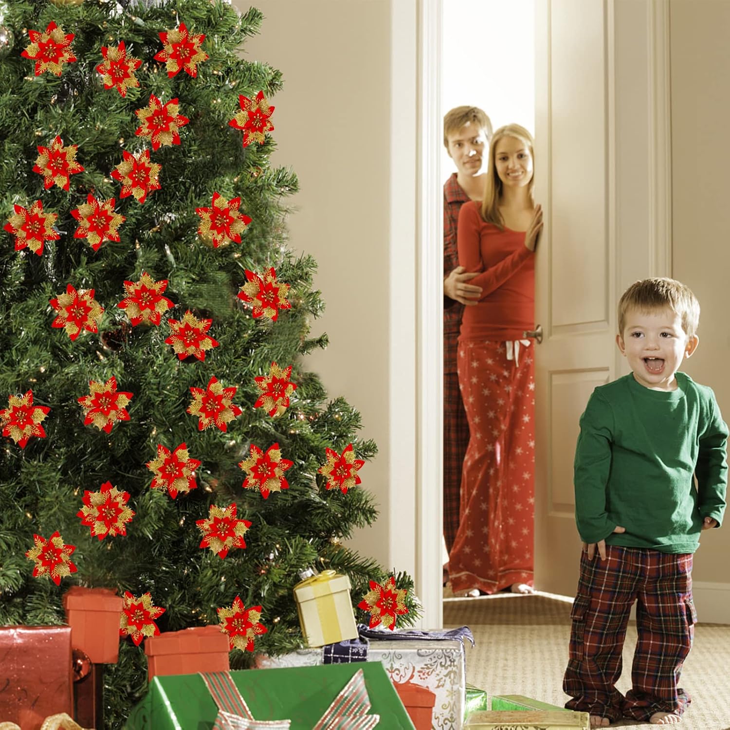 • Подходящи поводи: изкуствени коледни цветя с брокат могат да украсят коледна елха, гирлянд, коледен венец и завеса. Те могат да се използват не само за Коледа, но и за Нова година, сватба, рожден ден, парти или други празнични декорации. Те ще акцентират върху вашето парти и ще направят вас и вашето семейство по-радостни, за да се насладите на празника.