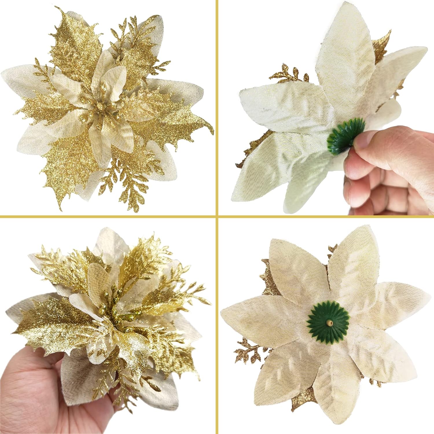 • Здрав материал: коледните цветя са изработени от коприна и здрава пластмаса и са покрити с красив брокат на прах. Тези зашеметяващи орнаменти ще украсят вашата луксозна коледна елха.