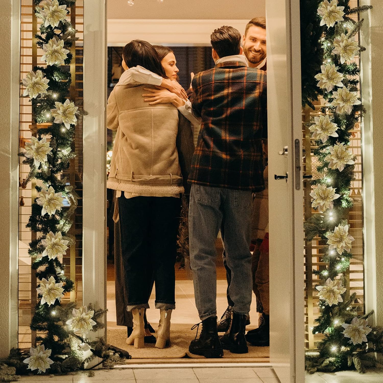 • СУПЕР БЛЕСТЯЩИ Коледните цветя Mikaile покриват брокатените частици на всяко цвете, което изглежда супер ярко, прави вашата Коледа по-ослепителна и празничната атмосфера по-силна. За да изглежда по-естествено, брокатената пудра не е силно фиксирана. Нормално е брокатената пудра да пада леко. Преди употреба можете леко да разклатите излишната пудра.